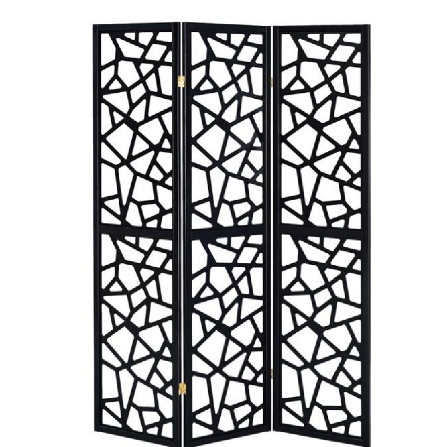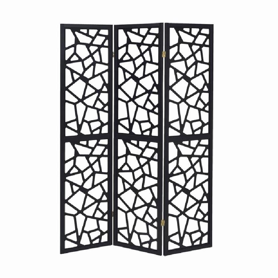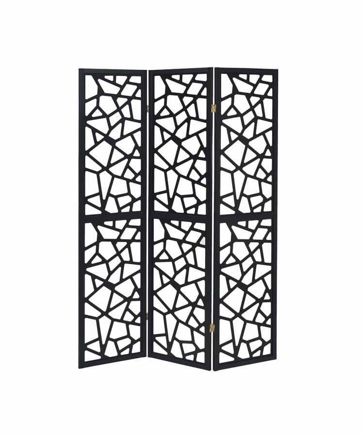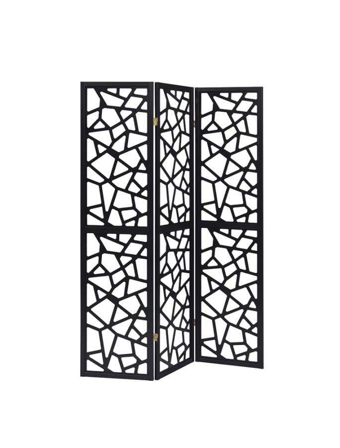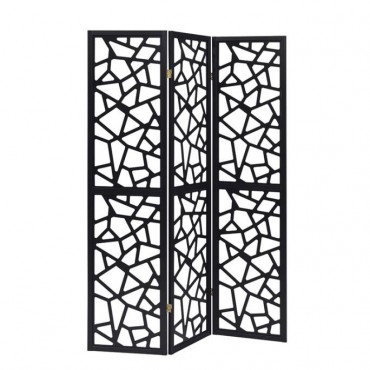 Make a bold statement in any space with this 3-panel room divider, featuring an eye-catching mosaic cutout pattern that enhances modern and mid-century décor. The sleek black finish creates a striking contrast, while the open geometric design allows light to pass through, maintaining an airy and spacious feel. Crafted with a durable solid wood frame, this partition is perfect for separating spaces, adding privacy, or serving as a decorative accent. Its folding trifold design offers versatility, making it easy to reposition as needed.