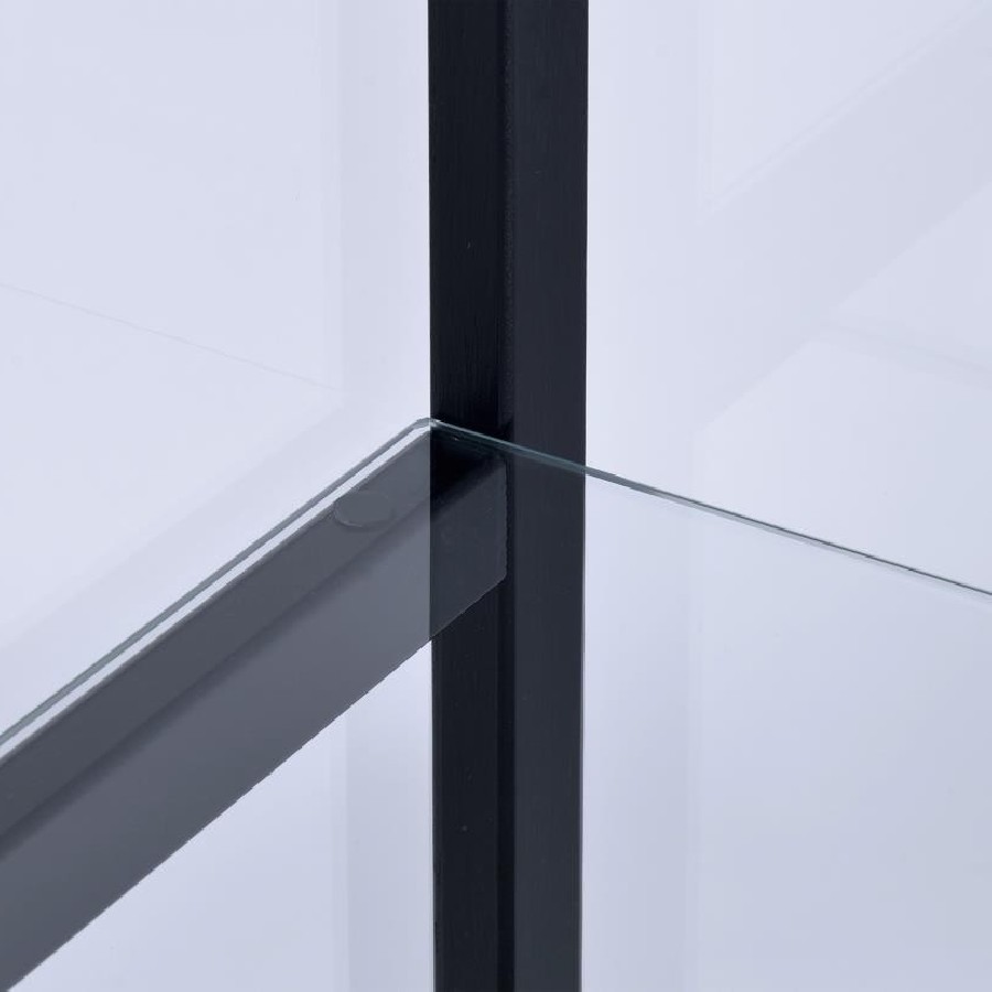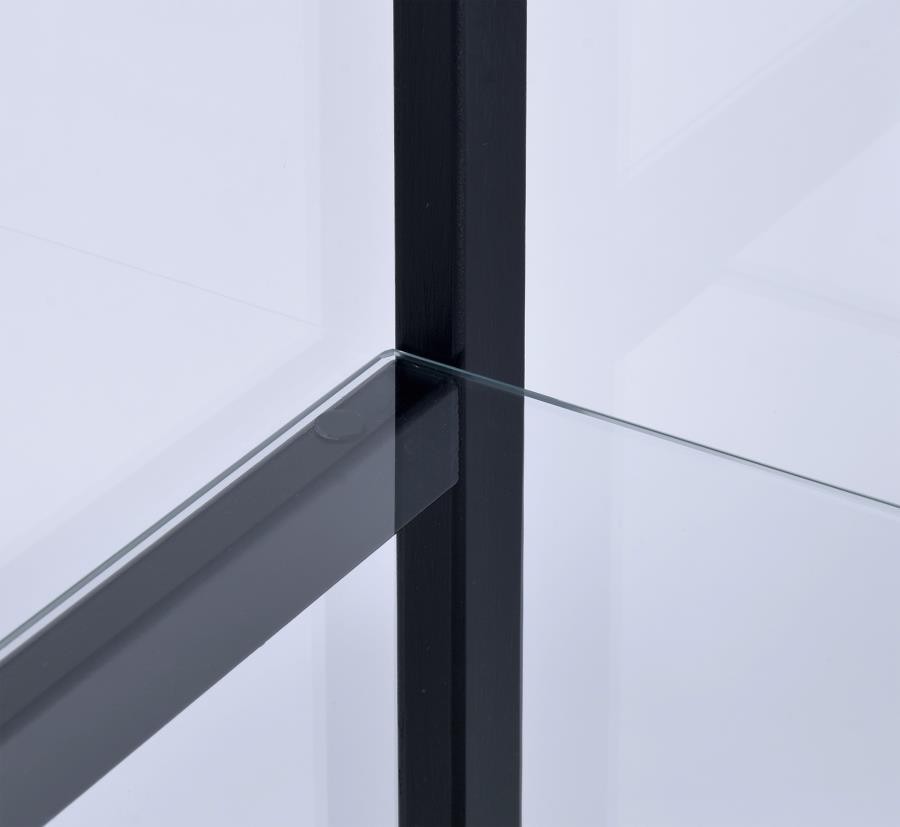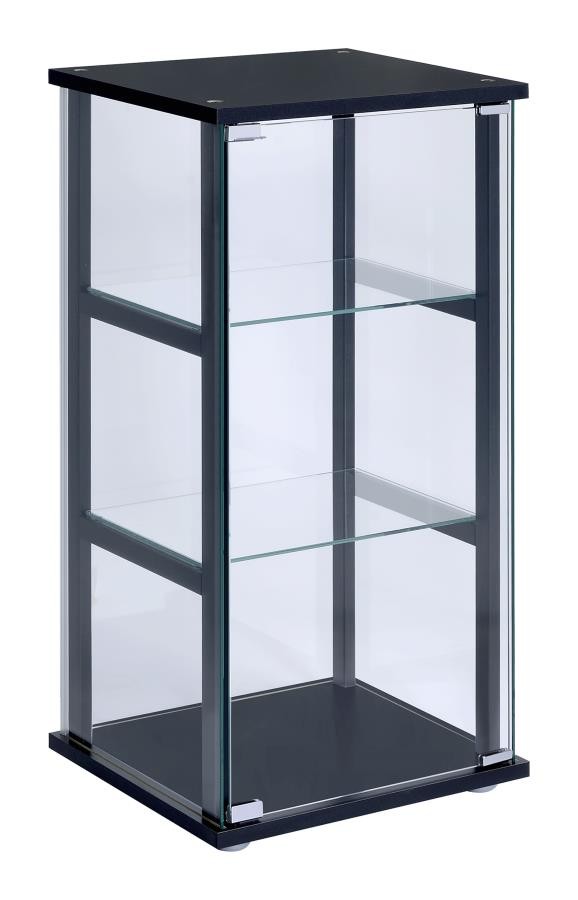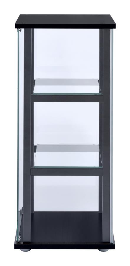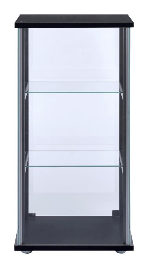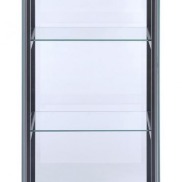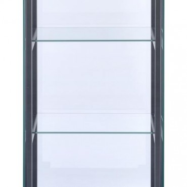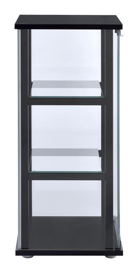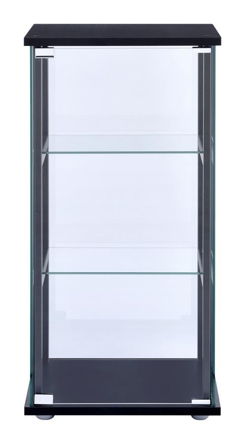 A modern version of a true classic makes a fabulous addition to a transitional space. With linear styling and a fresh look, this curio cabinet offers a perfect venue for showcasing treasured decor. Bold black tops a simple frame, top, and base. Tempered glass shelves create transparent space for display. Access its interior easily with push-to-open doors.