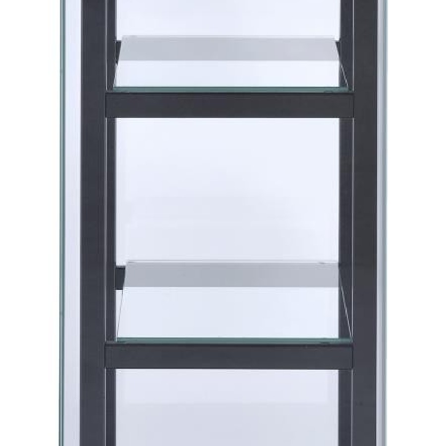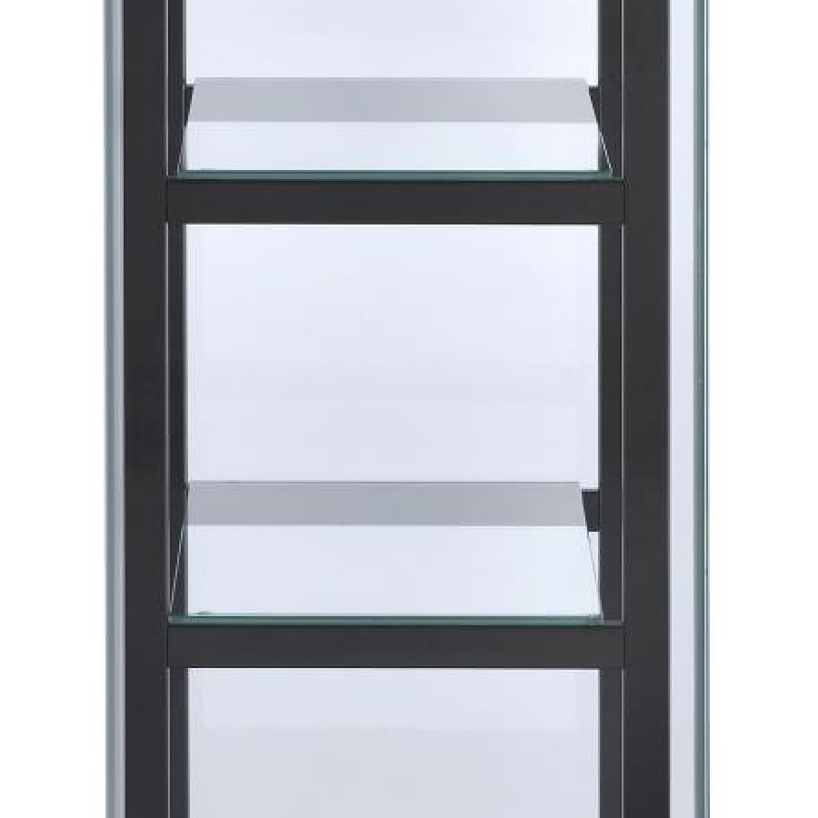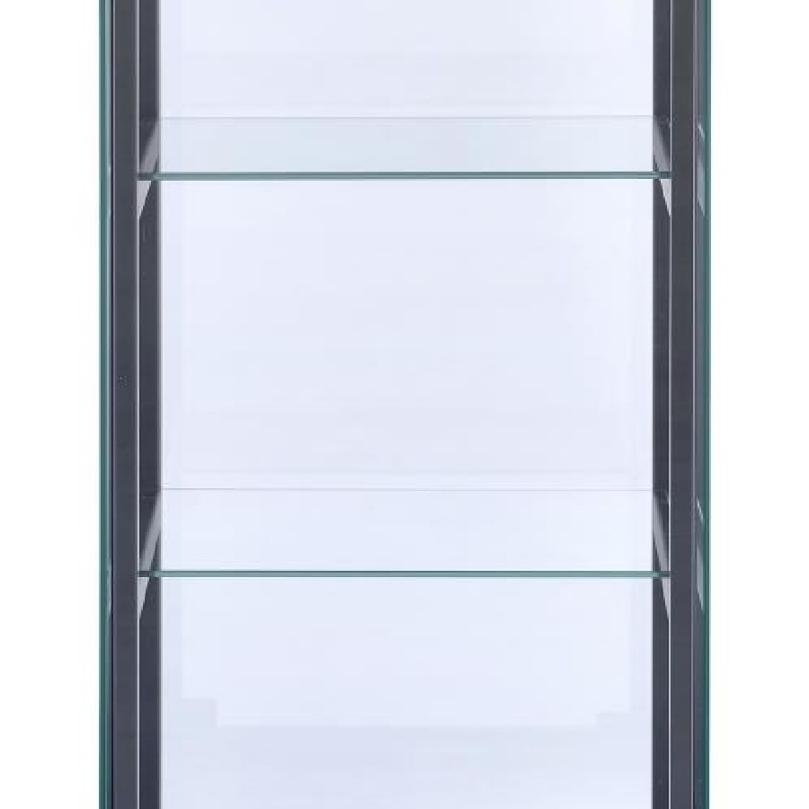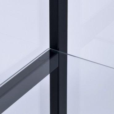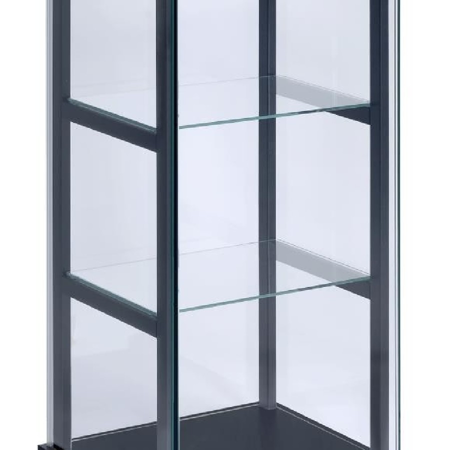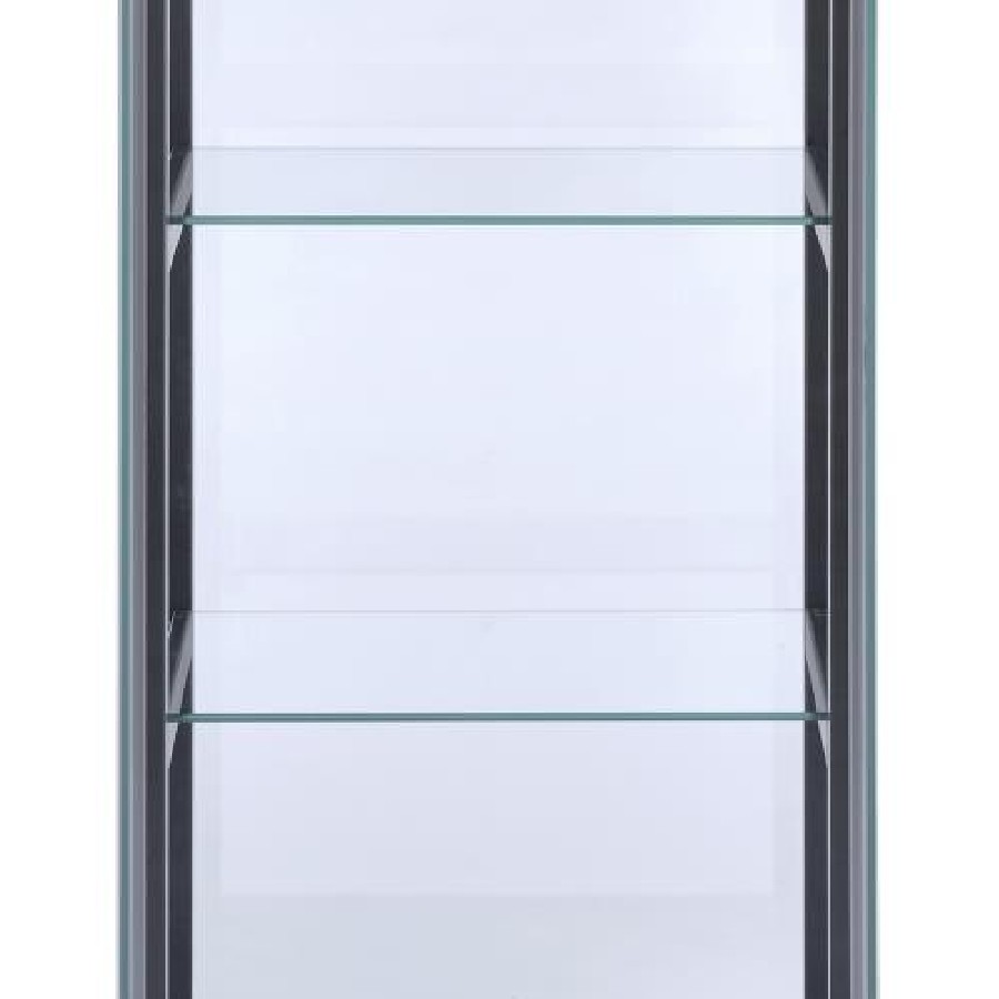A modern version of a true classic makes a fabulous addition to a transitional space. With linear styling and a fresh look, this curio cabinet offers a perfect venue for showcasing treasured decor. Bold black tops a simple frame, top, and base. Tempered glass shelves create transparent space for display. Access its interior easily with push-to-open doors.