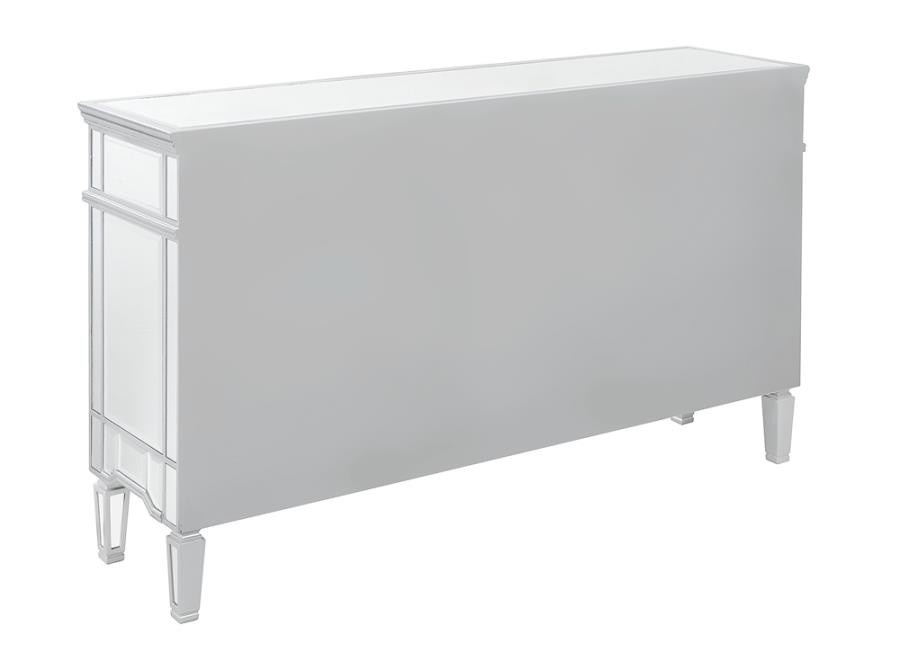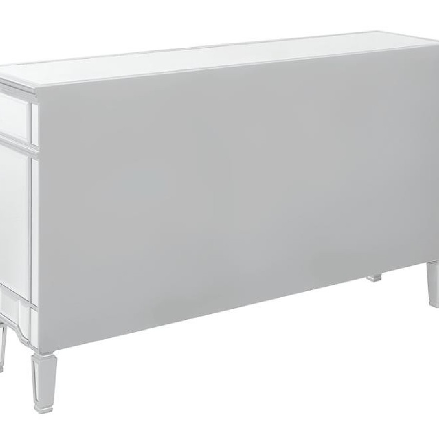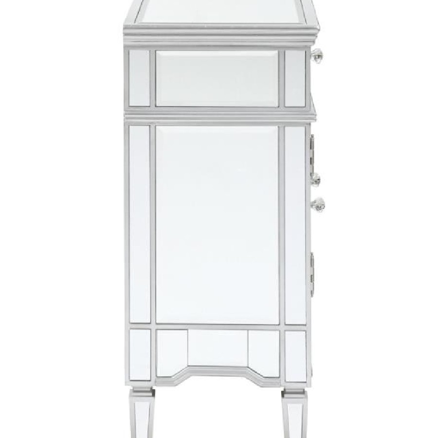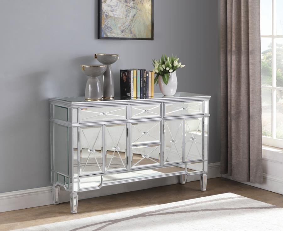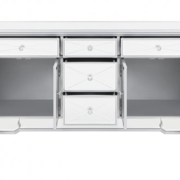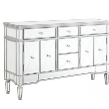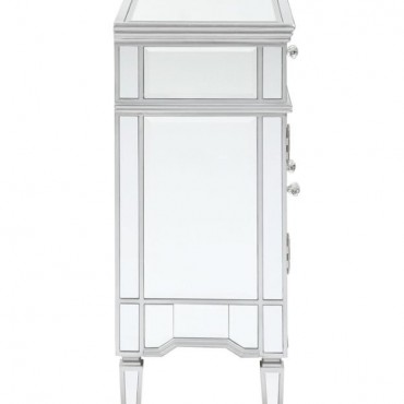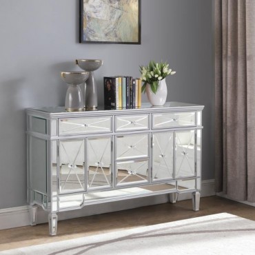This mirrored accent cabinet has plenty of storage and panache. Fashioned from a combination of materials, it brings modern appeal and convenience to the home. It features birchwood and MDF construction in a silver finish to match the lustrous mirrored accents. Nine mirrored drawers with crystal hardware feature plenty of storage capabilities for all your needs. It's a fine addition to a modern styled living room or entertainment room.