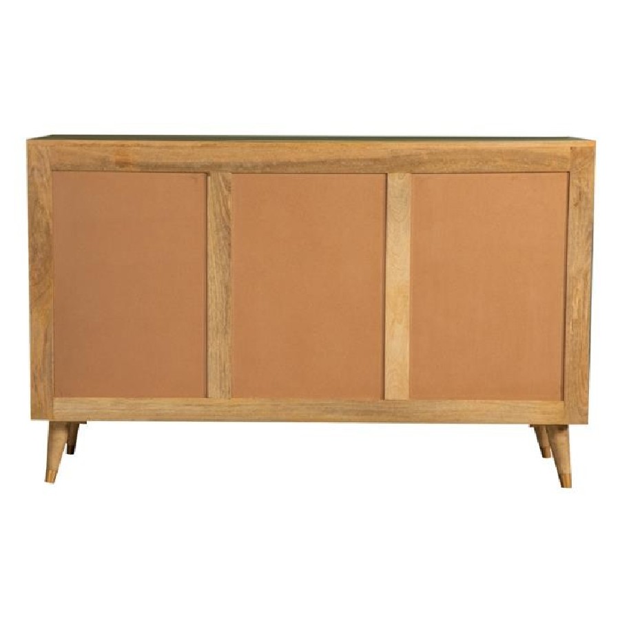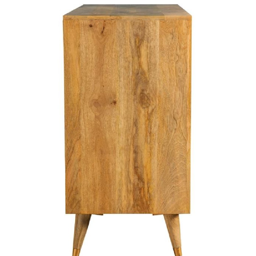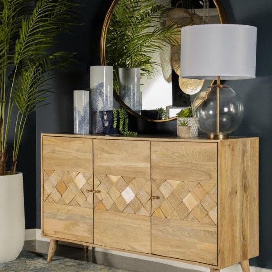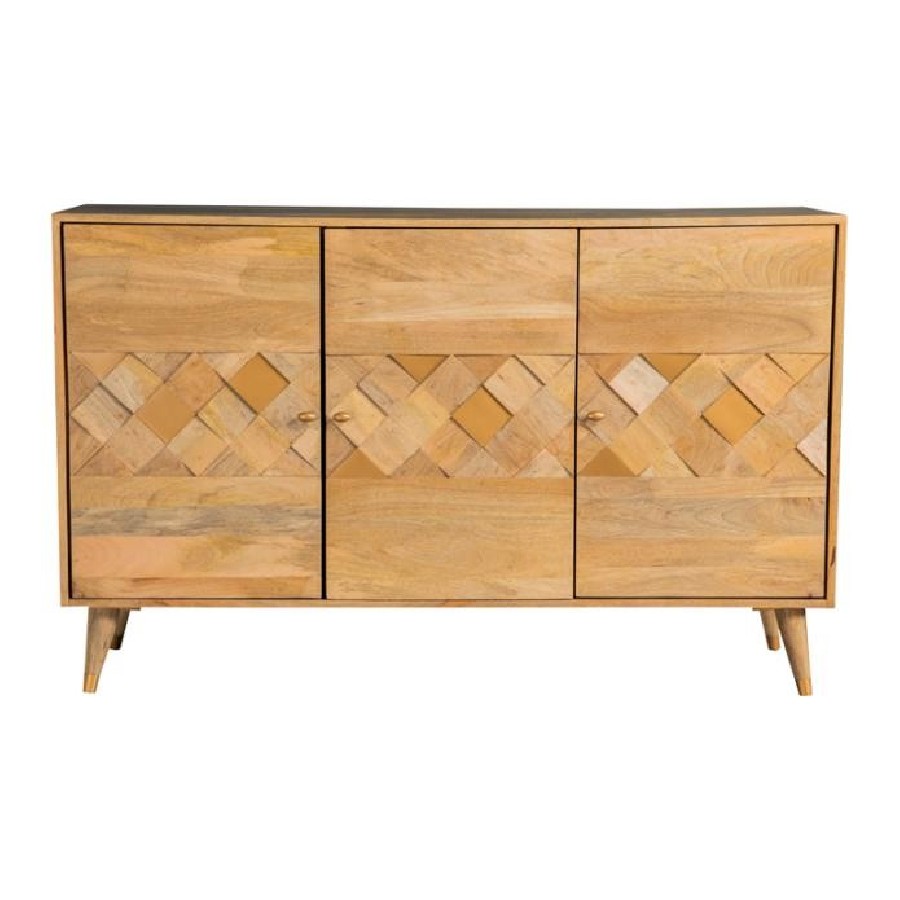 Make a statement with this three-door accent cabinet, blending mid-century modern aesthetics with natural charm. Crafted from solid mango wood, the checkered woodgrain pattern across the doors creates a striking visual texture. The spacious interior with two shelves provides ample hidden storage for a clutter-free space. Supported by tapered solid wood legs with gold-finished metal tips, this piece brings both elegance and functionality to entryways, dining rooms, or living areas. The warm natural finish complements a range of interior styles, making it a versatile addition to any home.
