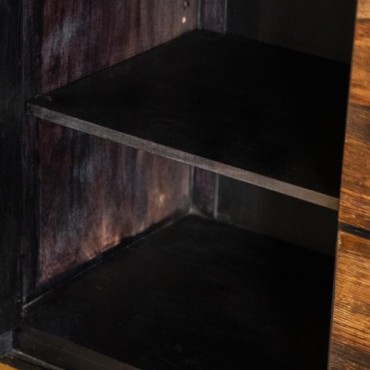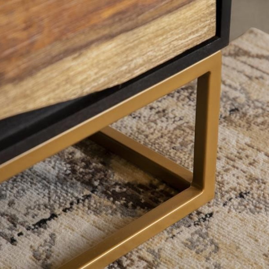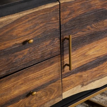 An outstanding handcrafted wood accent table from India, this piece flaunts a range of natural wood colors. Two cabinet drawers boast sleek gold bar pulls. Meanwhile, two center drawers offer additional storage space. The gold geometric base ties the entire look together. Use this piece in eclectic style living spaces.