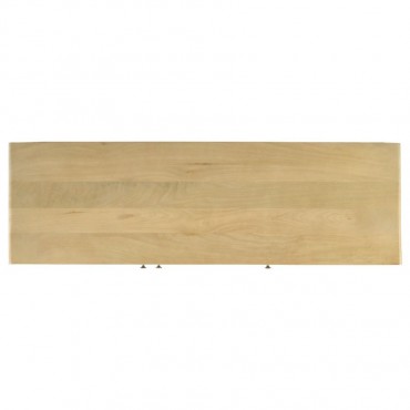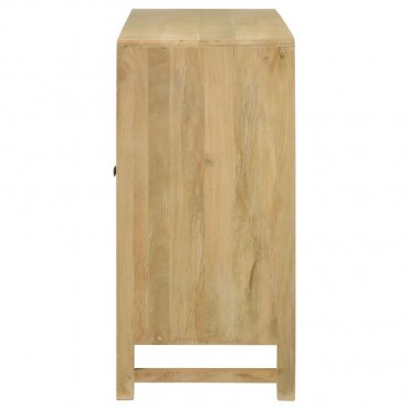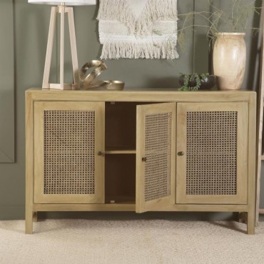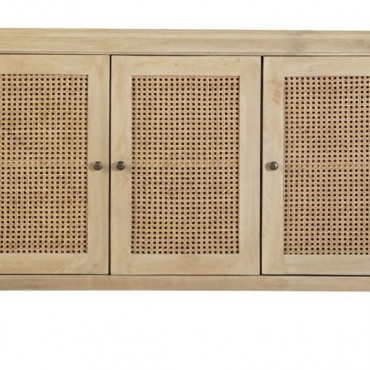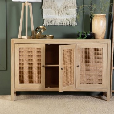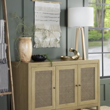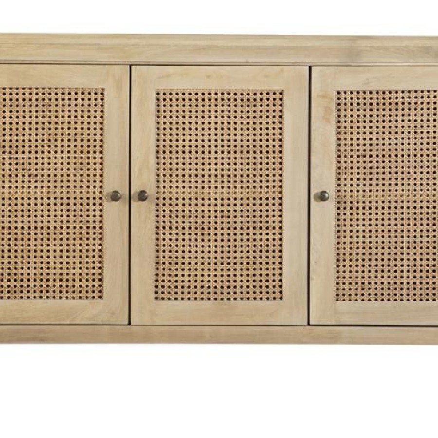 Infuse your space with the organic beauty of this global-inspired accent cabinet, crafted from eco-friendly mango wood in a warm natural finish. The three cabinet doors feature woven cane panels, adding a retro touch while allowing for subtle ventilation. Antique brass-finished knobs offer a refined contrast, enhancing the cabinet’s timeless appeal. The spacious interior with shelving provides ample storage for dining essentials, entryway organization, or living room decor. With clean lines, rounded edges, and a light wood tone, this cabinet blends modern simplicity with earthy charm.