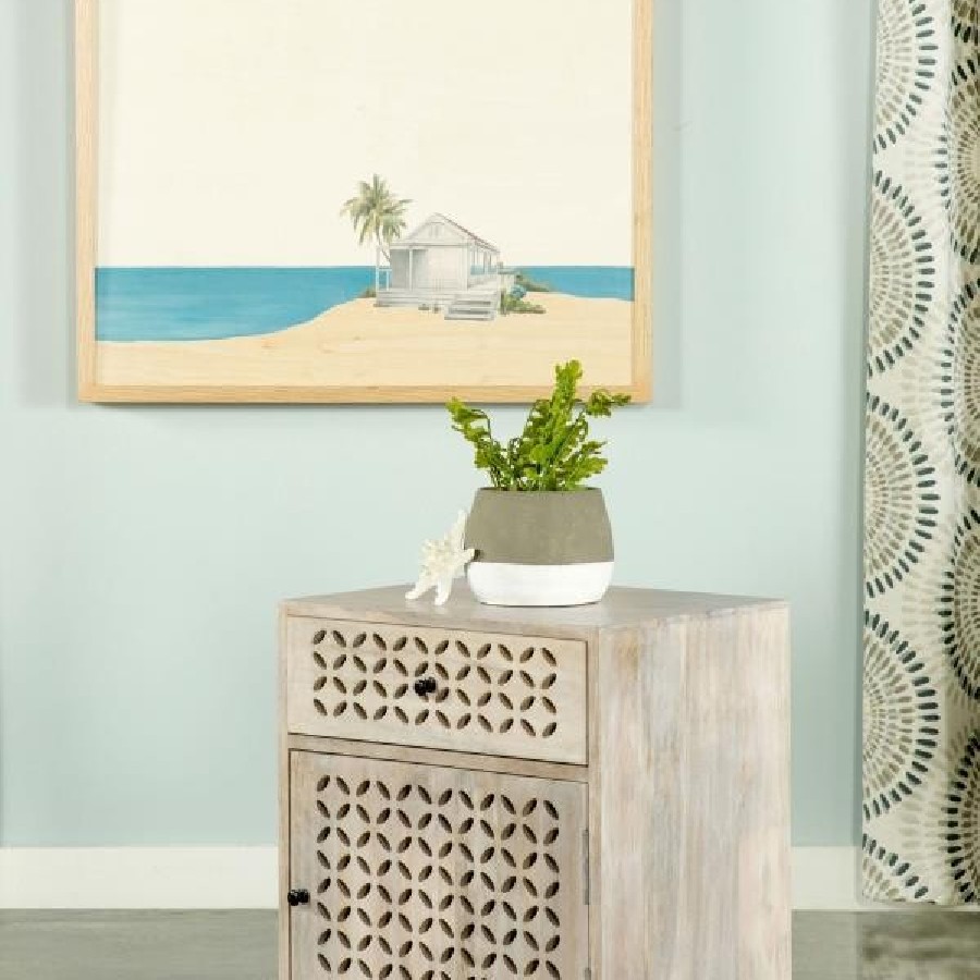Built from an eco-friendly solid mango wood for sustainable homes, this contemporary accent cabinet makes a striking statement piece in a space. Designed with a lightly hued, whitewash finish, this accent table lends itself nicely to a variety of color palettes and decor styles. Diamond-like lattice cut outs along the front cabinet and drawer front offer charming elements to the simple, smooth surfaces of this understated furniture piece. Store essentials in a top drawer and the bottom cabinet, keeping the tabletop free of clutter. Place this lovely accent table in a beach bungalow and allow it to double as a nightstand in a global-inspired, eclectic bedroom.