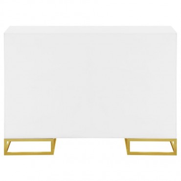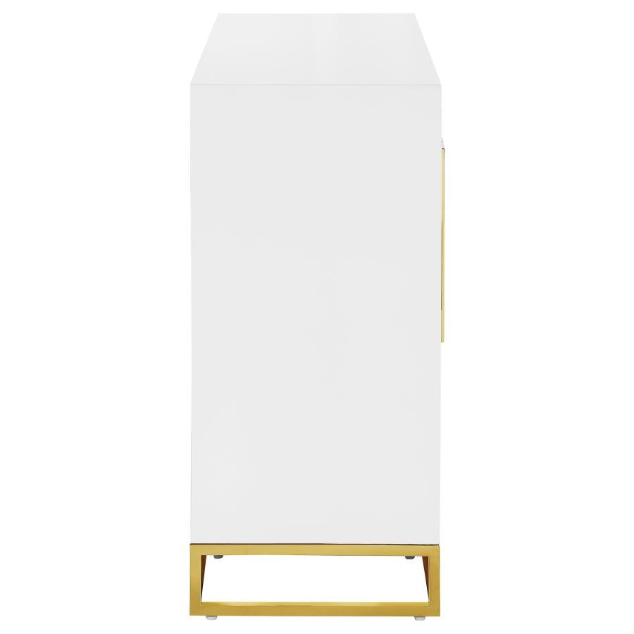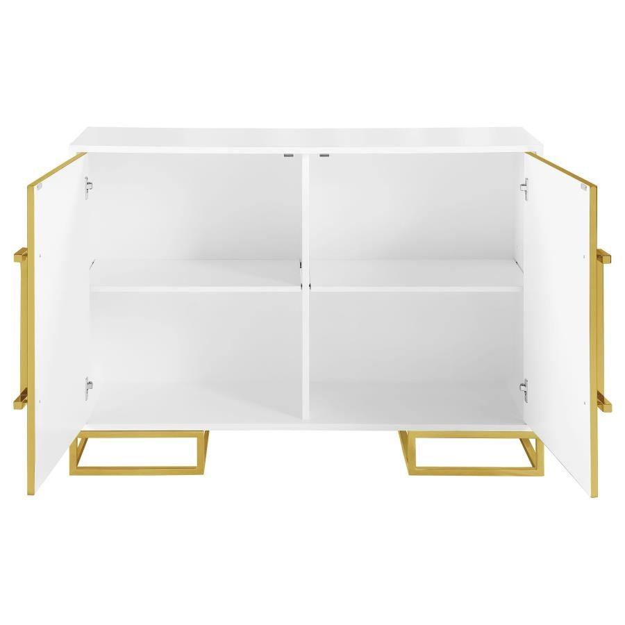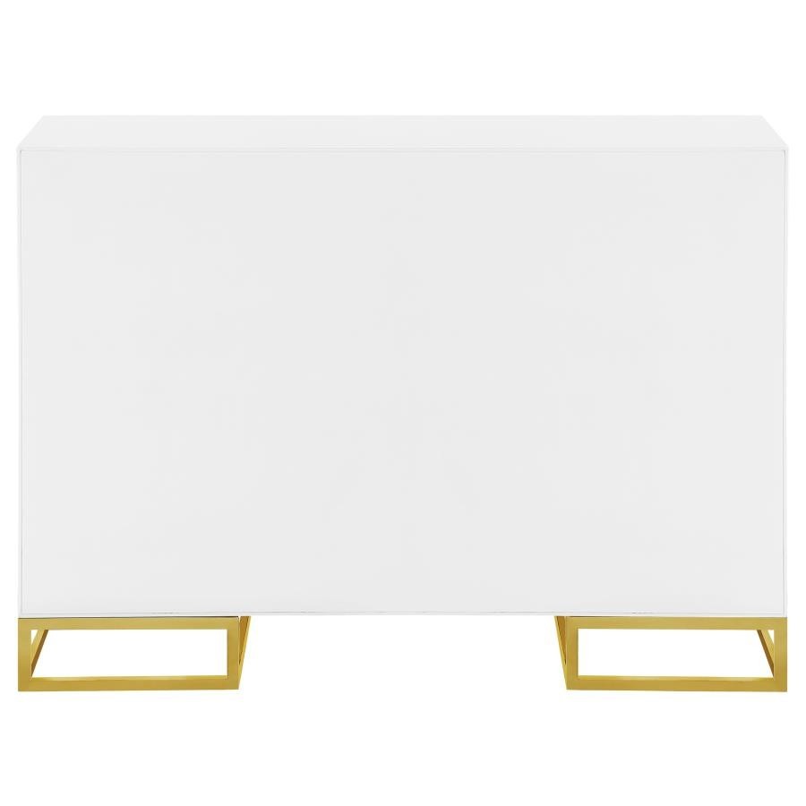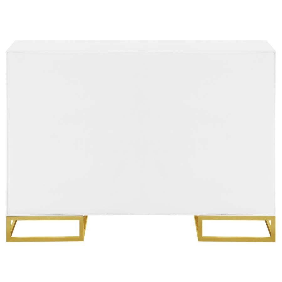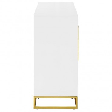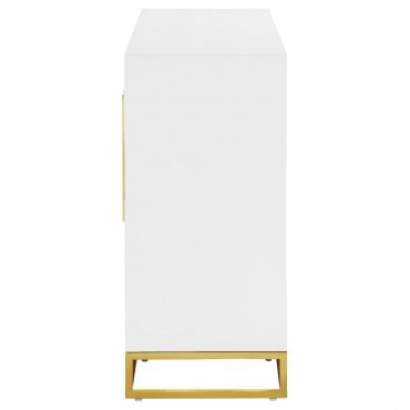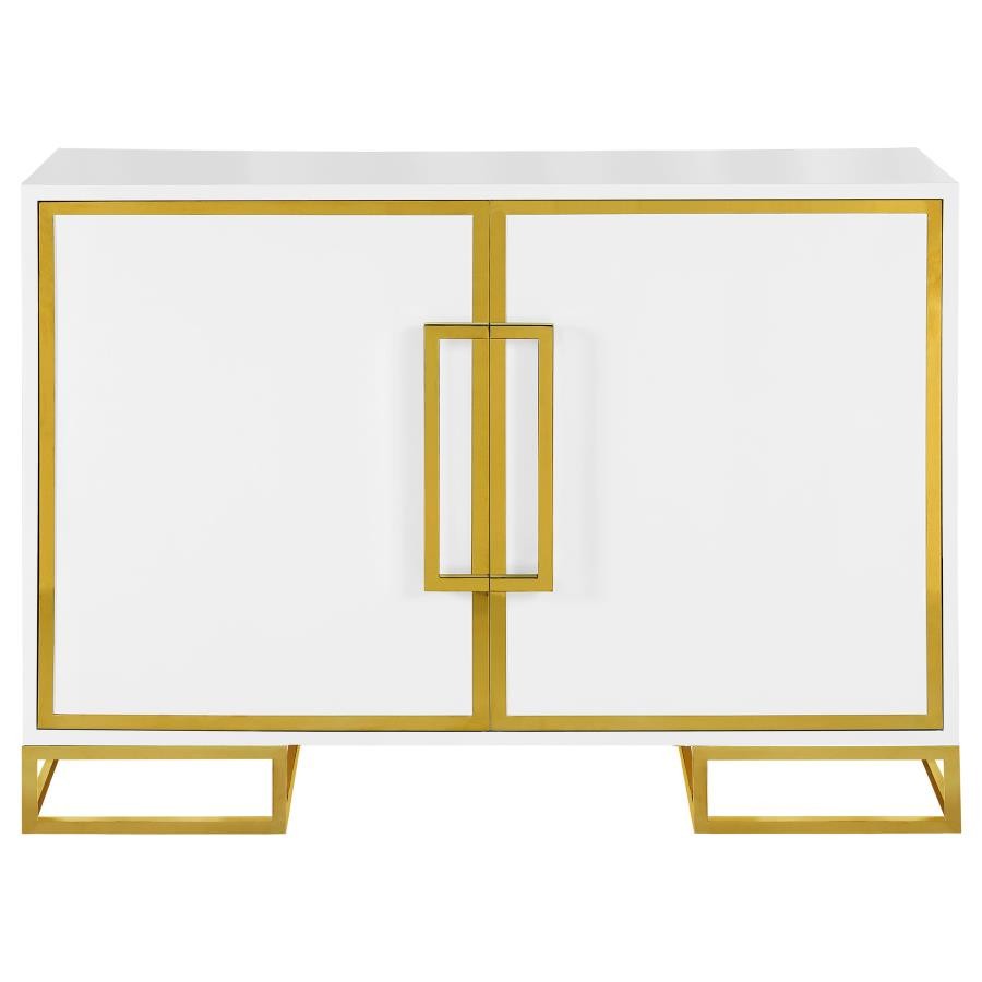 Add a bold statement piece to your space with this stunning modern accent cabinet. Featuring a glossy white finish with lustrous gold stainless steel trim, it showcases Art Deco flair with clean lines and geometric base supports. Behind double doors, adjustable shelves offer customizable storage. Crafted from durable MDF and stainless steel, this cabinet blends glamour and function beautifully in any setting.