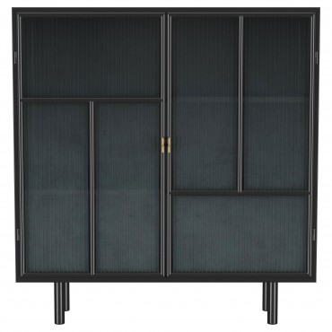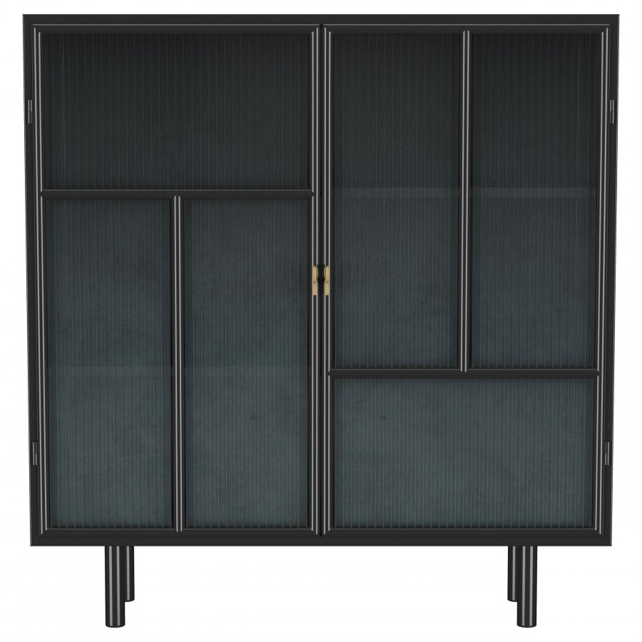 Create a stylish, engaging spot for easy storage with a modern industrial accent cabinet. Blending beautifully in casual, urban, and farmhouse settings, it features metal construction with a rich black finish that offers a neutral complement to your space. The cabinet features two clear glass doors with vertical ribbing that creates a wavy, watery effect and provides a touch of camouflage for items placed within. Metal overlays decorate the doors further, adding a geometric element sure to catch your eye. The cabinet opens to reveal two fixed shelves, great for everything from boardgames in the living room to serve ware in your dining room.