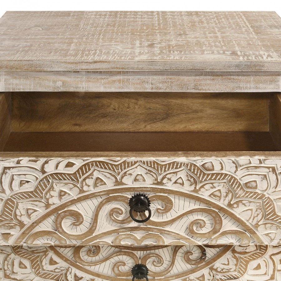 An ornate medallion brings boho charm and artisan character to a farmhouse accent cabinet. Easily doubling as a side table, the cabinet features three drawers perfect for tucking away essentials and accessories in a tidy living area or bedroom. A whitewashed finish complements mango wood, creating depth and dimension for the intricacies of the medallion that spans the drawer fronts. Three bail knobs reinforce a charming look and feel, perfect for complementing Bohemian or maximalist design. Add a funky table lamp or artisan sculpture to complete the look.