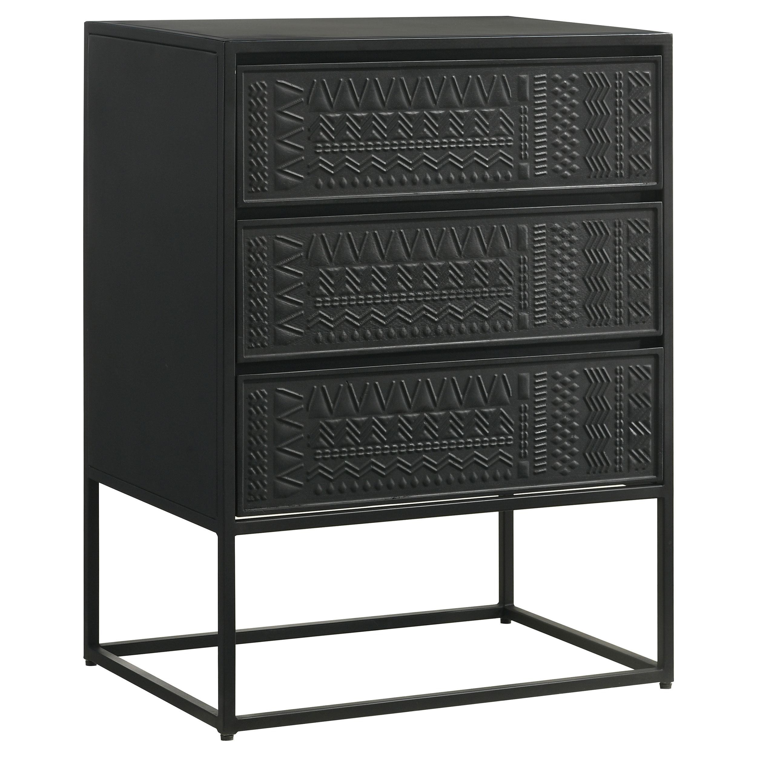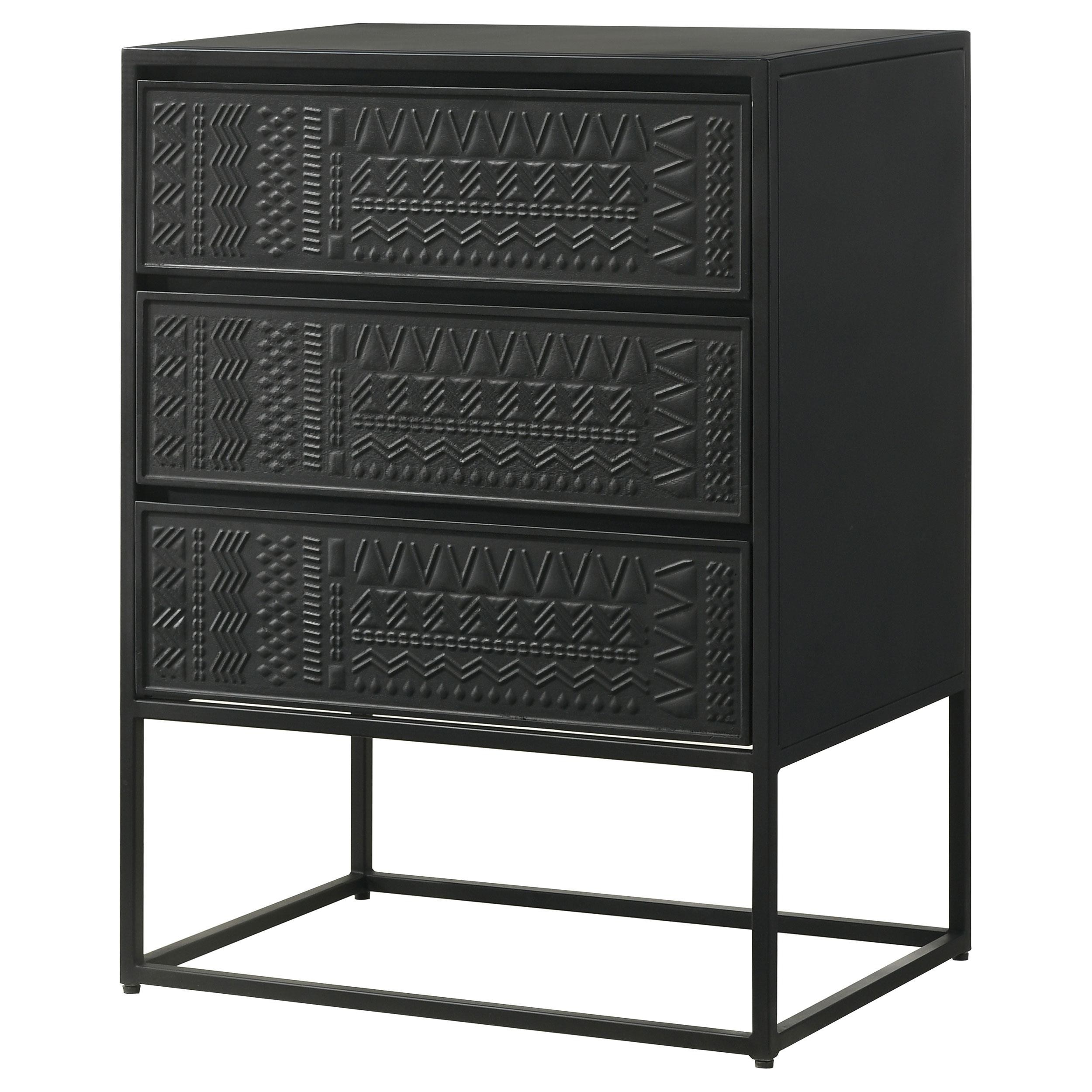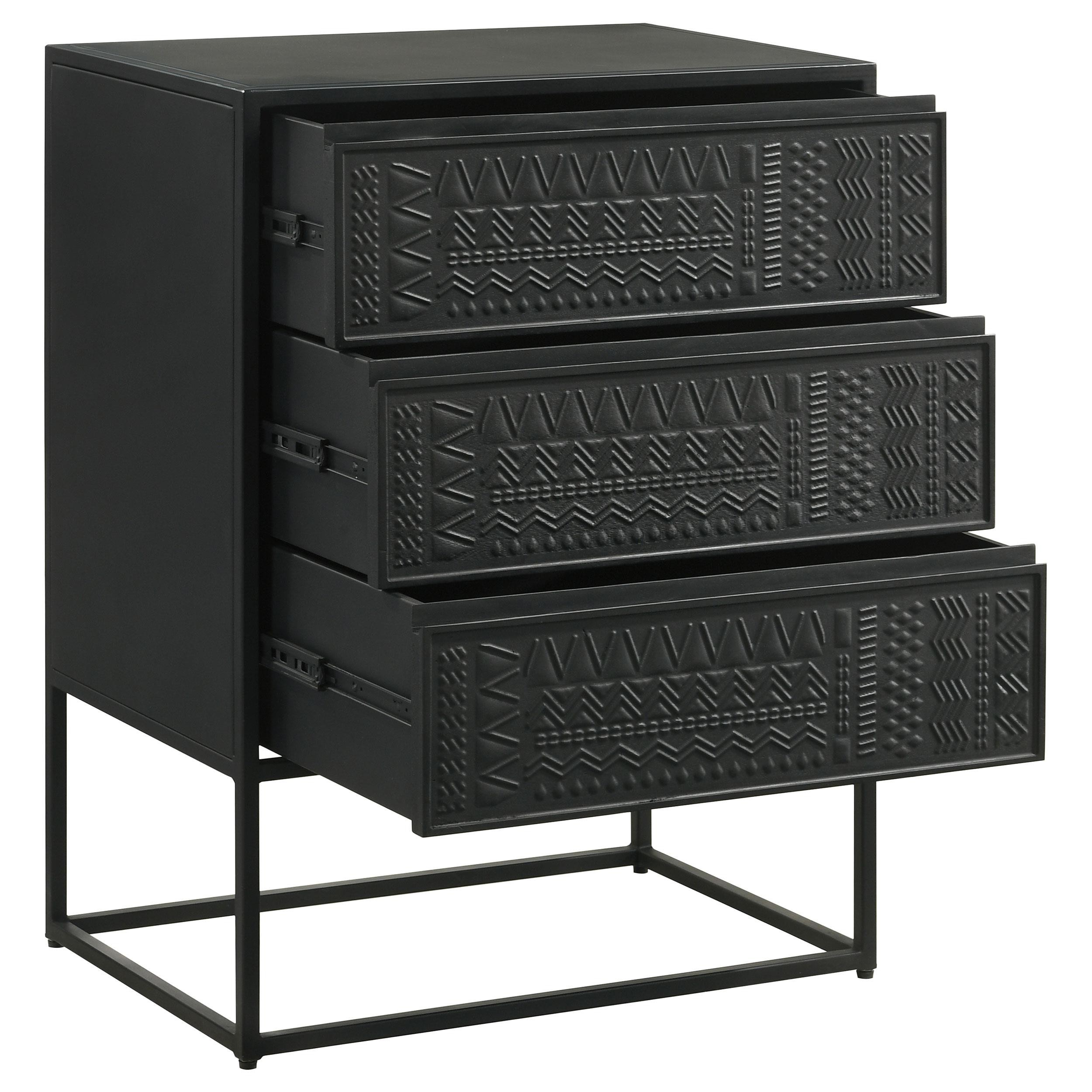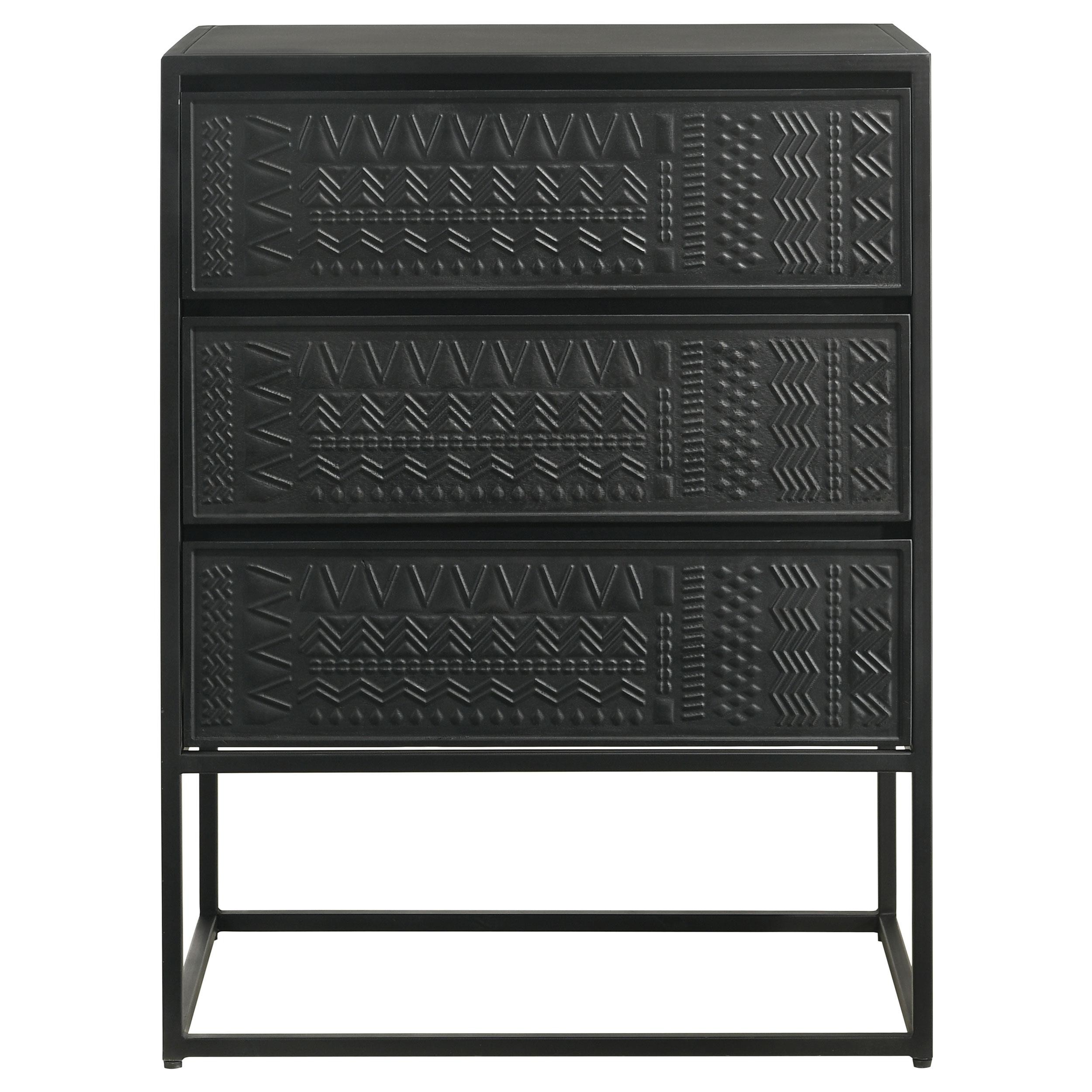 Tribal bands offer subtle dimension and detail to a trio of drawer fronts in the farmhouse accent cabinet. In crisp black, it's built with an open base and clean, straight lines to complement myriad spaces within your home. Three drawers offer easy organization, helping bring tidy style in your entry, living area or bedroom. Smooth metal glides assure reliable performance while iron framing delivers strength and durability. Add charming decor on top to infuse personality and add colorful appeal.