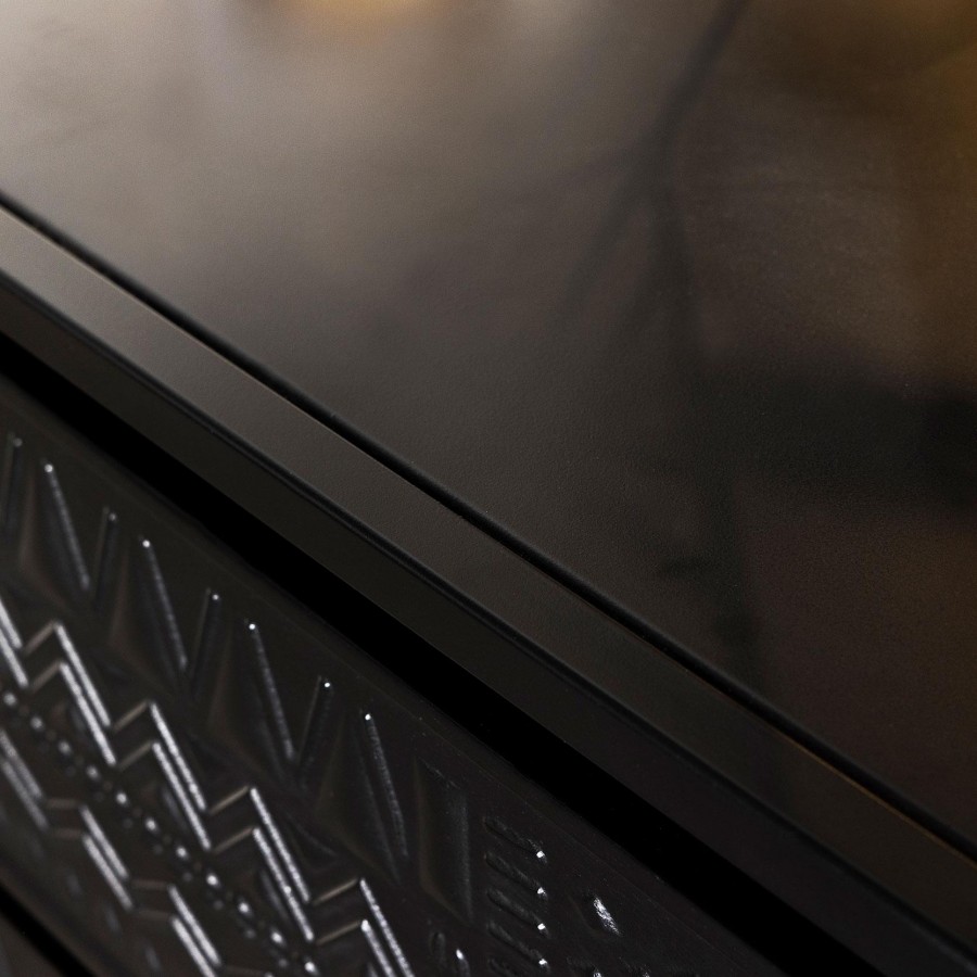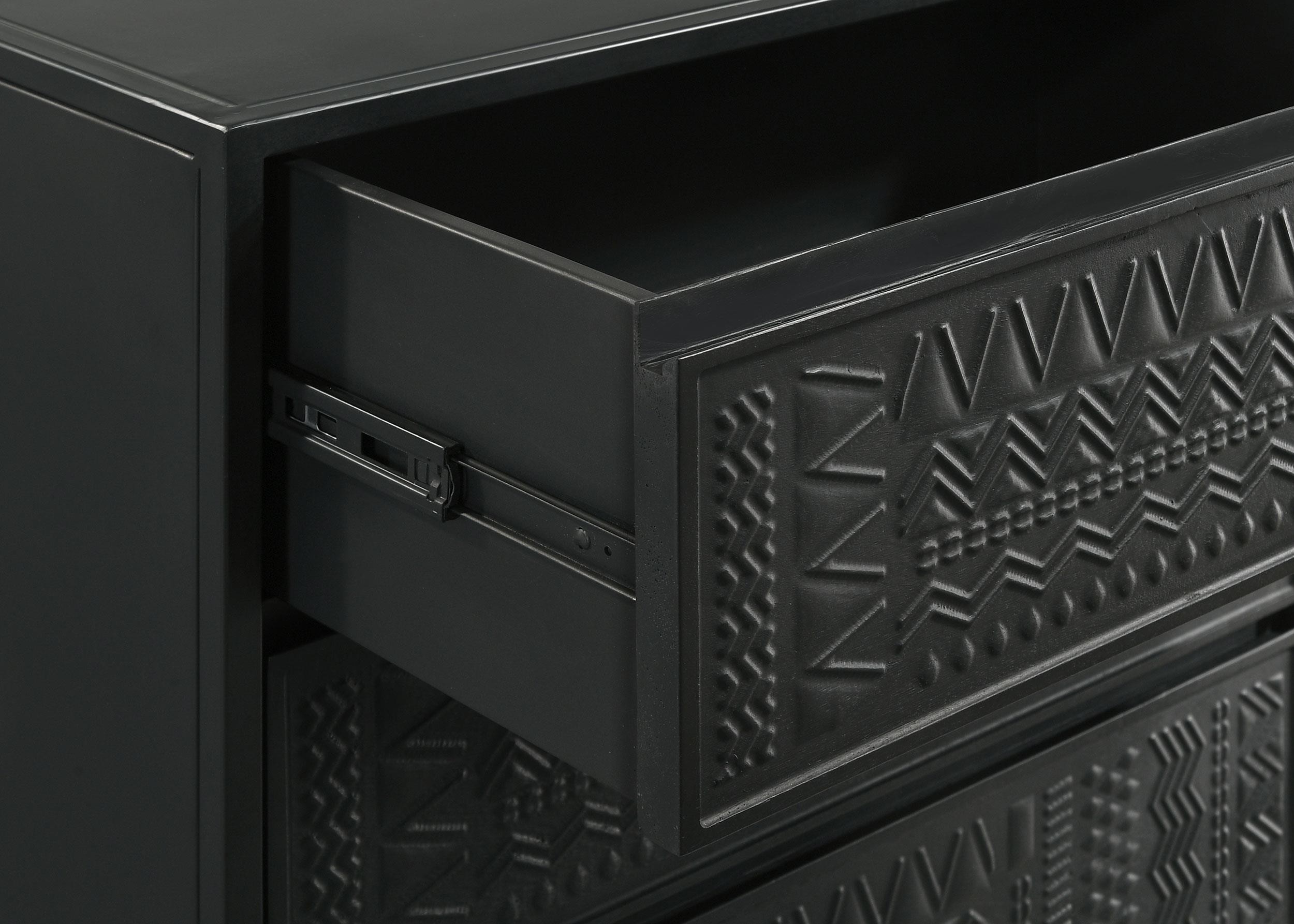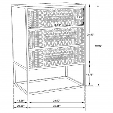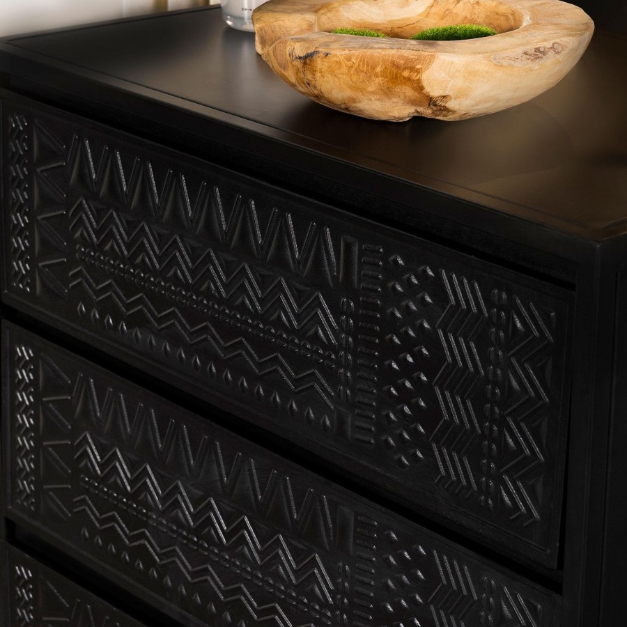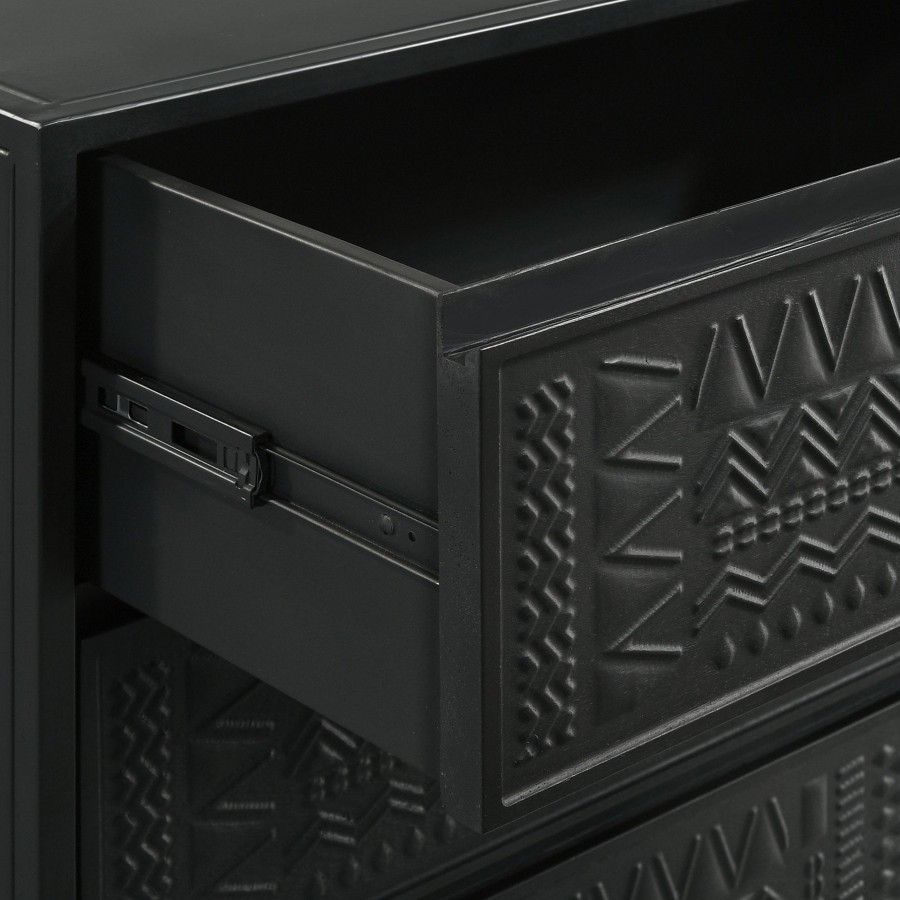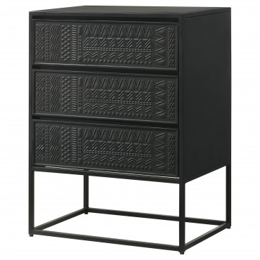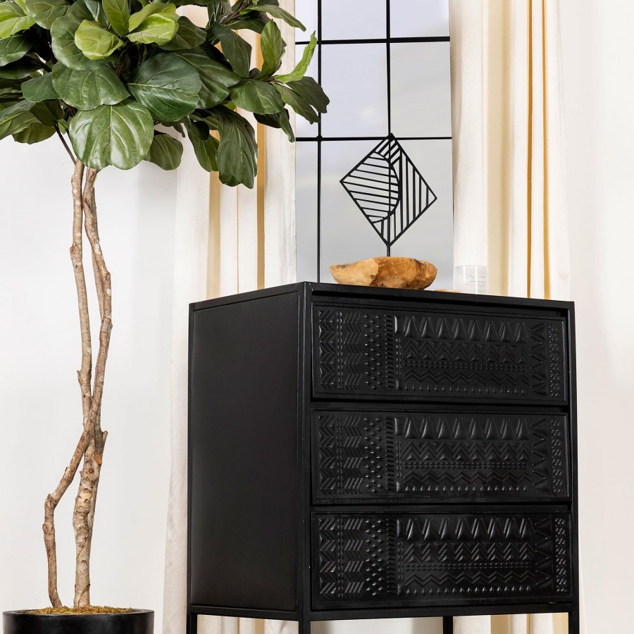Tribal bands offer subtle dimension and detail to a trio of drawer fronts in the farmhouse accent cabinet. In crisp black, it's built with an open base and clean, straight lines to complement myriad spaces within your home. Three drawers offer easy organization, helping bring tidy style in your entry, living area or bedroom. Smooth metal glides assure reliable performance while iron framing delivers strength and durability. Add charming decor on top to infuse personality and add colorful appeal.