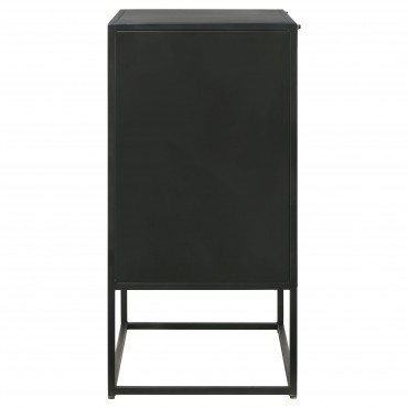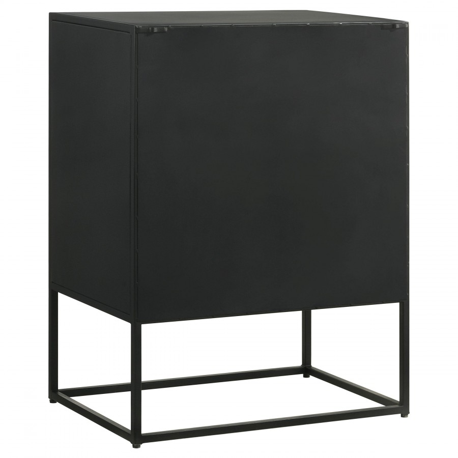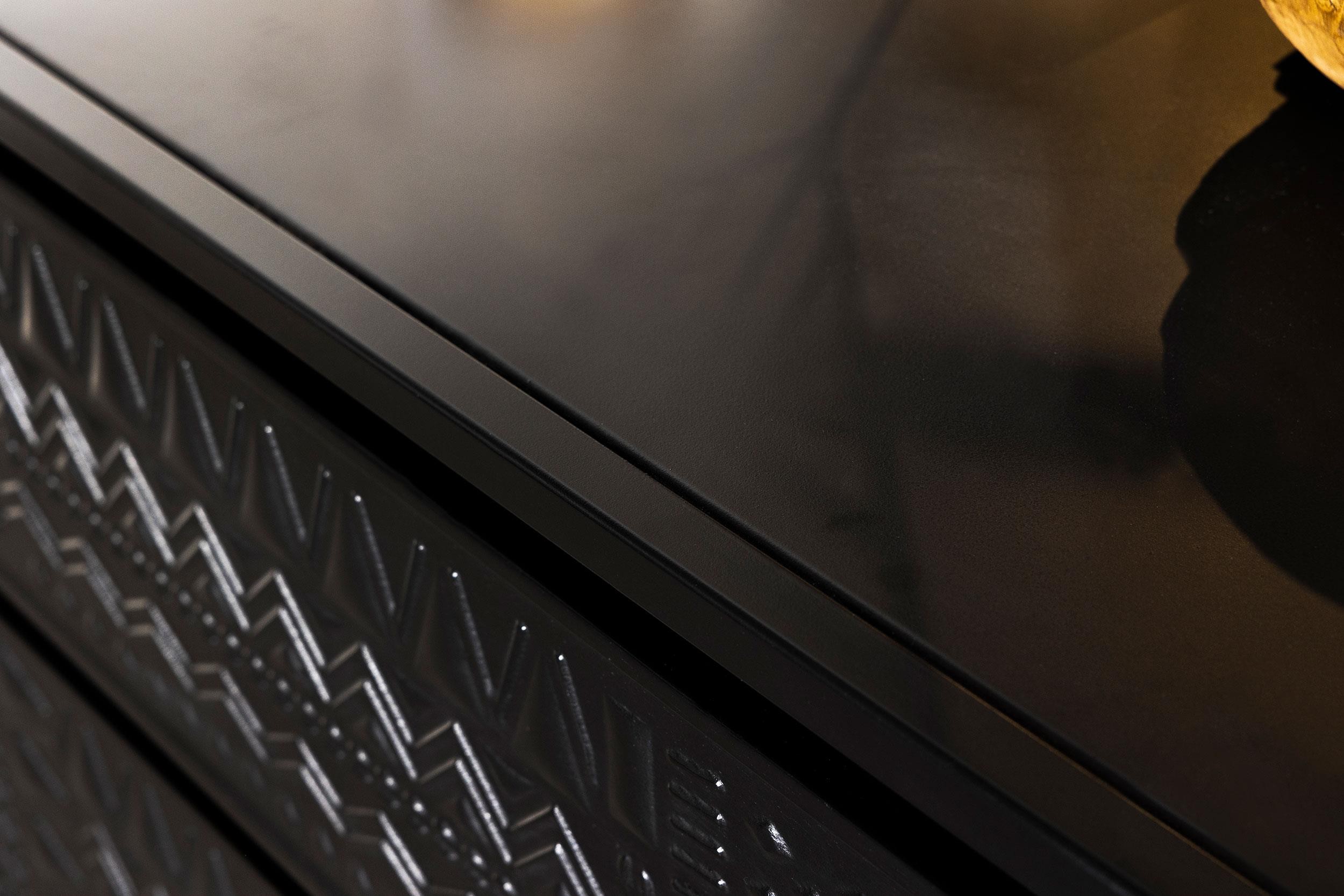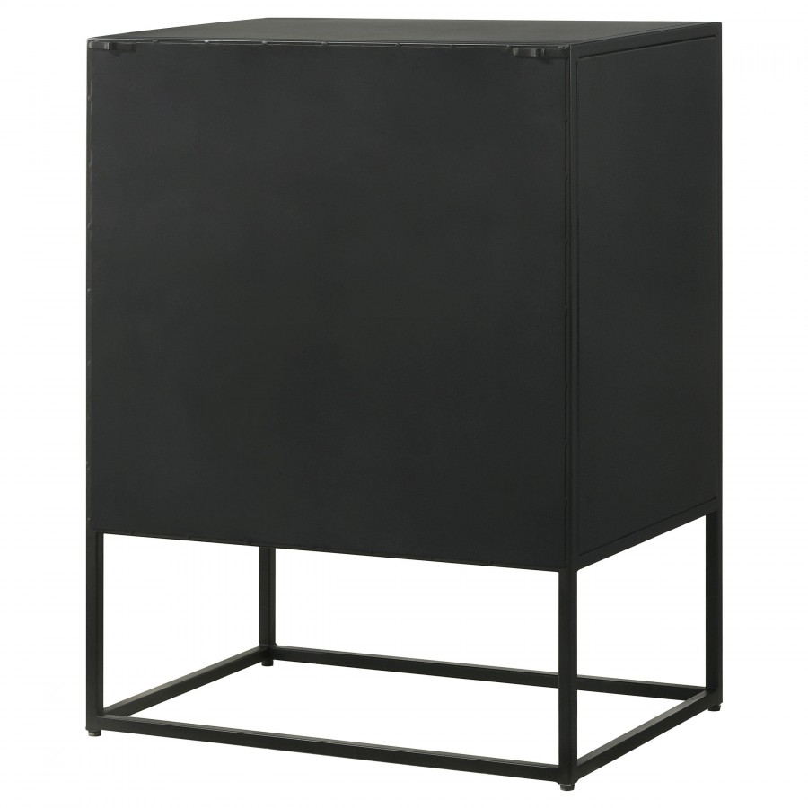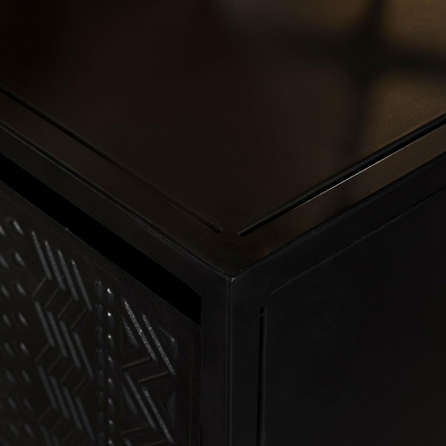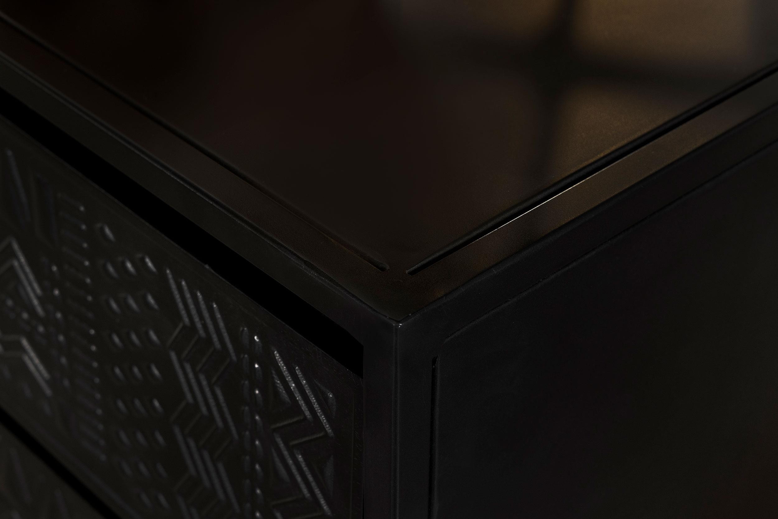Tribal bands offer subtle dimension and detail to a trio of drawer fronts in the farmhouse accent cabinet. In crisp black, it's built with an open base and clean, straight lines to complement myriad spaces within your home. Three drawers offer easy organization, helping bring tidy style in your entry, living area or bedroom. Smooth metal glides assure reliable performance while iron framing delivers strength and durability. Add charming decor on top to infuse personality and add colorful appeal.