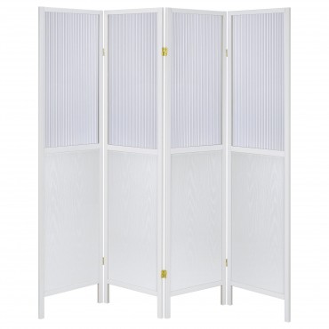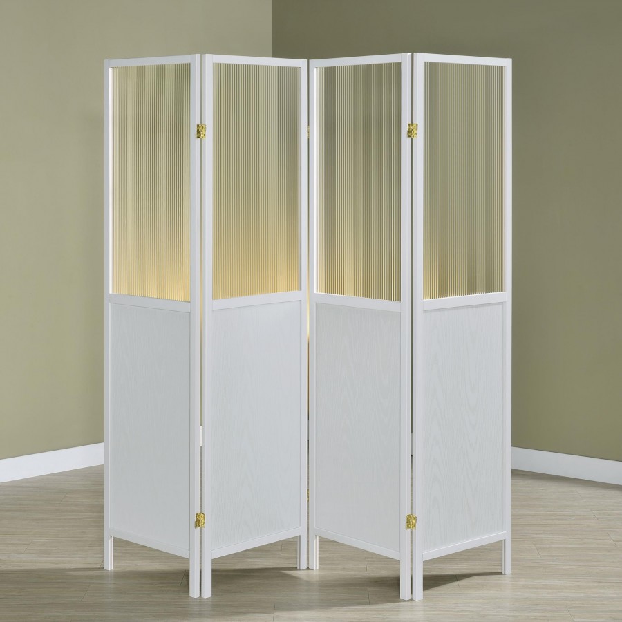 Create the perfect sense of division in your open living space with a transitional four-panel room divider. The freestanding piece offers four tall panels, each divided with a semi-opaque top section that allows light to pass through. The panels are ideal for a large primary suite, creating a sense of privacy for dressing or to section off a desk. The frame of each panel features a neutral finish and a solid lower panel for excellent performance and privacy. The lower panels includes a wood grain finish that's subtle, offering a touch of dimension to any room.