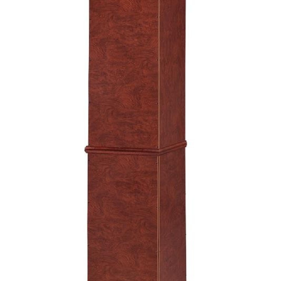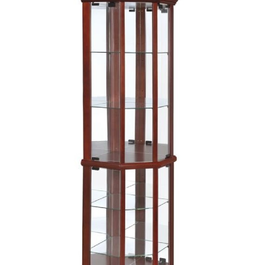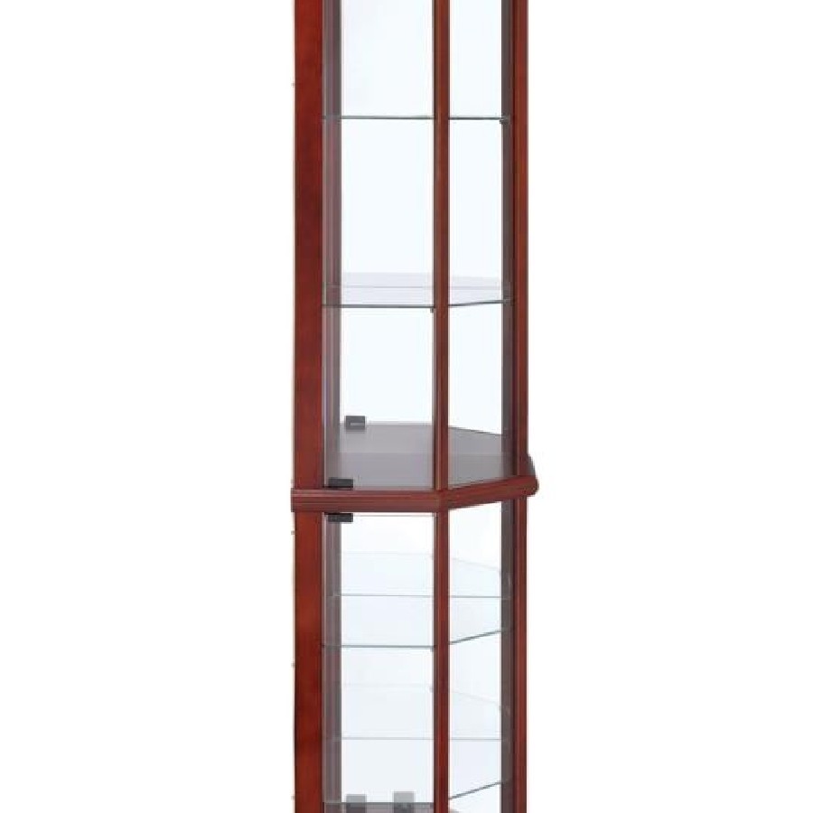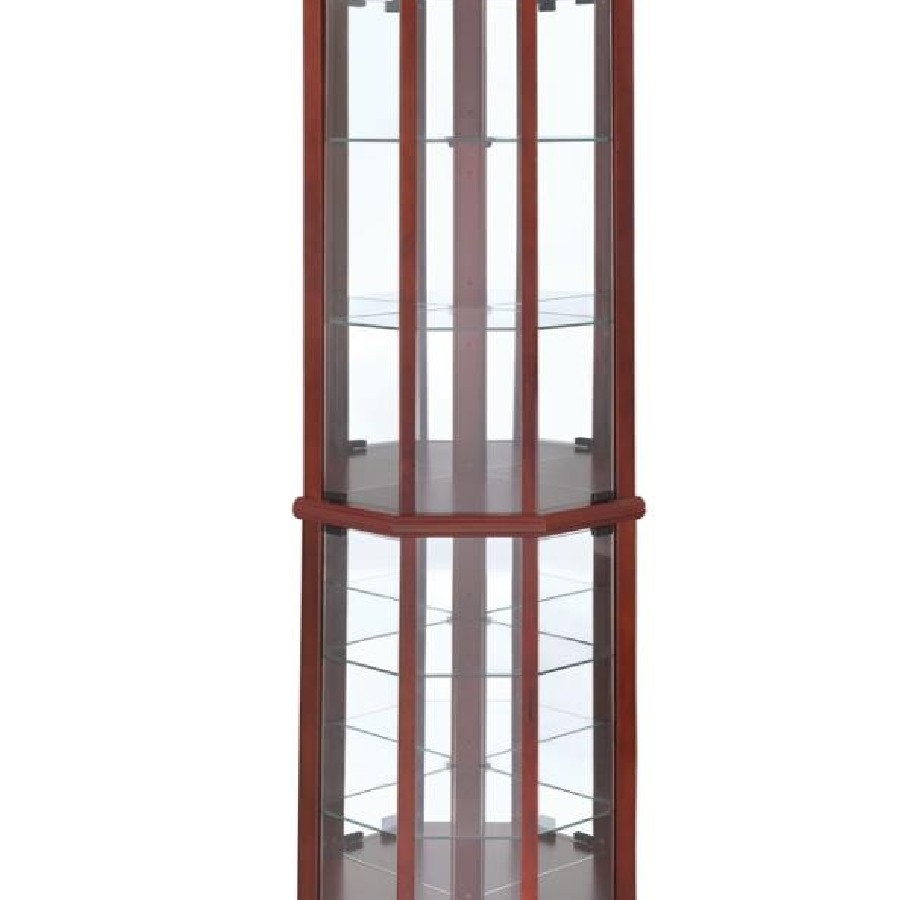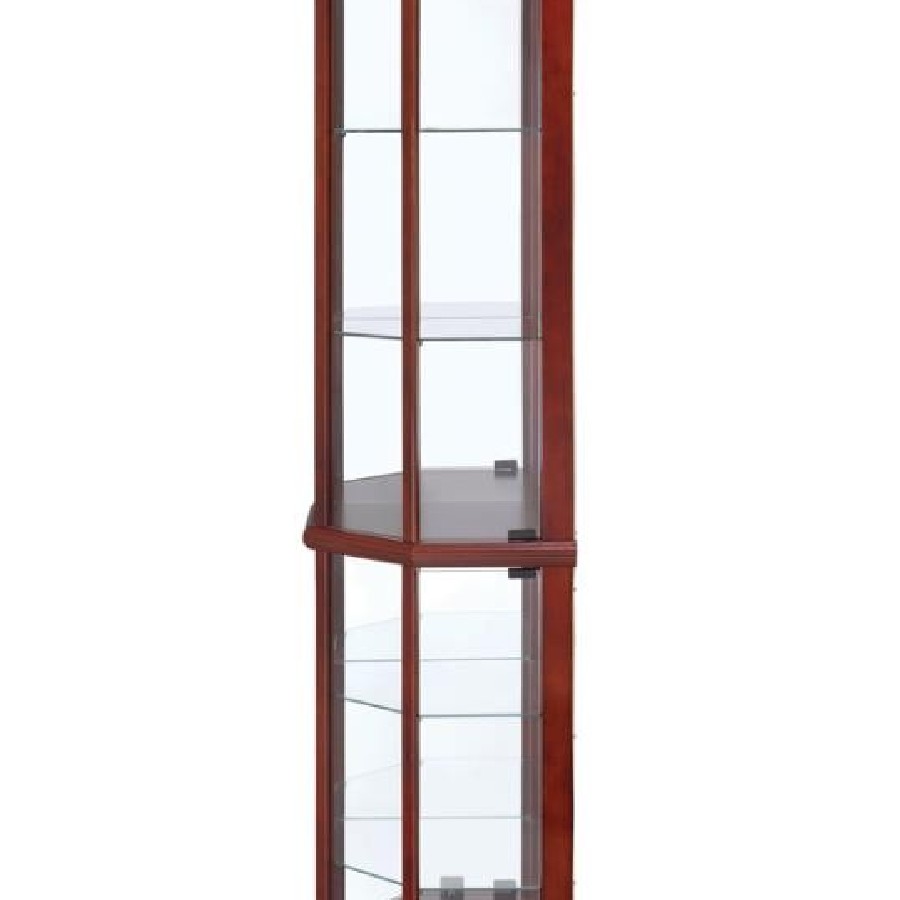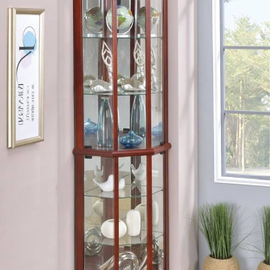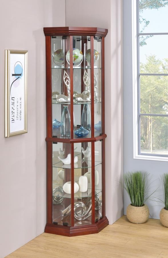If you fancy special collectibles or unique knickknacks, where can you show them all off? This corner curio cabinet is a fantastic place, for starters. It is crafted to fit perfectly into the corner of your living room or den for prominence. Features five glass shelves plus a bottom one for plenty of display areas. Beautifully finished in medium brown that matches almost any decor.