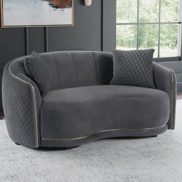 Bold contrast is achieved with the sophisticated gold trim featured on a modern loveseat. Designed to make a statement, the loveseat is a chic curved kidney silhouette with tight upholstery over its seat and a channel tufted back. The outer back and arm surface adds diamond quilting to create inviting texture, while a pair of accent pillows provide custom comfort. The loveseat shows off sloping arms for a streamlined profile that's smooth and sleek in your space. Choose this loveseat for a bit of fresh perspective in your living room or den.