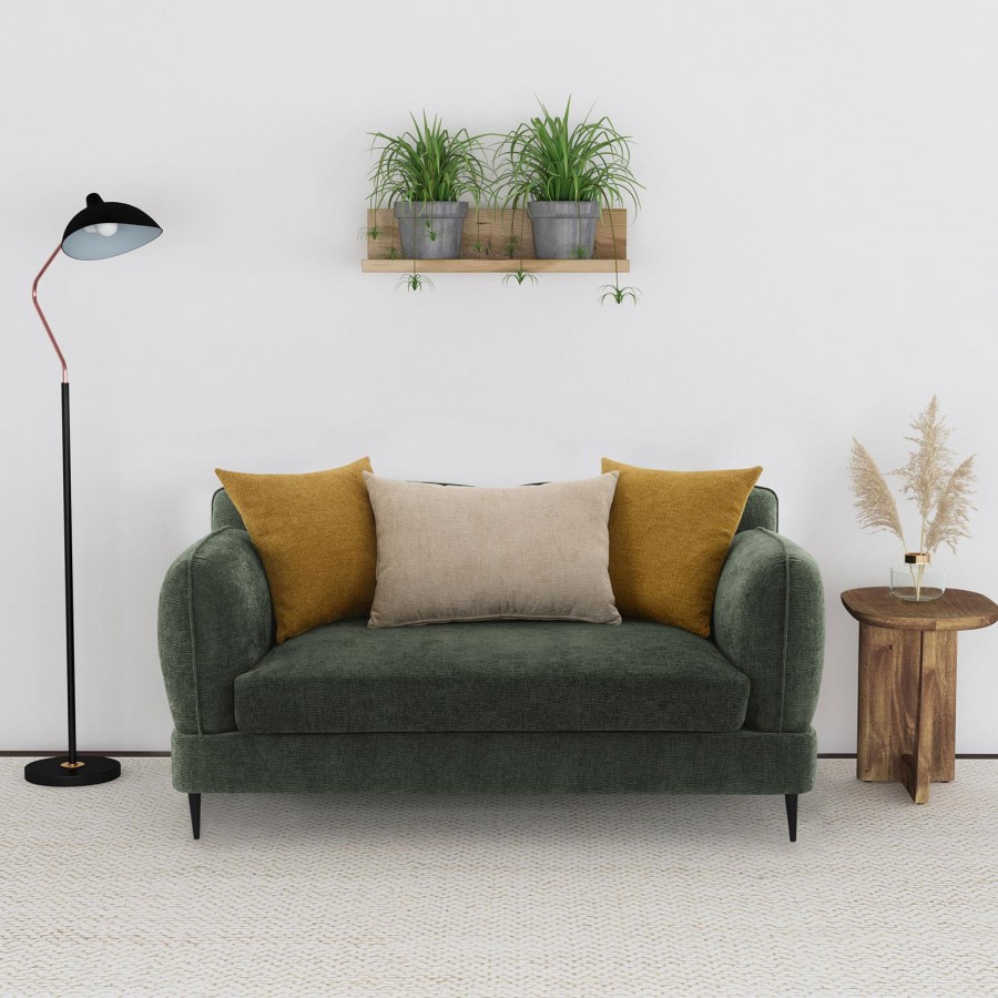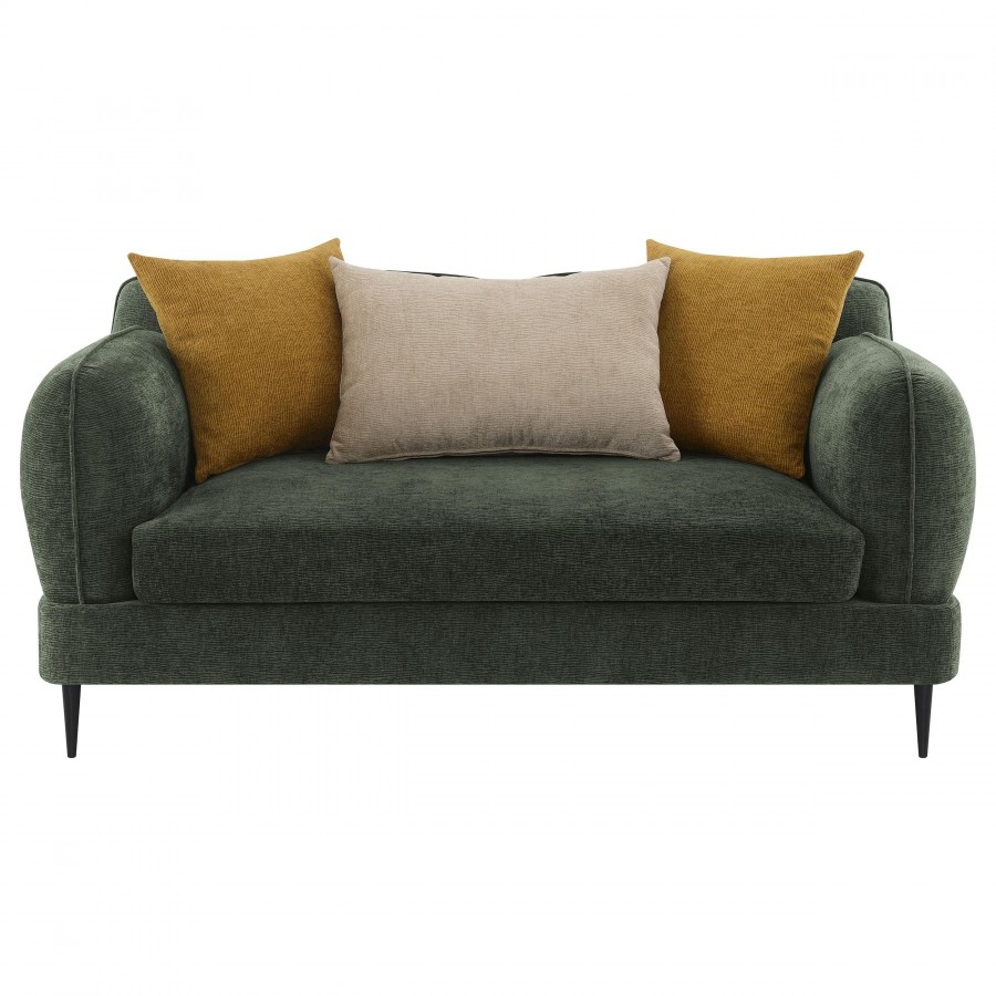 Enhance your living space with the modern elegance of this loveseat, designed to offer style, comfort, and functionality. Its sculpted round shapes and bench waterfall seat cushion provide a harmonious and inviting look, making it a perfect addition to any room. The loveseat is upholstered in textured chenille fabric, which is incredibly soft to the touch and adds a layer of luxury and durability. The rich green hue, paired with vivid yellow and neutral beige accent pillows, creates a balanced and vibrant look. Thin, tall metal legs support the loveseat, giving it a light and airy appearance while adding a modern touch.