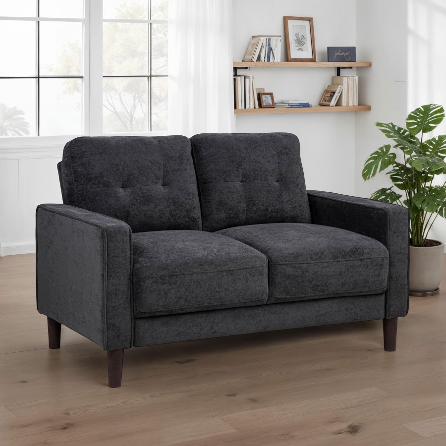 Designed for smaller spaces without sacrificing comfort, this modern loveseat blends refined lines with cozy charm. Slim track arms trimmed in cord welt frame grid-tufted back cushions for a tailored touch, while pocket coil seating offers lasting support. Wrapped in softly textured upholstery and lifted on tapered legs, it brings ease and structure to studio apartments, reading corners, or compact living rooms.
