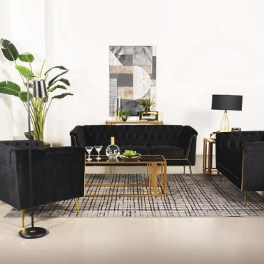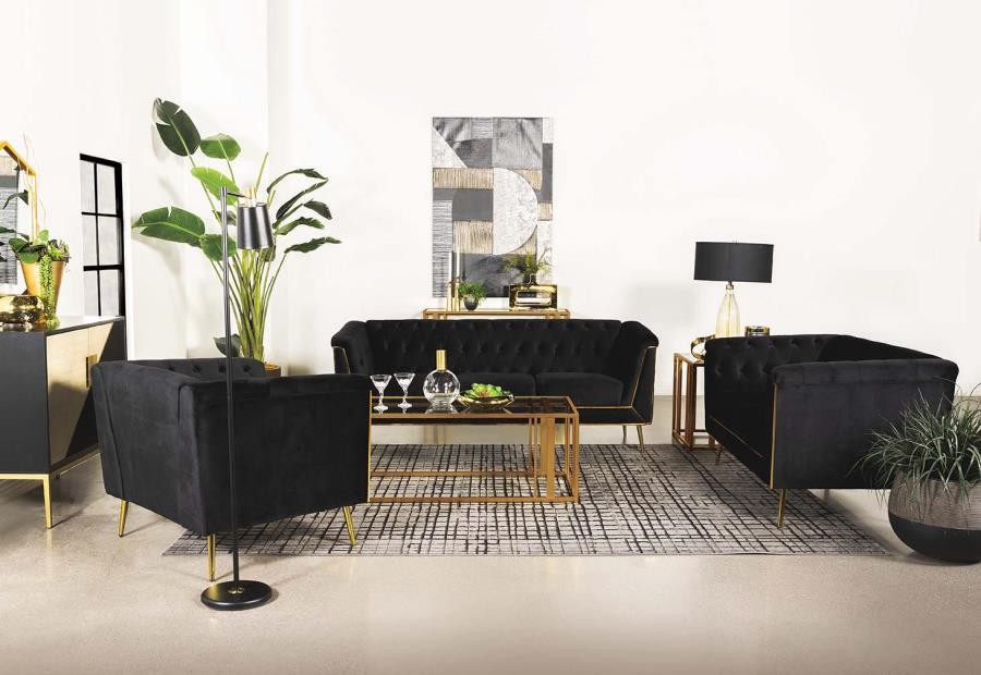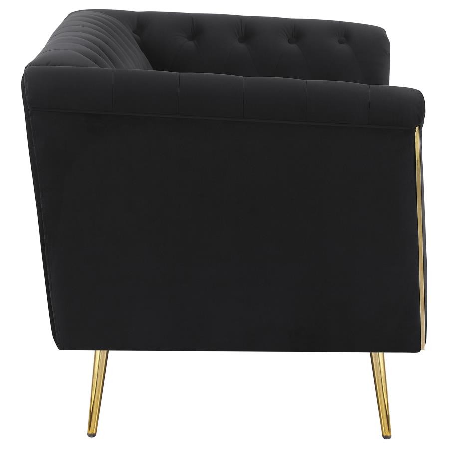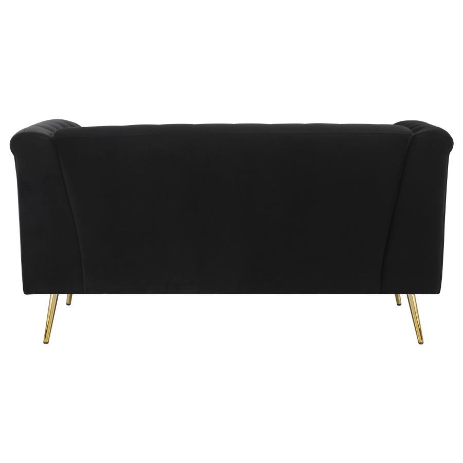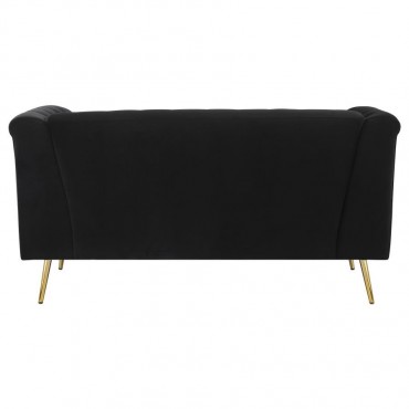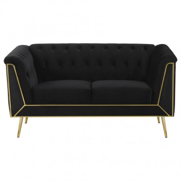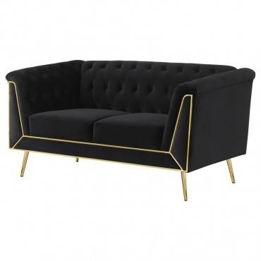 Tuck into the luxurious comfort and sophistication of an eye-catching black velvet loveseat. A seamless blend of mid-century and modern glam design elements, it pairs tuxedo arms with a matching shelter back to create a Chesterfield inspired silhouette. Button tufting across the interior of the loveseat completes the iconic look. The front of the loveseat adds eye-catching appeal with geometric metal trim in a gleaming gold finish that provides a perfect complement to splayed, tapered legs. Exceptional construction includes foam cushions with webbing support and sinuous springs in the seat to ensure no-sag performance.