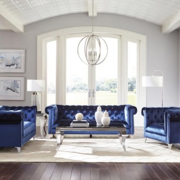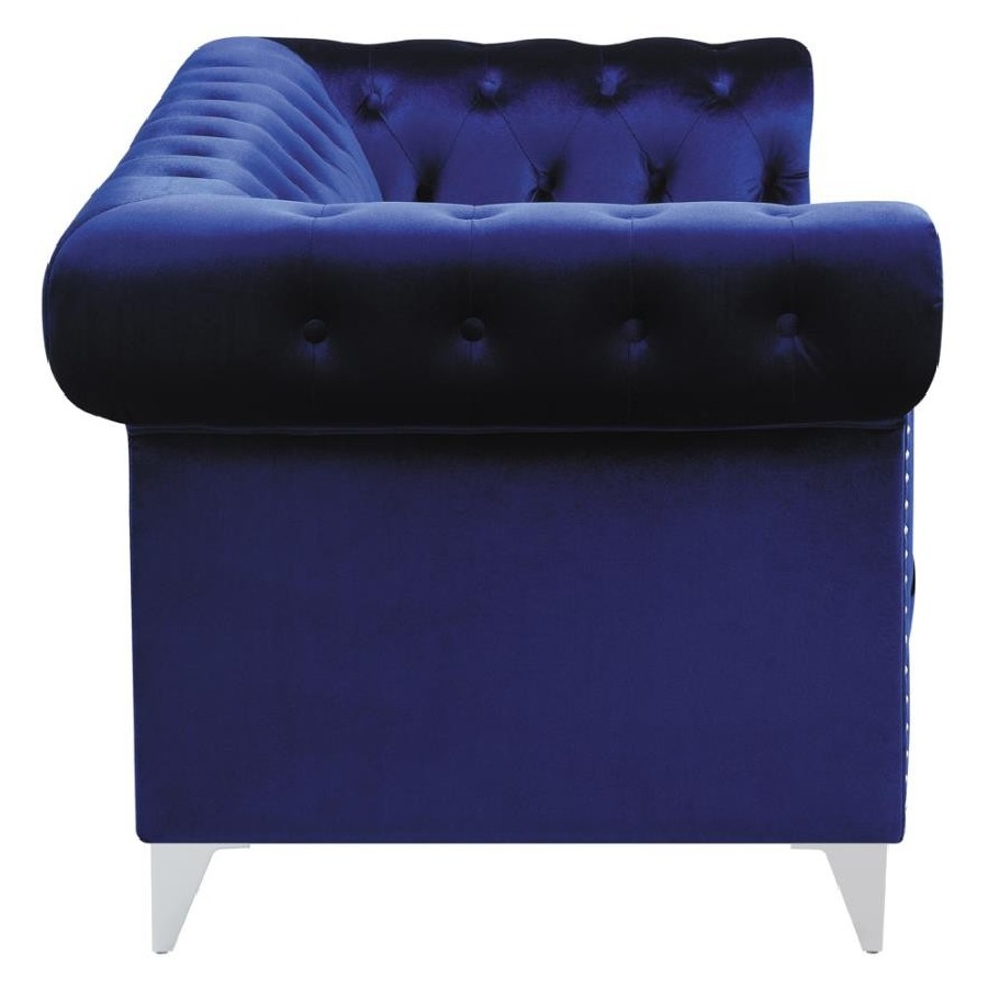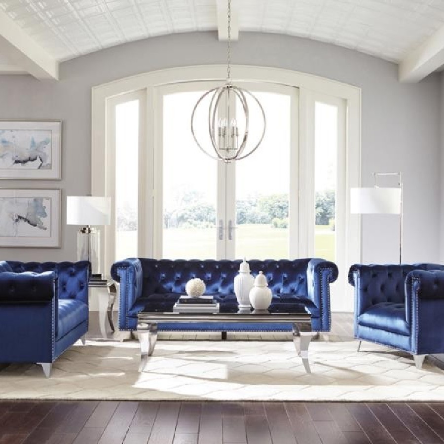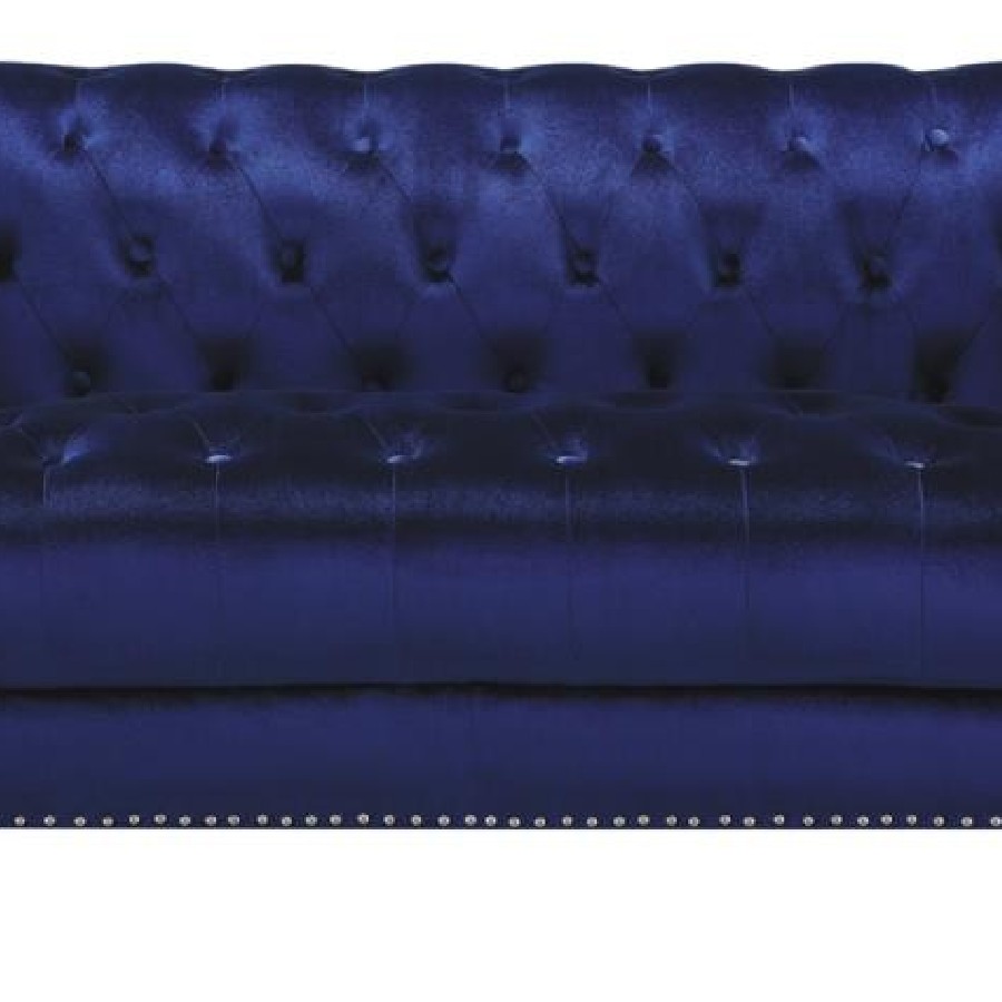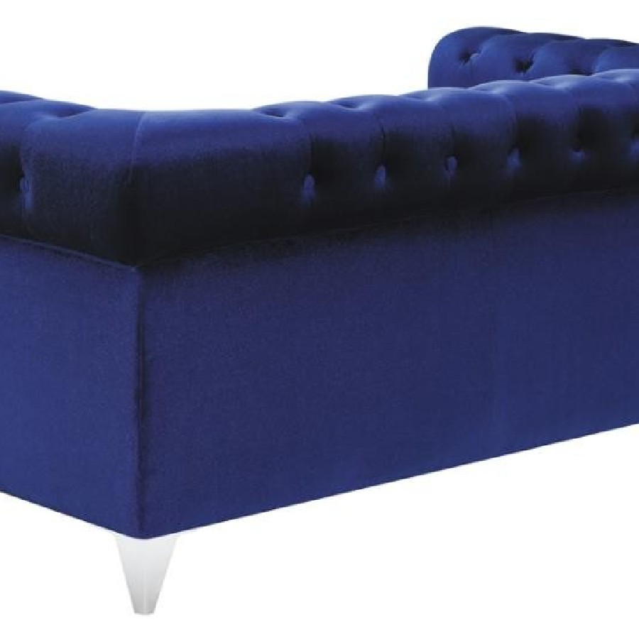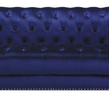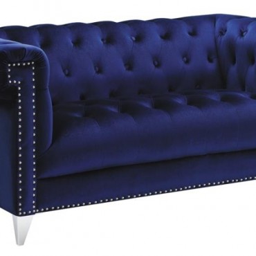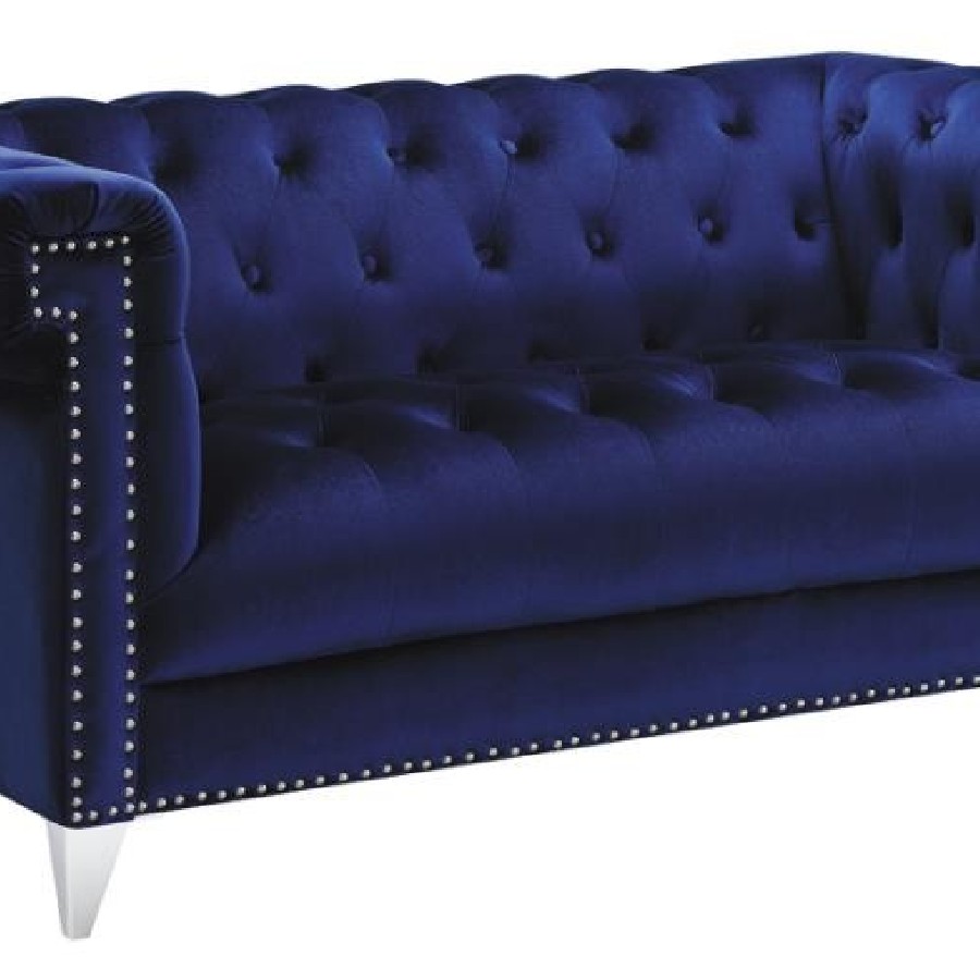 Admire the elegance and allure of this blue loveseat. Upholstered in a sensationally soft velvet, it'll be your favorite place to relax in style. Button tufting enhances the backrest of this piece. Tuxedo arms and nail head trim create an unforgettable impression. This piece is supported on tapered chrome legs.