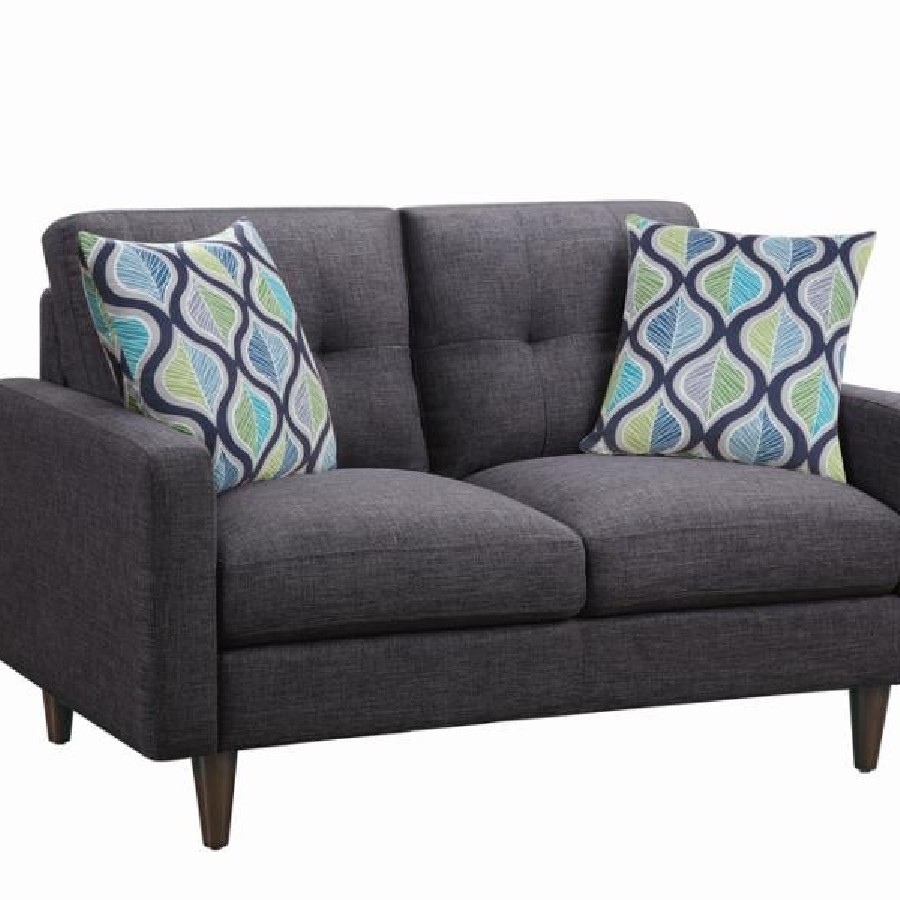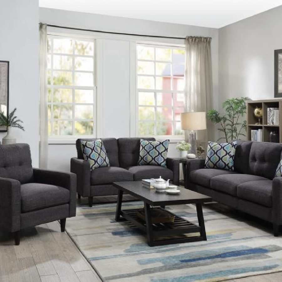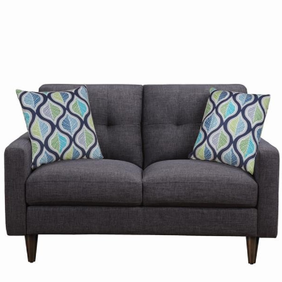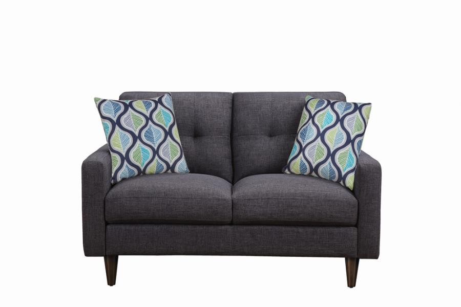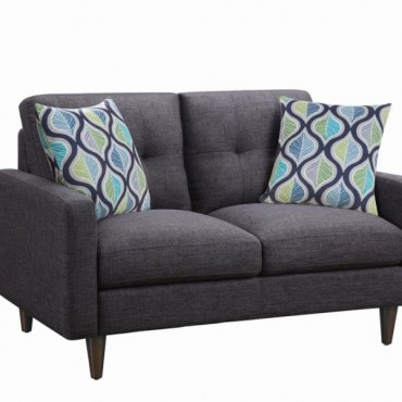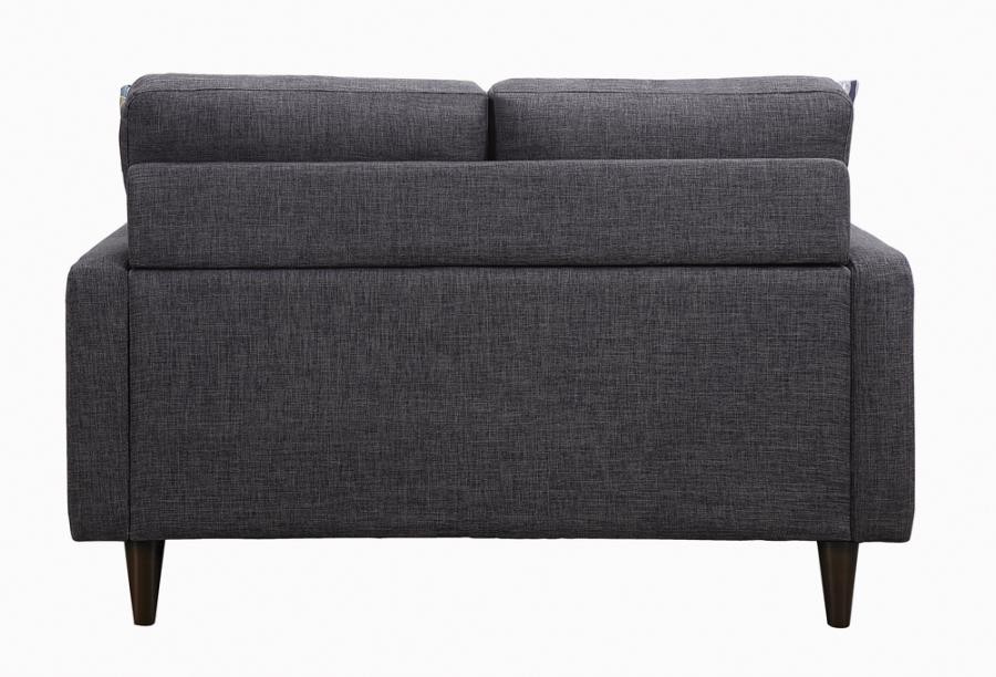 This loveseat features clean lines and cushioned comfort for hours of enjoyment. Sink into thick seat cushions for hours of watching your favorite shows or cuddling by a fire. Seat backs feature button tufting that's timeless and stylish. Loveseat also has round tapered legs and wide armrests for a solid modern appeal. Available in dark grey fabric that suits any living room decor.