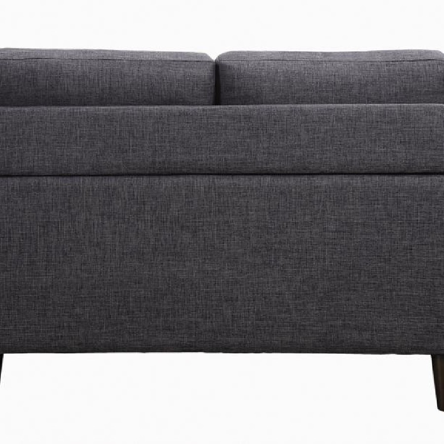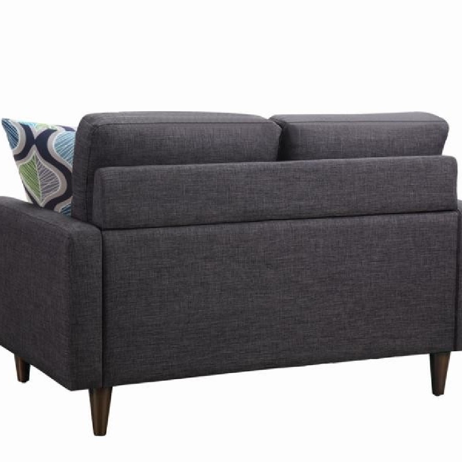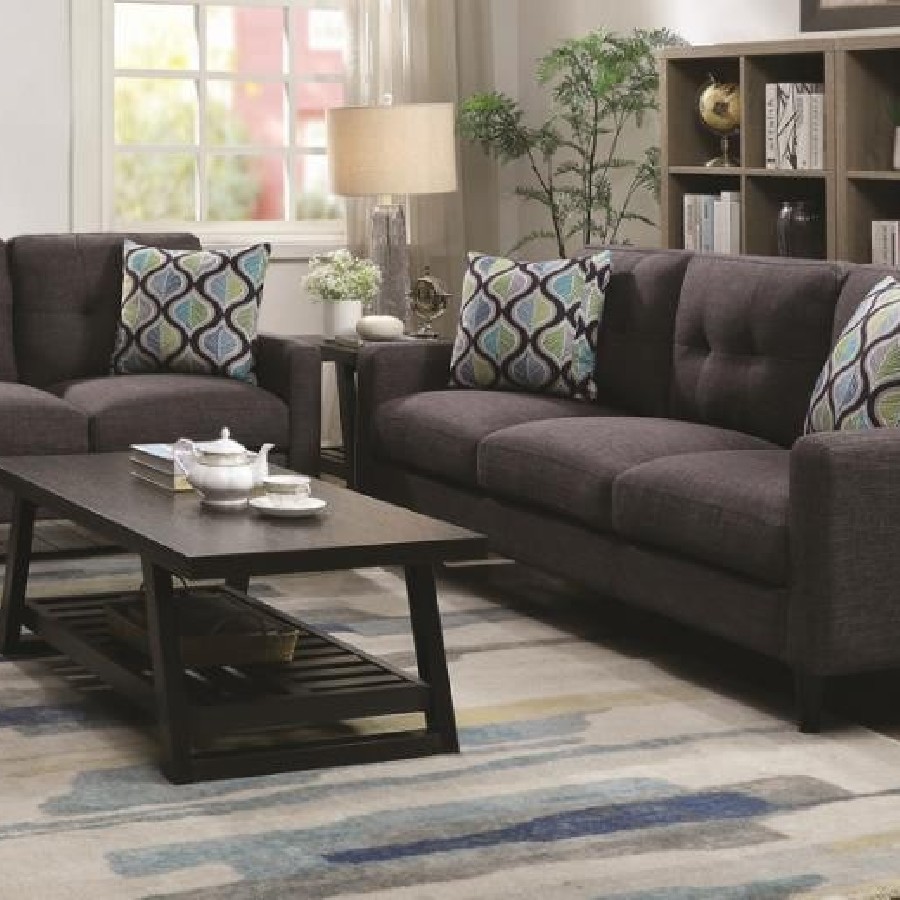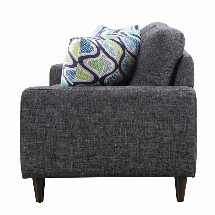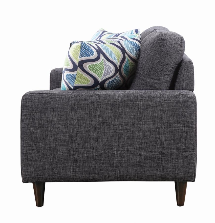 This loveseat features clean lines and cushioned comfort for hours of enjoyment. Sink into thick seat cushions for hours of watching your favorite shows or cuddling by a fire. Seat backs feature button tufting that's timeless and stylish. Loveseat also has round tapered legs and wide armrests for a solid modern appeal. Available in dark grey fabric that suits any living room decor.