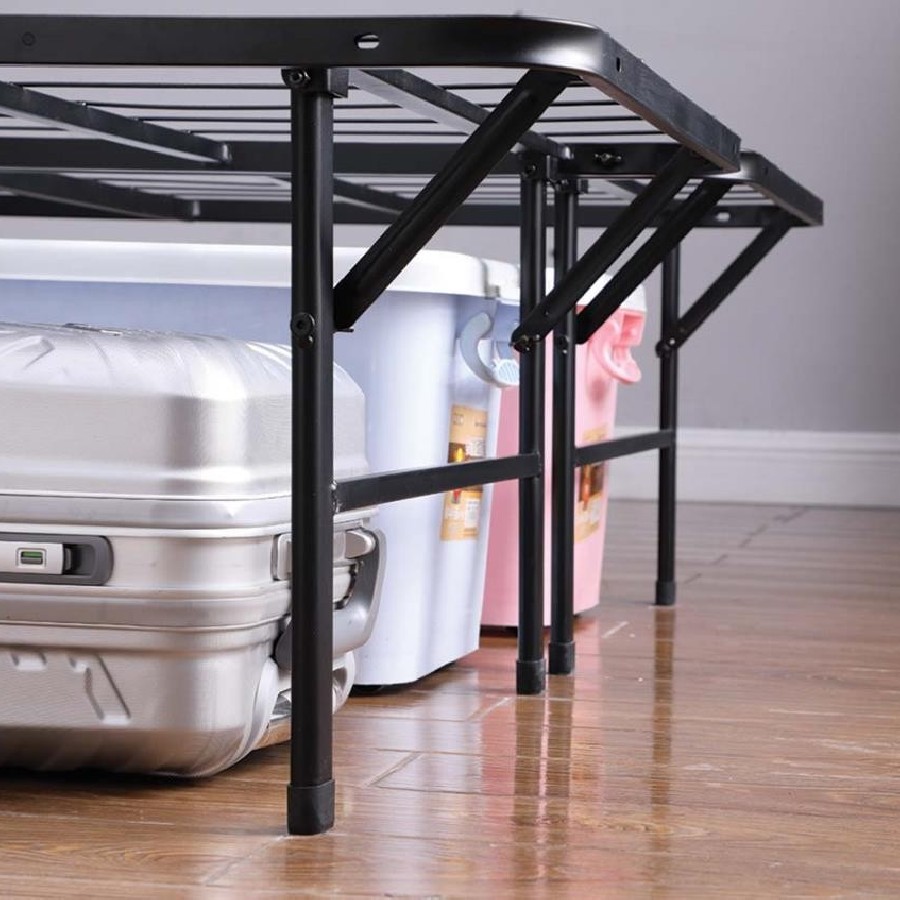 This simple transitional platform bed frame is both supportive and minimal. Easily storable and capable of folding, it can be pulled out when company visits. Its heavy gauge steel construction offers extra support, and has a black powder coated finish to protect against nicks while looking sleek and stylish. This bedframe can also be used as a standalone bed or to support a mattress to replace a box spring foundation. Included in this style are a variety of sizes to suit every mattress size.