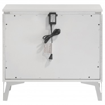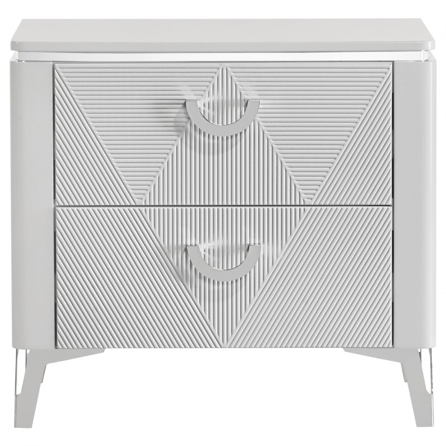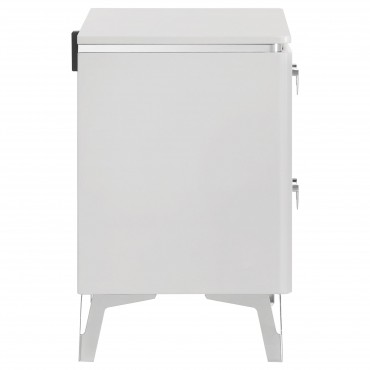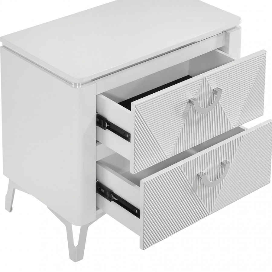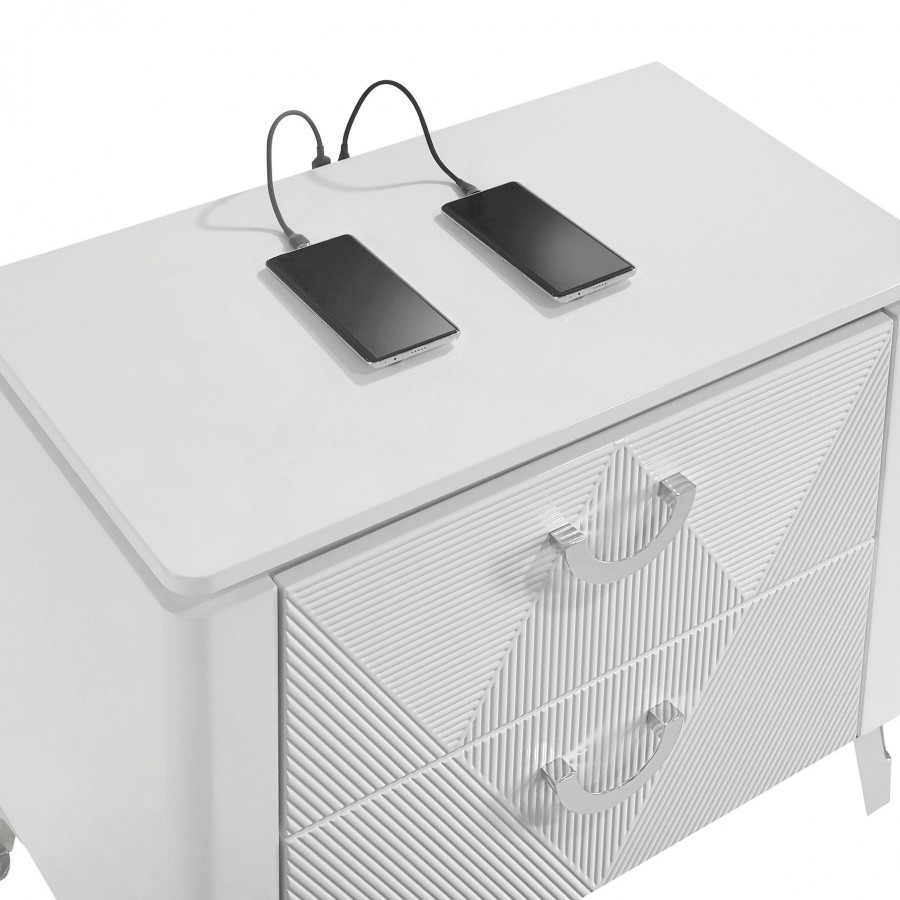 With its sculptural drawer fronts and crisp white high gloss finish, this nightstand brings a fresh, modern edge to the bedroom. Two spacious drawers feature dimensional geometric textures and sleek chrome-finished pulls, while the top drawer is lined in black felt for added refinement. Built-in USB-A and USB-C ports on the back offer convenient charging access. Metal extension glides and polished surface details complete this bold yet functional bedside table.