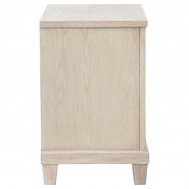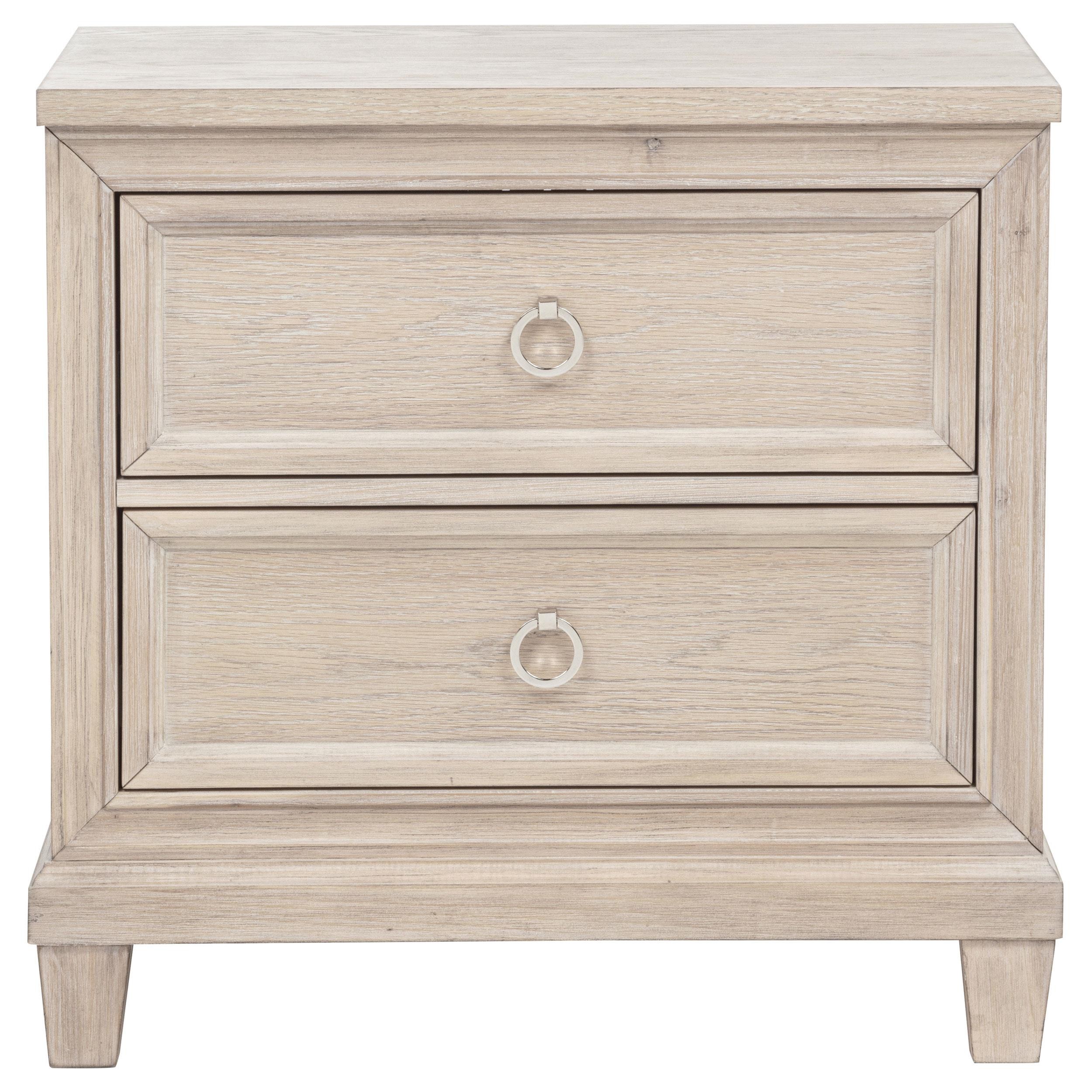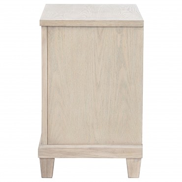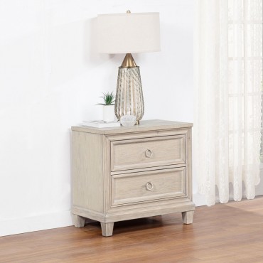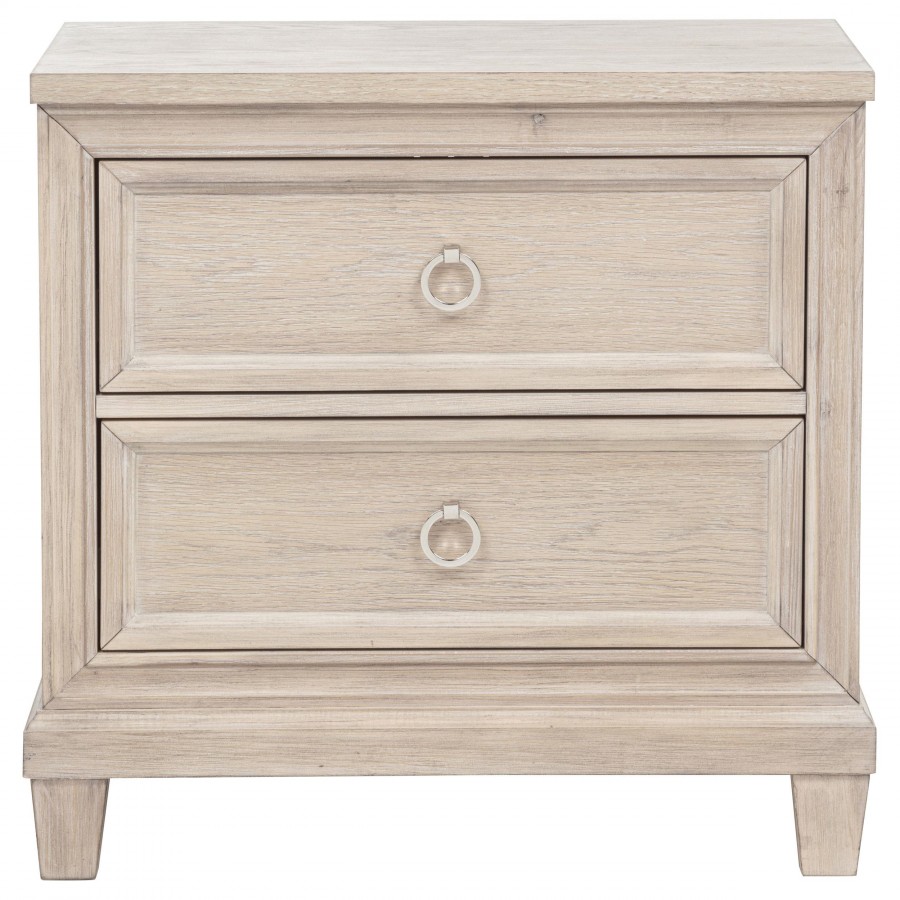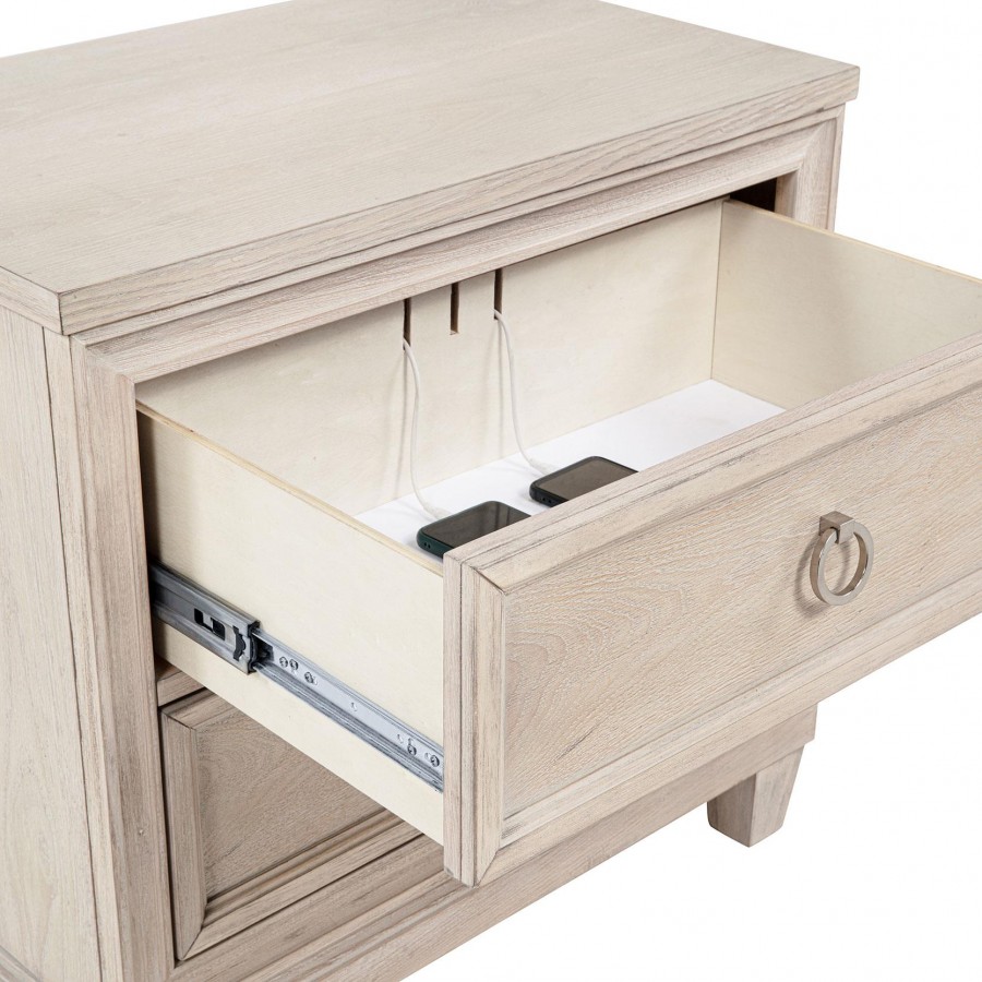 Effortlessly elegant and thoughtfully designed, this two-drawer nightstand brings refined charm to the bedside. Framed with stepped trim and finished in breezy washed oak, it offers a light, coastal-inspired presence. Polished nickel ring pulls add a glint of elegance, while built-in cable access discreetly manages devices tucked inside the upper drawer. Crafted from poplar, oak veneer, and engineered wood, it marries timeless style with everyday convenience.