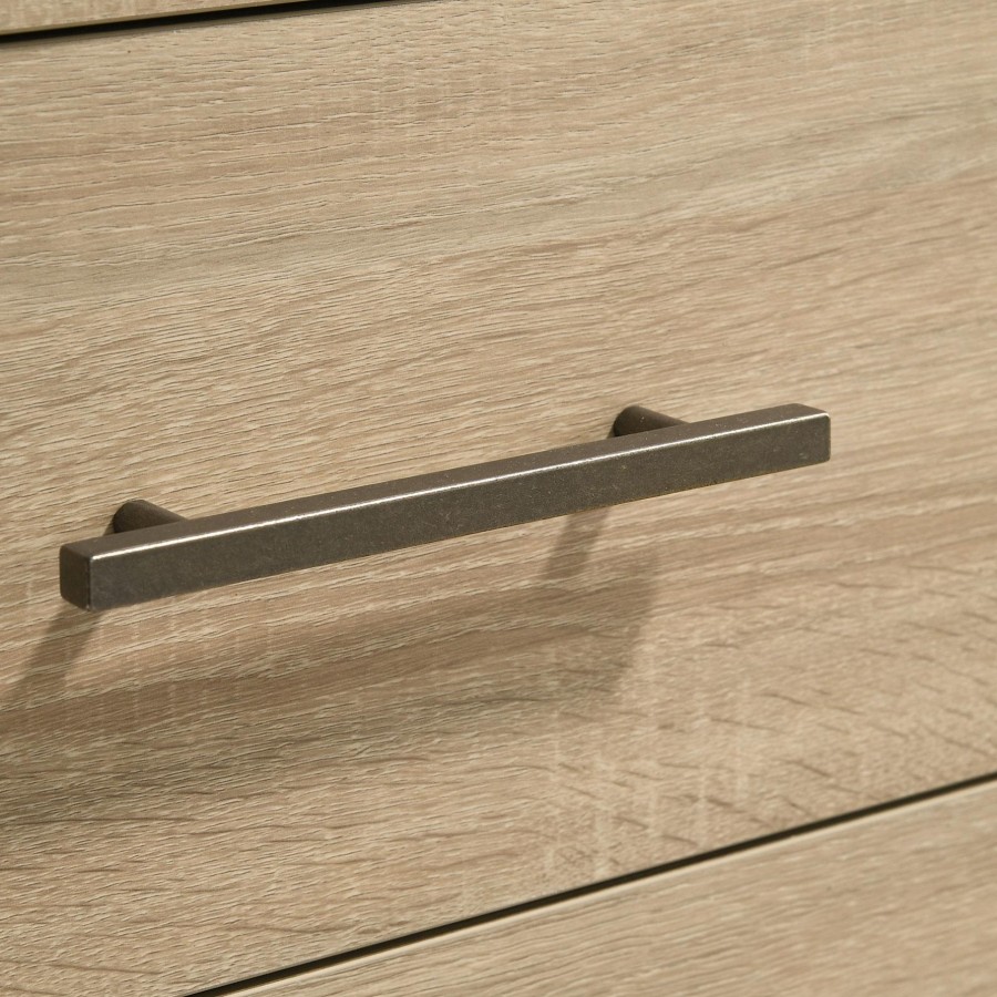 This two-drawer nightstand combines thoughtful utility with clean-lined modern design. Its boxy frame is finished in a soft light oak tone, accented by antique nickel hardware. Crafted from engineered wood with a scratch-resistant laminate veneer, it ensures daily durability. English dovetail drawers glide smoothly on 35mm metal extension glides, while hidden casters offer easy repositioning without compromising the nightstand’s clean base profile.