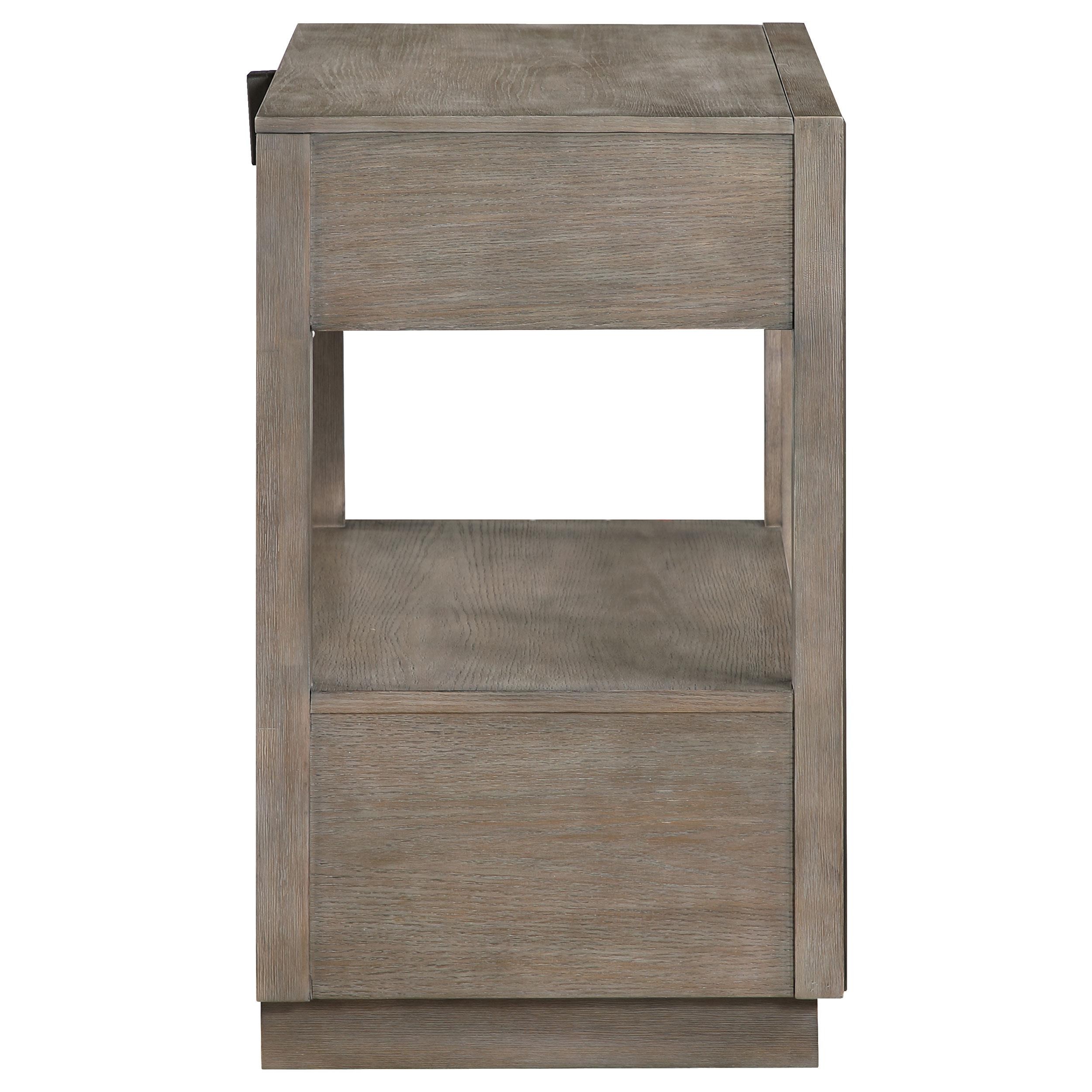 Complement your stylish bedroom with the addition of a modern two-drawer nightstand. In a taupe oak finish, it's got an approachable look and feel, complete with easy storage and a full open shelf that creates the perfect spot for books or an e-reader. Use the drawers to organize overnight essentials and personal items and choose the perfect table lamp to suit your style. The front of the case features mitered trim that adds dimension and depth. Extra-long bar drawer pulls contribute a hint of structure in an architectural presentation that's sure to impress.