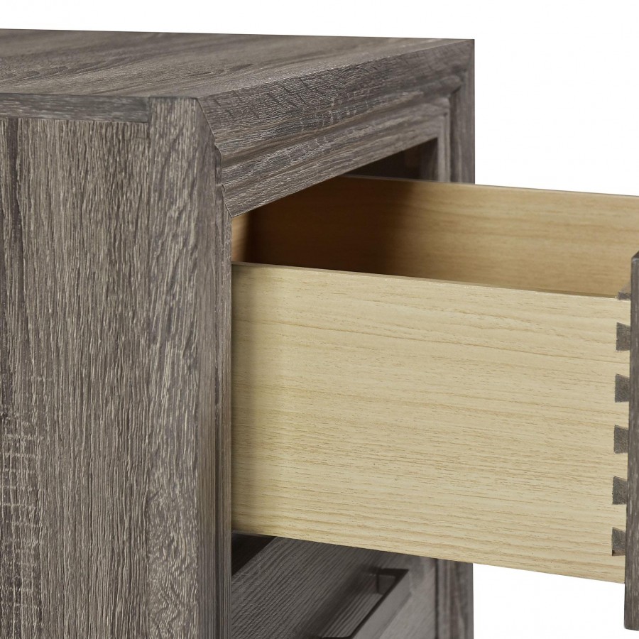 Augment your styling and approachable bedside with a transitional two-drawer nightstand. Delivering a touch of farmhouse charm and casual ambiance, it provides plenty of storage at your bedside. Its wide top is ideal for a reading light or a vase, offering a perfect space for personal touches. A brown oak wood grain finish graces laminate surfaces that are specifically engineered to resist scratches and dents. Bar handles decorate drawer fronts while mitered trim and tapered block legs add the perfect touch of precision and dimensionality.