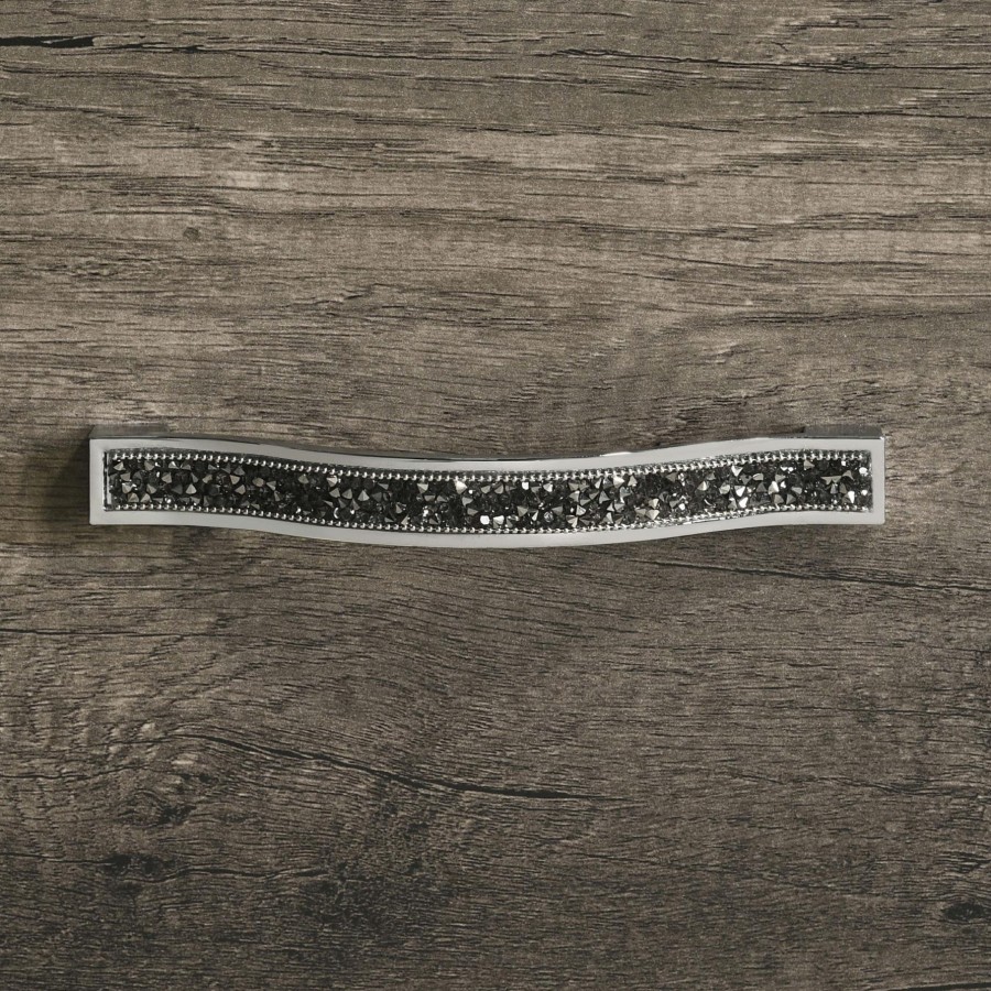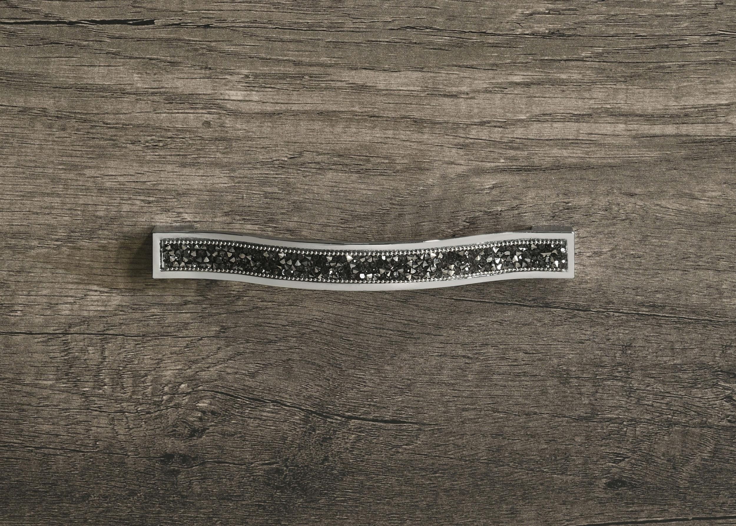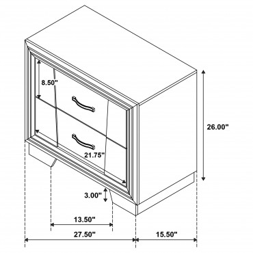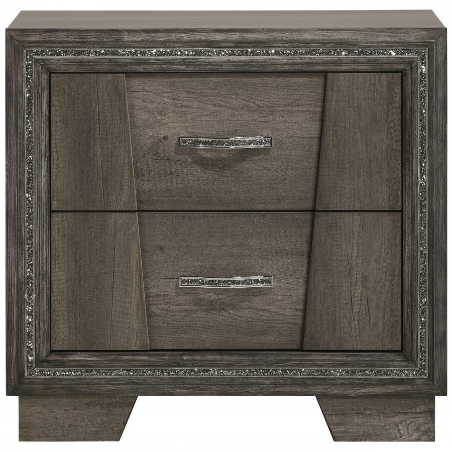 This two-drawer nightstand brings bold glamour and modern edge to any bedroom setting. A grey oak finish pairs with shimmering drawer pulls and inlaid glitter trim for a dazzling effect. The angular drawer fronts add sculptural interest, while black felt lining in the top drawer protects delicate items. Crafted from engineered wood, pine, and laminate veneer, this bedside table offers stylish utility and radiant charm.