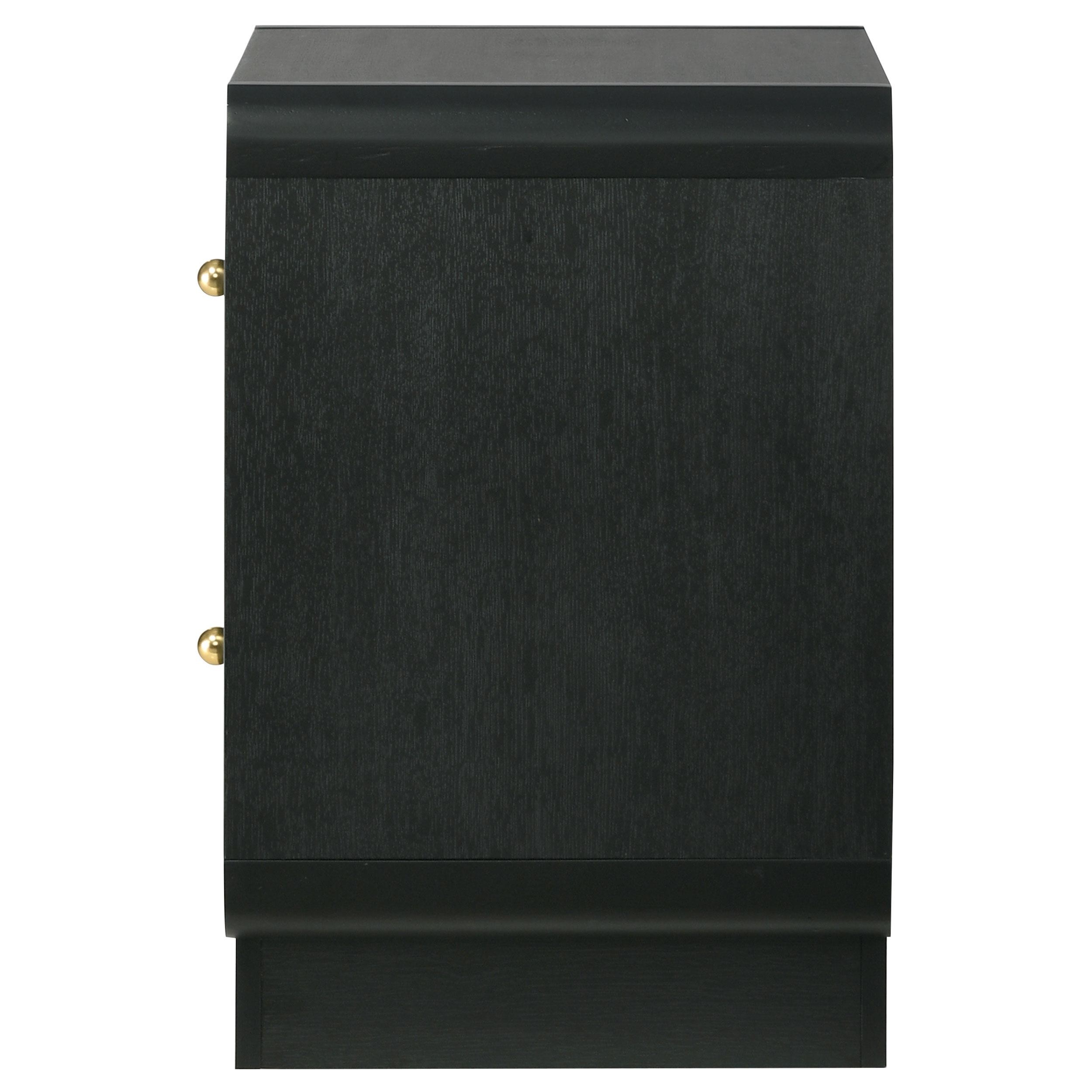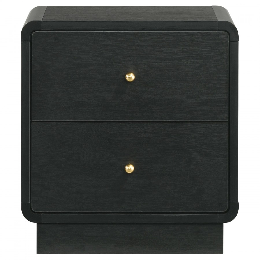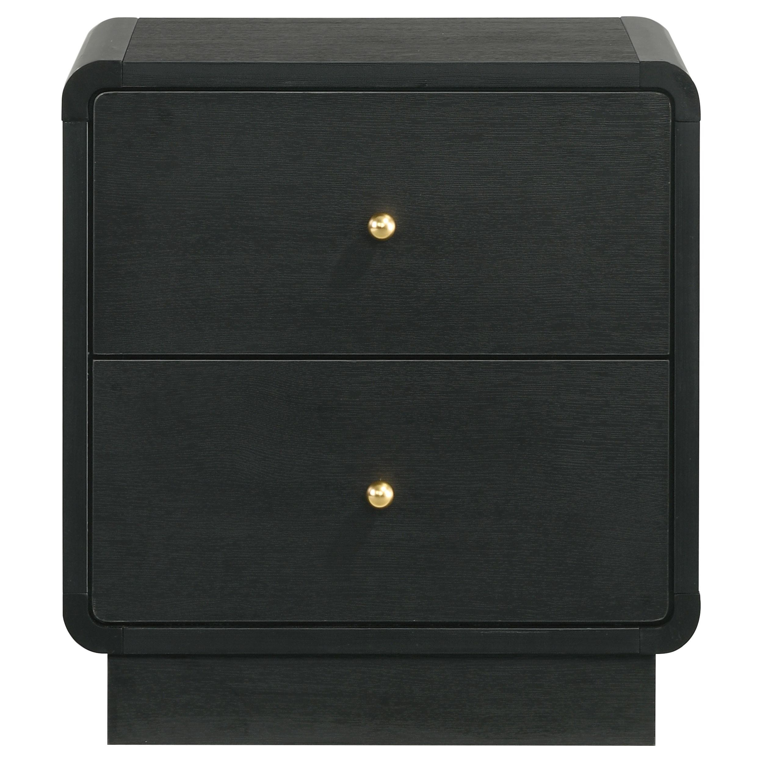 Put finishing touches on a sophisticated bedroom ensemble with this modern two-drawer nightstand. Offering roomy storage for overnight essentials, it features a rich black finish over melamine surfaces that are designed for longevity. The nightstand features a rounded corner case, creating a softened effect in a luxurious space. Drawer fronts are complemented with brass-finished ball knobs, adding the perfect hint of warmth and sophistication. A recessed base completes the look, while metal drawer glides provide for smooth, seamless operation.
