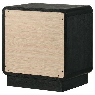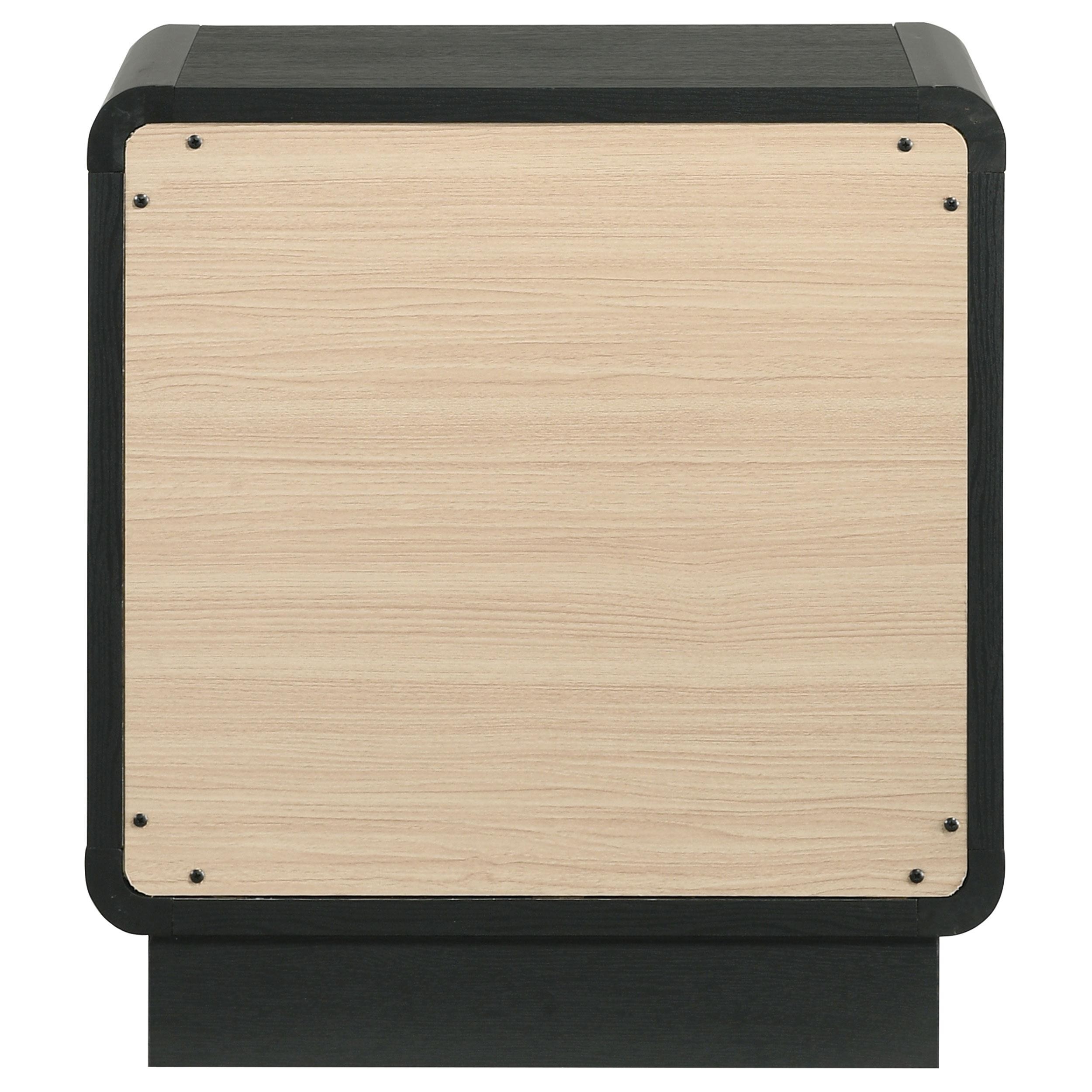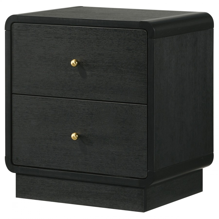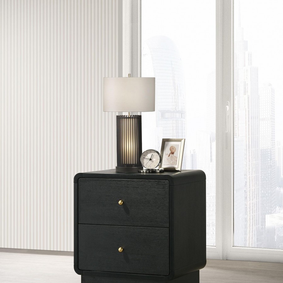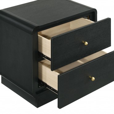 Put finishing touches on a sophisticated bedroom ensemble with this modern two-drawer nightstand. Offering roomy storage for overnight essentials, it features a rich black finish over melamine surfaces that are designed for longevity. The nightstand features a rounded corner case, creating a softened effect in a luxurious space. Drawer fronts are complemented with brass-finished ball knobs, adding the perfect hint of warmth and sophistication. A recessed base completes the look, while metal drawer glides provide for smooth, seamless operation.