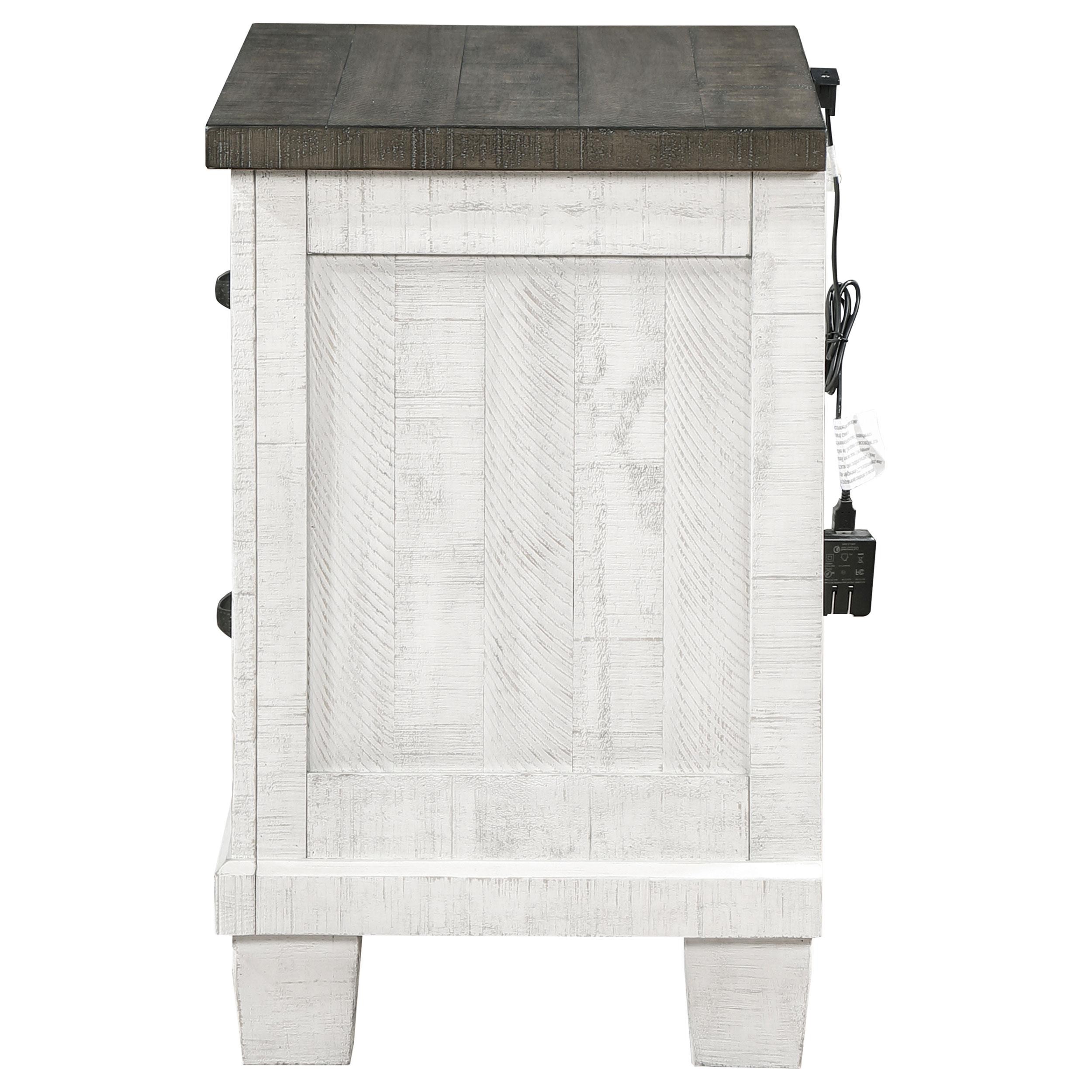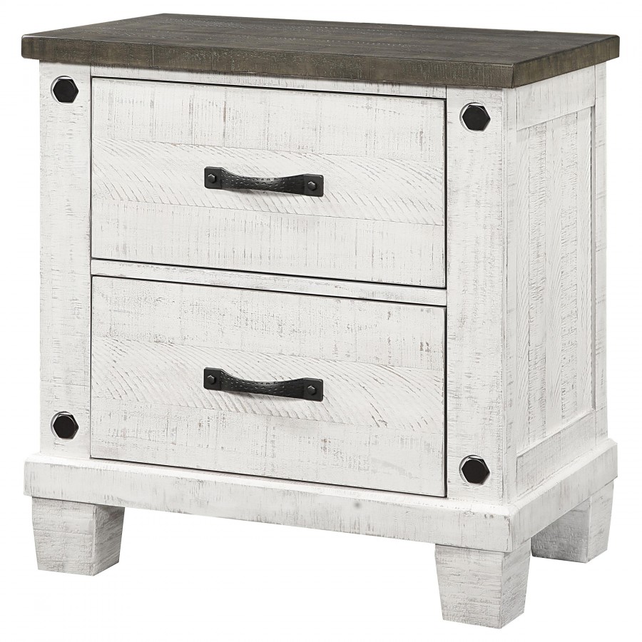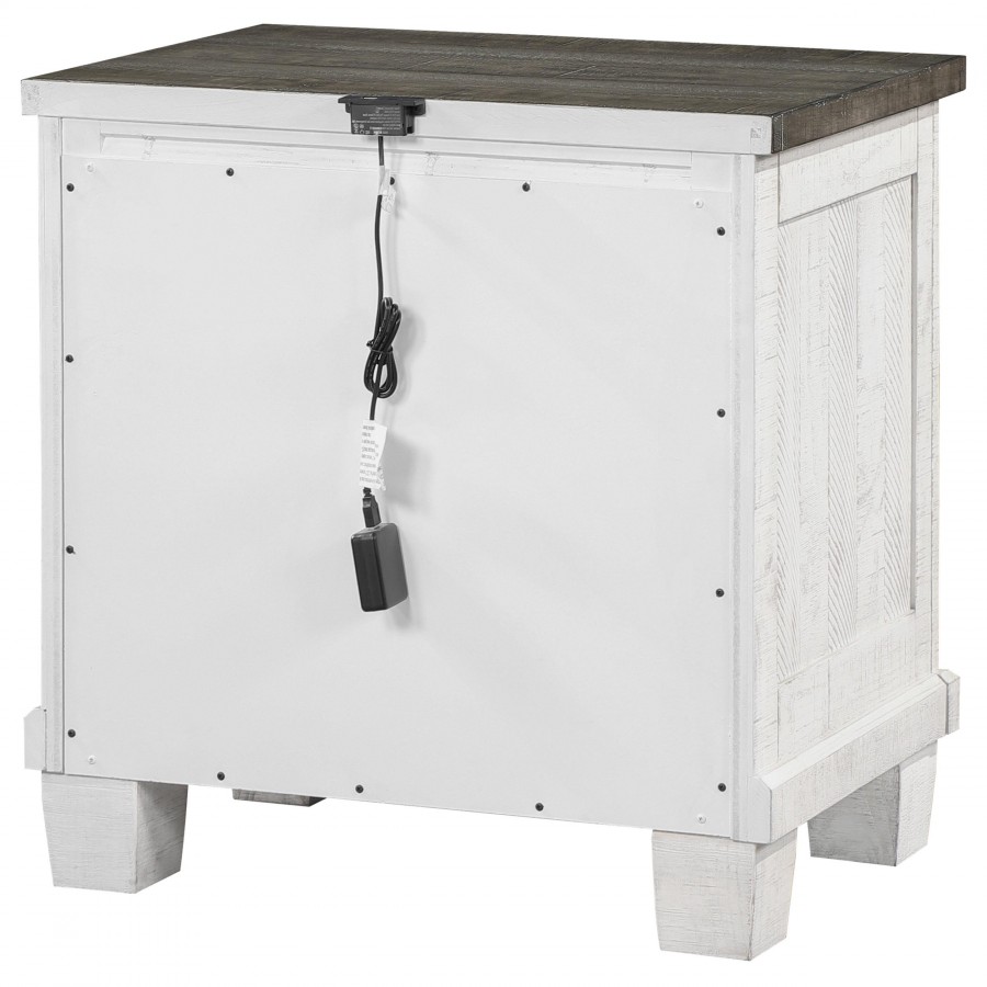 Roughhewn details bring rugged industrialism to the rustic farmhouse character of this two-drawer nightstand. Solidly built in pine wood and veneer, it features a distressed gray tabletop paired with a distressed white finish over its drawer case and base, creating dynamic contrast. The front of the case is punctuated with four hexagonal bolt heads that play into its rugged motif to perfection. Two roomy drawers includes dark gunmetal finish handles for easy access to bedside essentials and personal items. Finally, the nightstand is made modern with one standard USB port and one Type-C port that help keep all your personal electronics charged and ready for the day ahead.