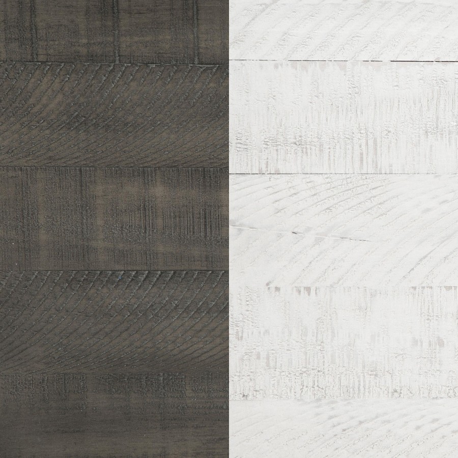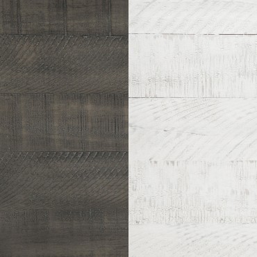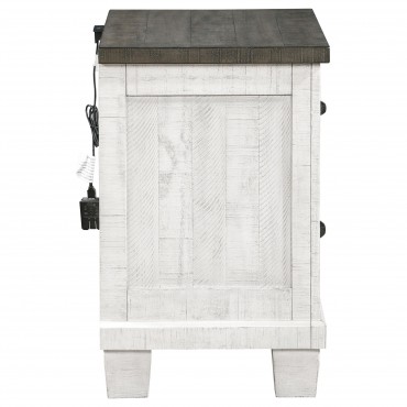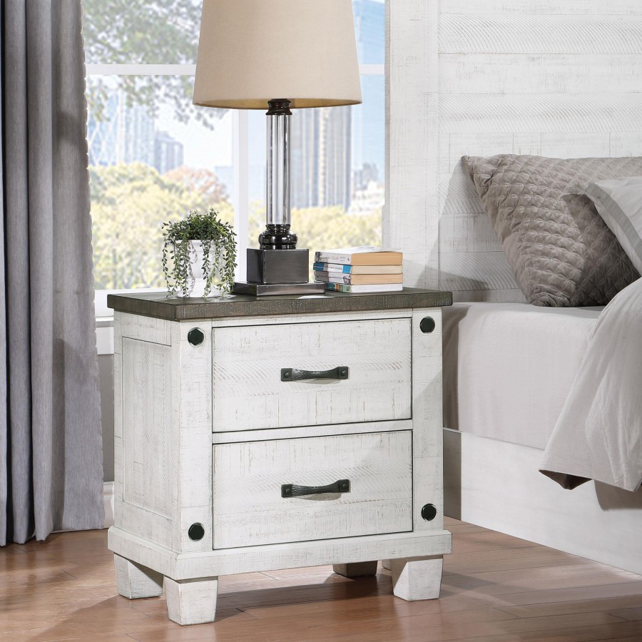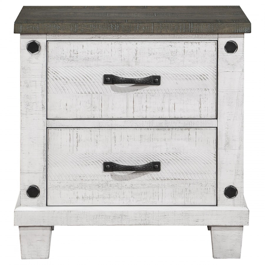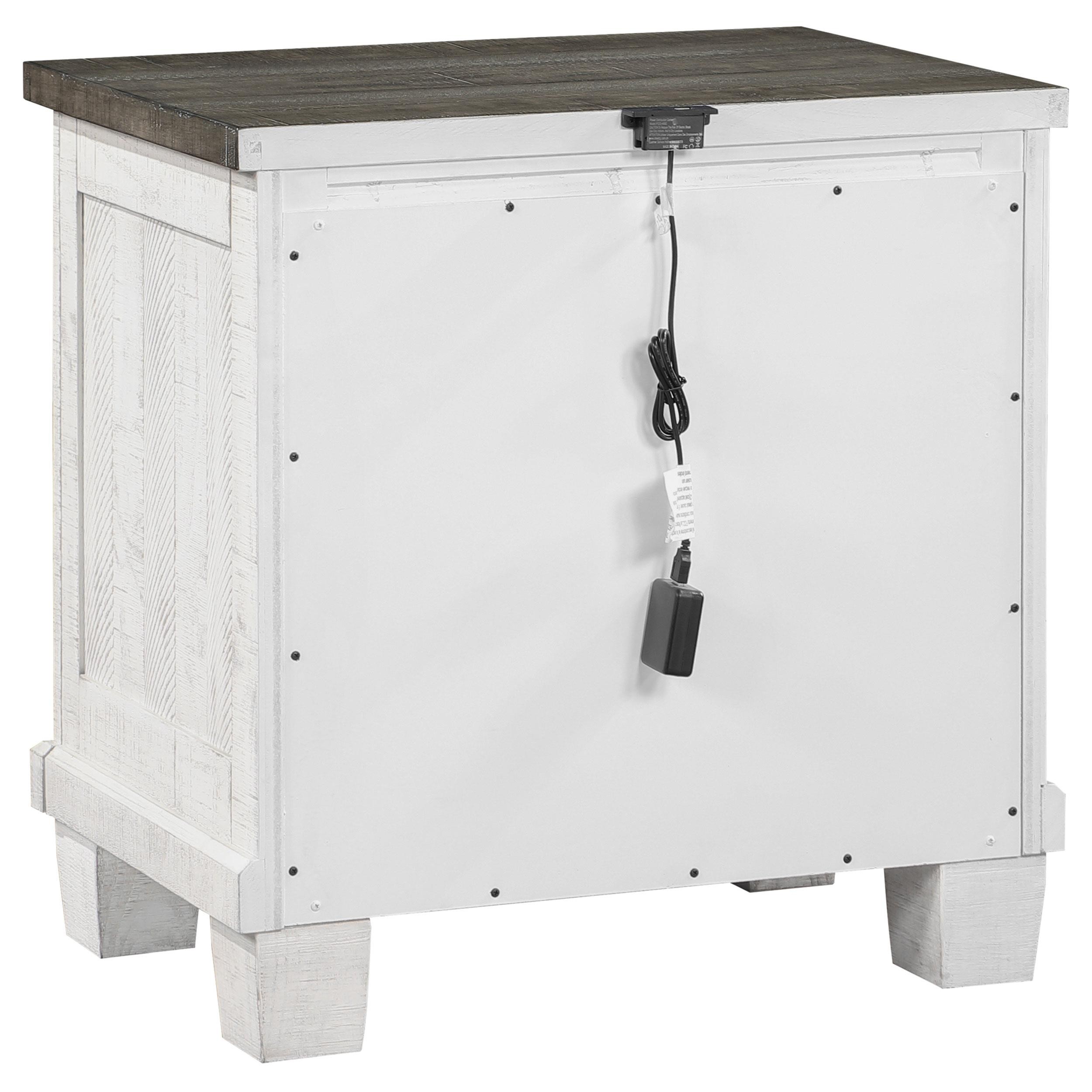 Roughhewn details bring rugged industrialism to the rustic farmhouse character of this two-drawer nightstand. Solidly built in pine wood and veneer, it features a distressed gray tabletop paired with a distressed white finish over its drawer case and base, creating dynamic contrast. The front of the case is punctuated with four hexagonal bolt heads that play into its rugged motif to perfection. Two roomy drawers includes dark gunmetal finish handles for easy access to bedside essentials and personal items. Finally, the nightstand is made modern with one standard USB port and one Type-C port that help keep all your personal electronics charged and ready for the day ahead.