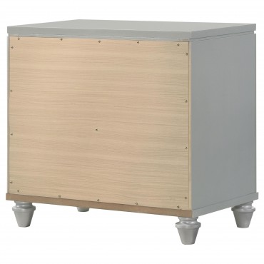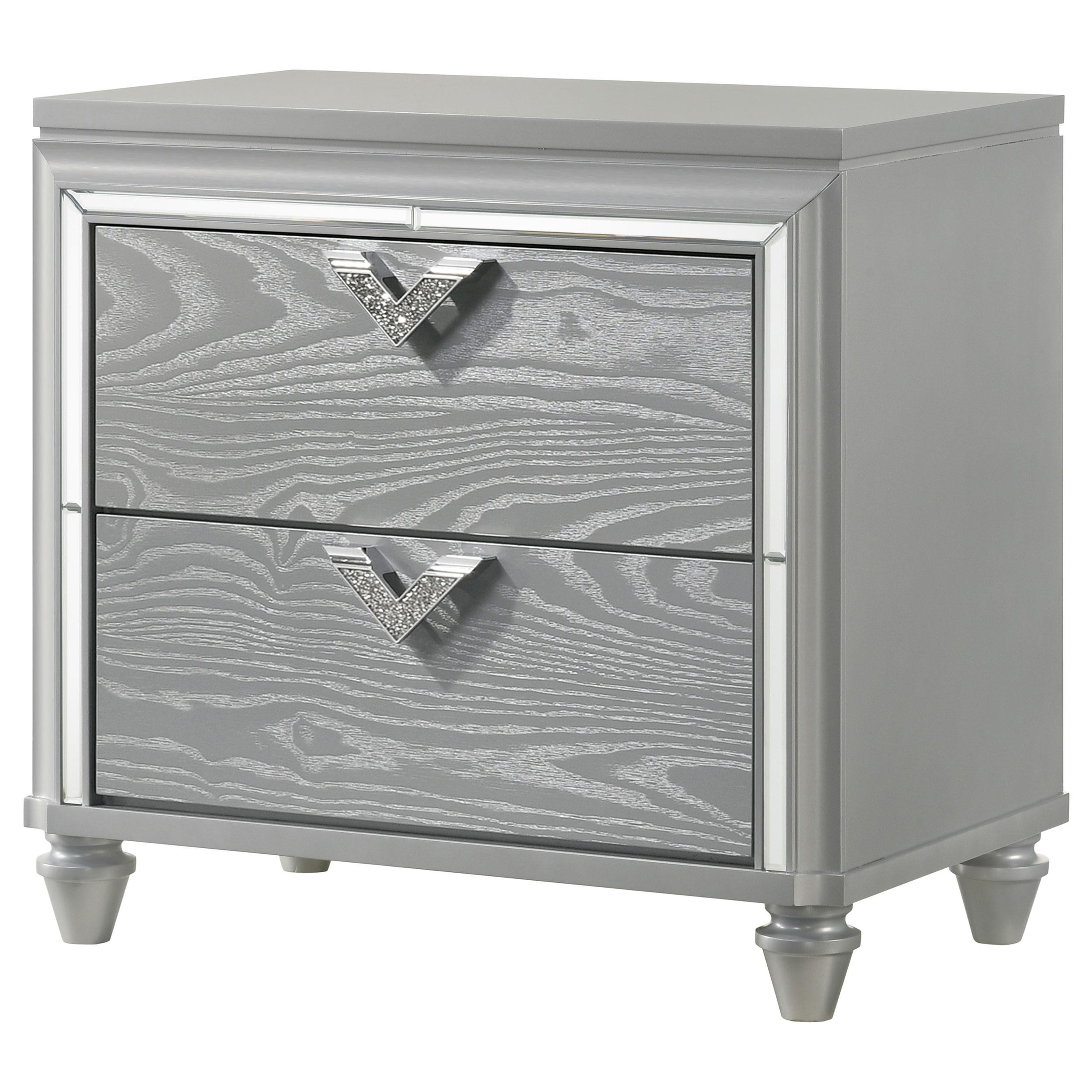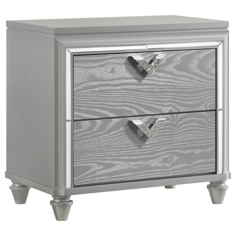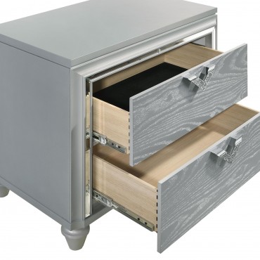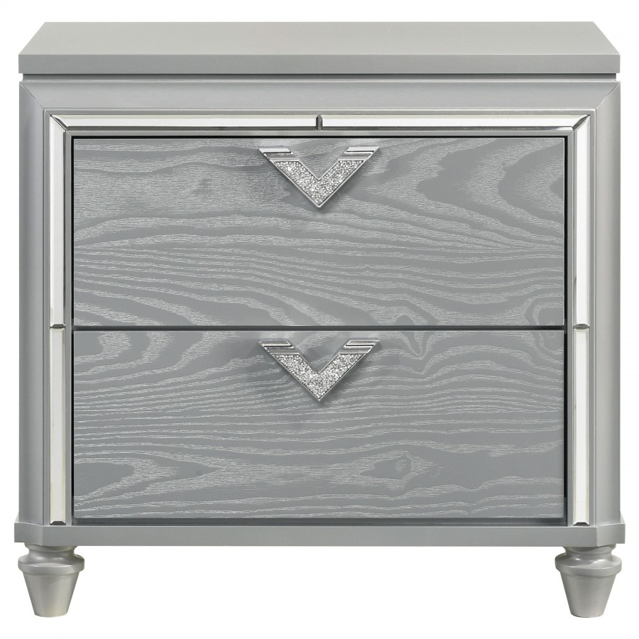 Shimmering details create the glamorous vibe of this modern two-drawer nightstand. While two drawers create ample bedside storage, the nightstand creates a chic accent beside your bed. It showcases a light silver finish with wood grain accents on its drawer fronts and shiny trim that adds dimensionality. Each drawer is accented with a V-shaped, glittering pull that adds jeweled flair and sophistication. Its top drawer features felt lining, adding protection for valuables and electronics.