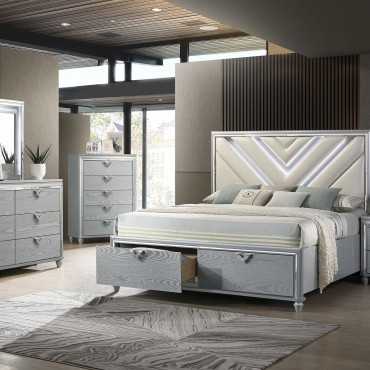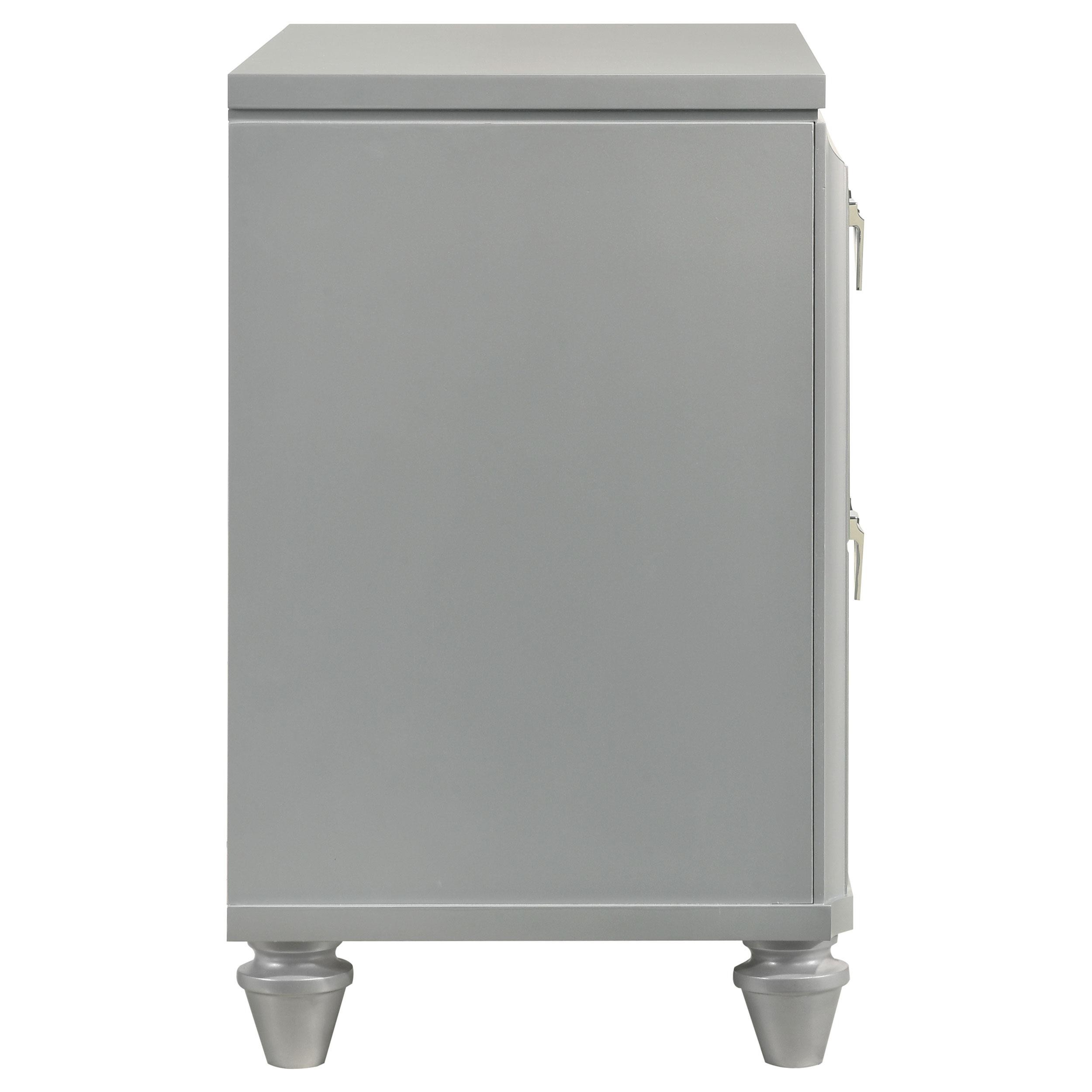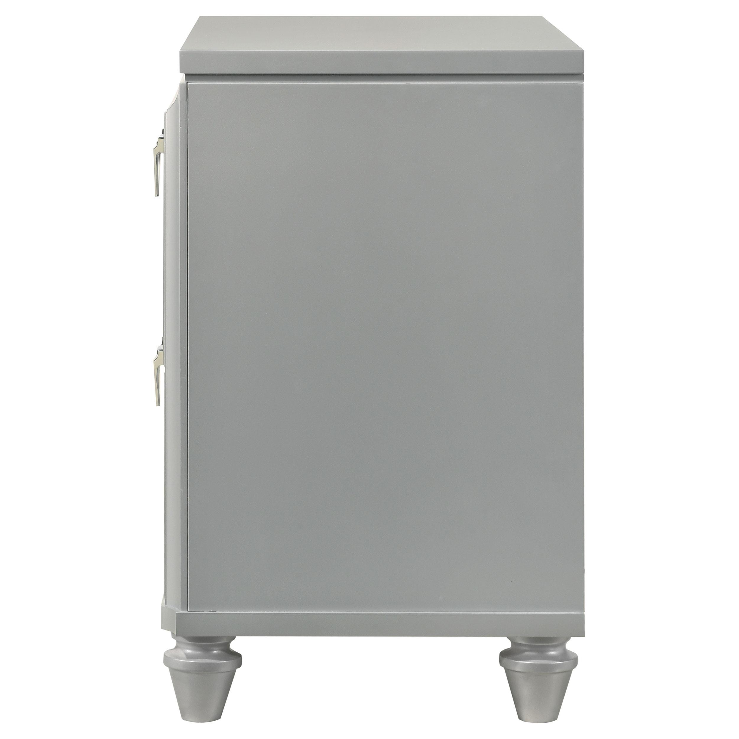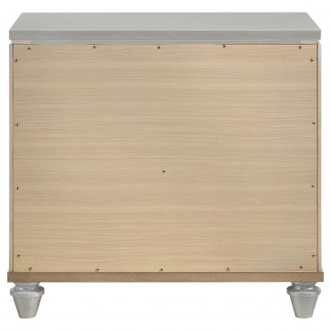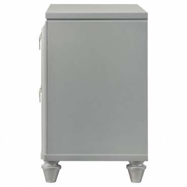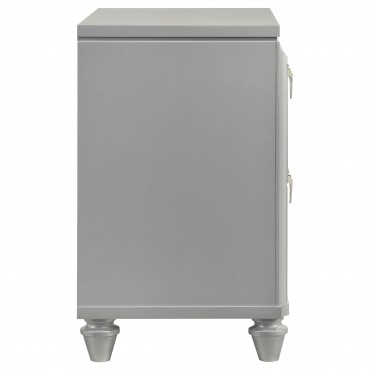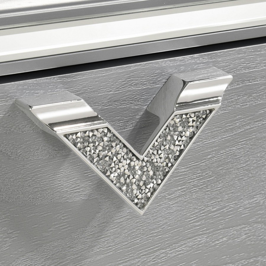 Shimmering details create the glamorous vibe of this modern two-drawer nightstand. While two drawers create ample bedside storage, the nightstand creates a chic accent beside your bed. It showcases a light silver finish with wood grain accents on its drawer fronts and shiny trim that adds dimensionality. Each drawer is accented with a V-shaped, glittering pull that adds jeweled flair and sophistication. Its top drawer features felt lining, adding protection for valuables and electronics.