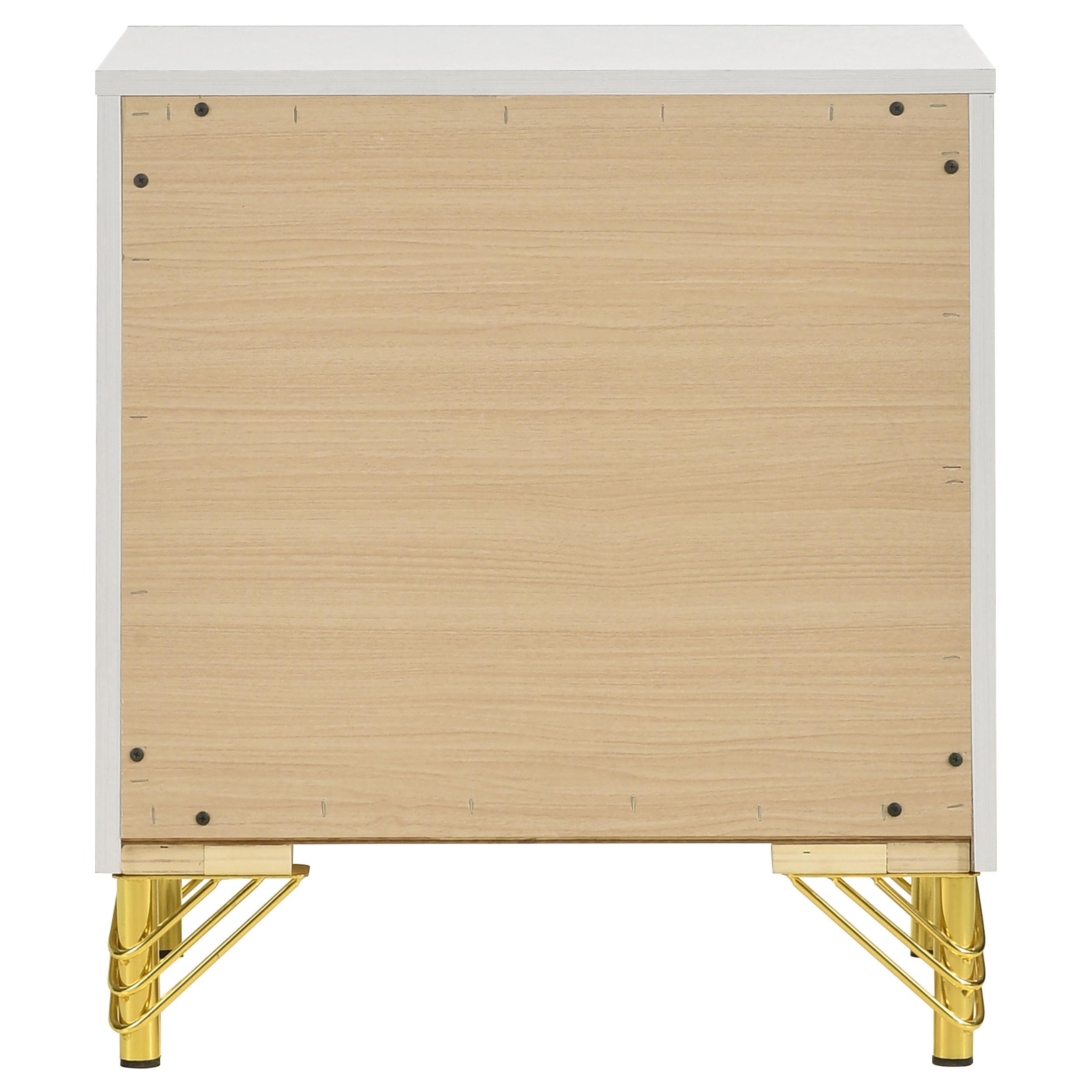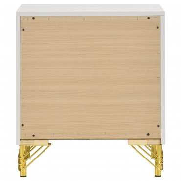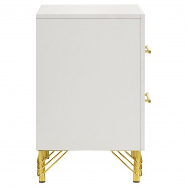Gleaming gold trim captures attention on a modern two-drawer nightstand. Perfect for your sophisticated bedside, it boasts a bright white finish case that offers the perfect touch of depth with its gold trim. A pair of long bar pulls decorate drawer fronts. Hairpin style legs offer vintage flair and exceptional elegance. Two drawers add plentiful bedside storage, offering a place to ruck away personal items and overnight essentials.
