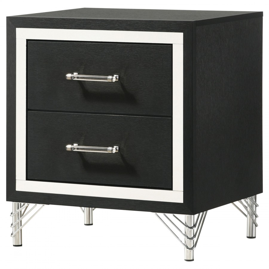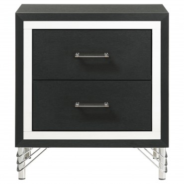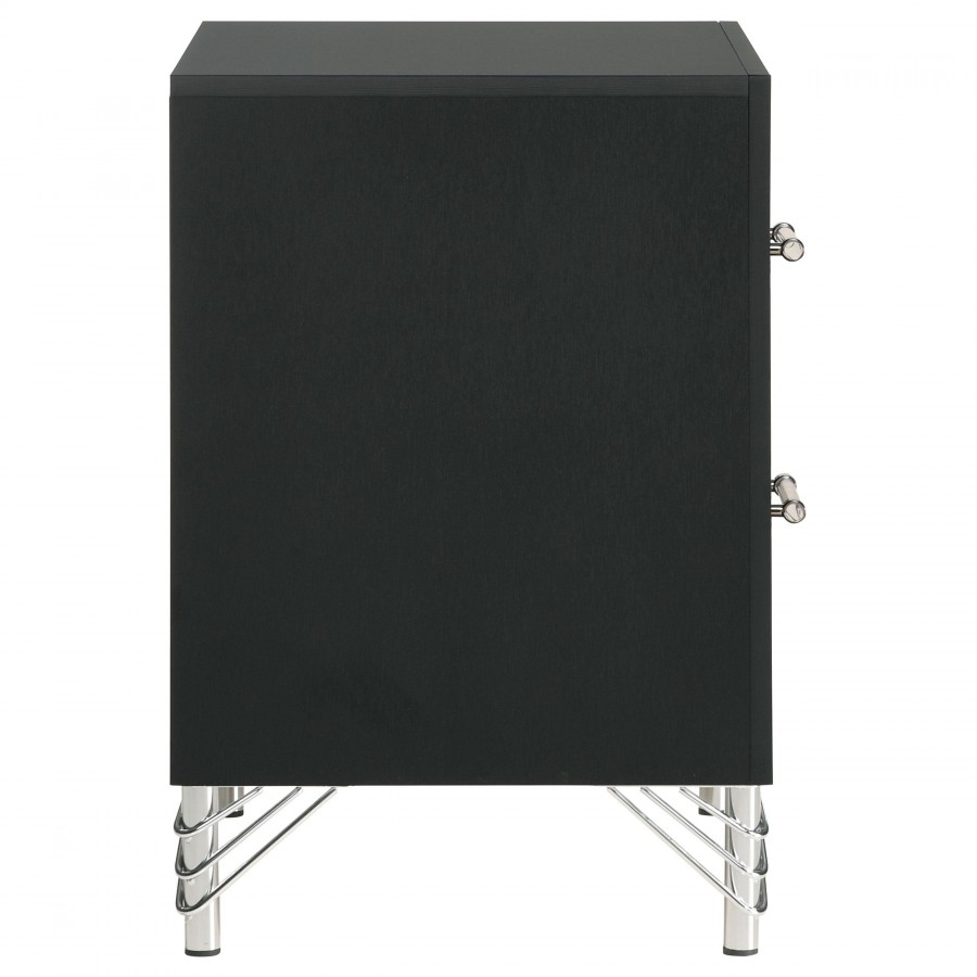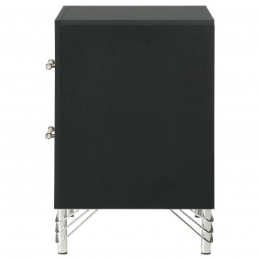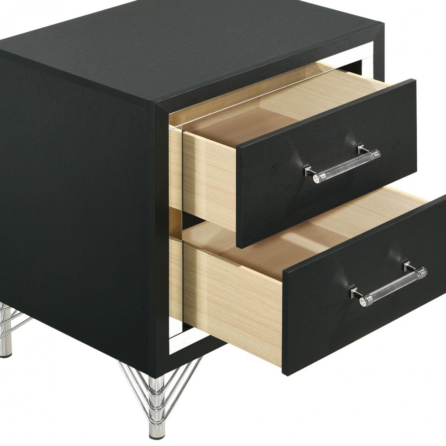 Gleaming chrome trim captures attention on a modern two-drawer nightstand. Perfect for your sophisticated bedside, it boasts a bold black finish case that offers the perfect touch of depth with its chrome trim. A pair of long bar pulls decorate drawer fronts. Hairpin style legs offer vintage flair and exceptional elegance. Two drawers add plentiful bedside storage, offering a place to ruck away personal items and overnight essentials.