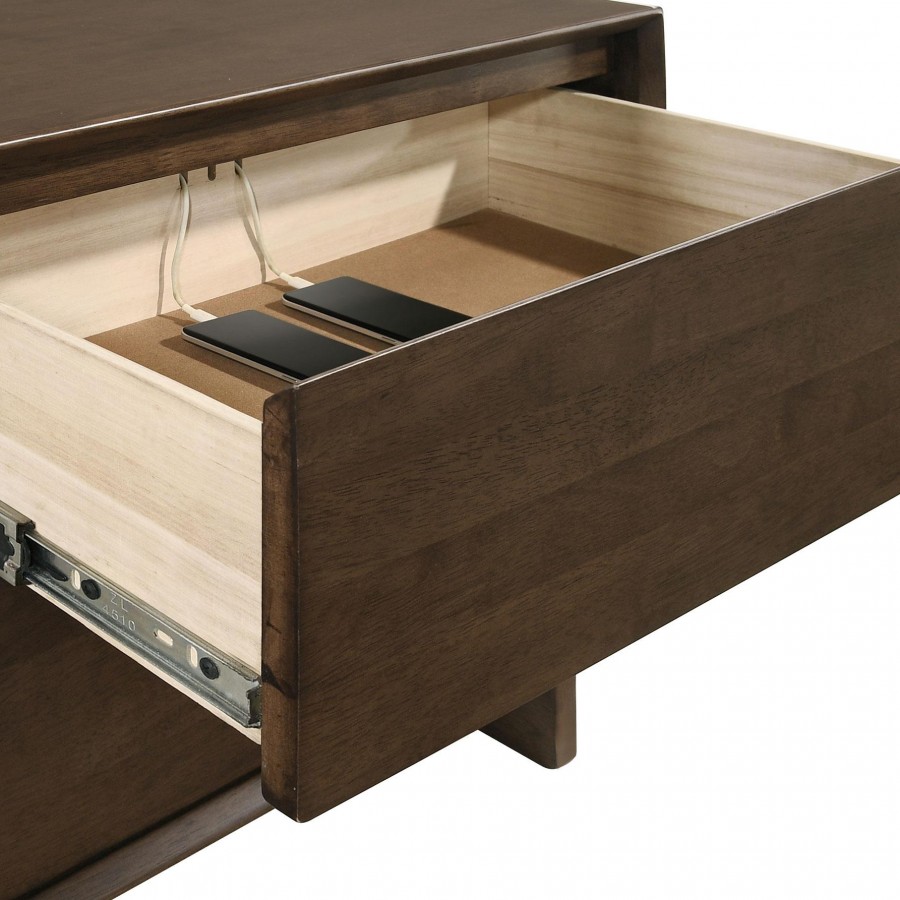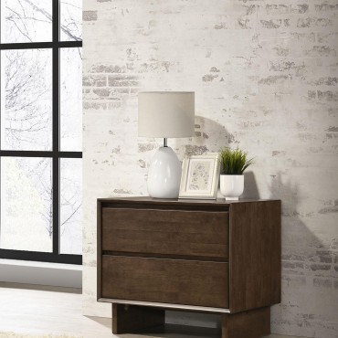 Add easy storage at your bedside with a modern two-drawer nightstand. Delivering streamlined style and a fresh, clean presentation, the nightstand boasts a warm brown wood grain finish. Its drawers are roomy and useful, complete with felt lining in the top, adding protection for everything from accessories to electronics. Mitered trim adds a sense of precision to the drawer case, while fingertip pulls ensure a smooth look and feel. Wide legs add stability and structure, while delivering lift that adds airy flair in a modern space.