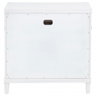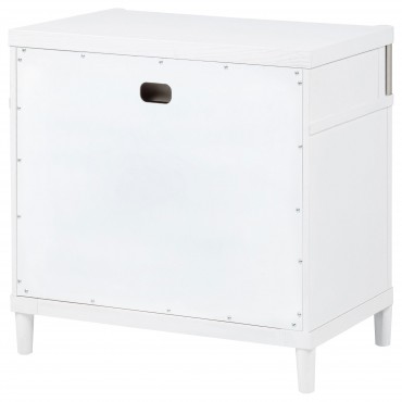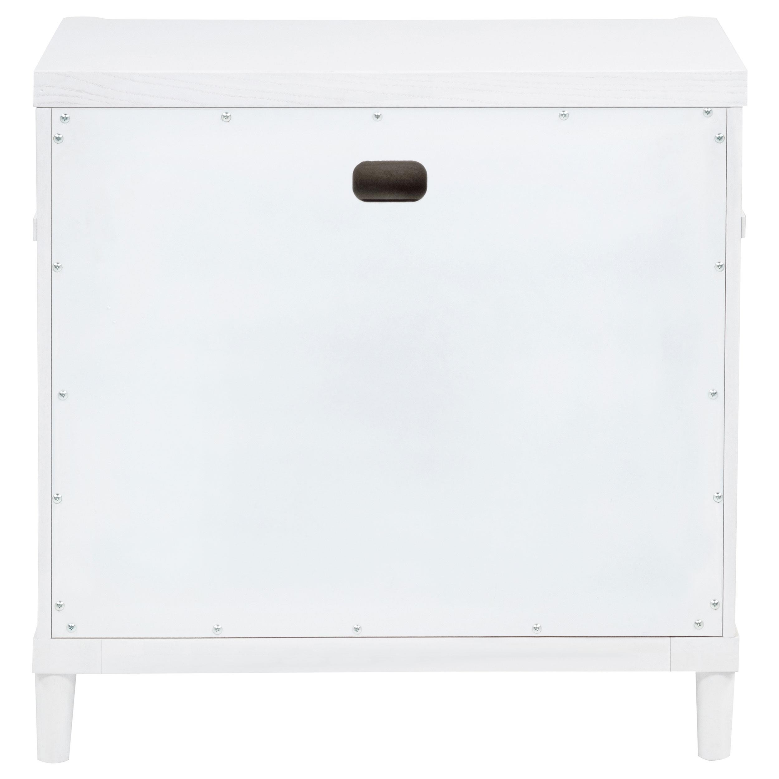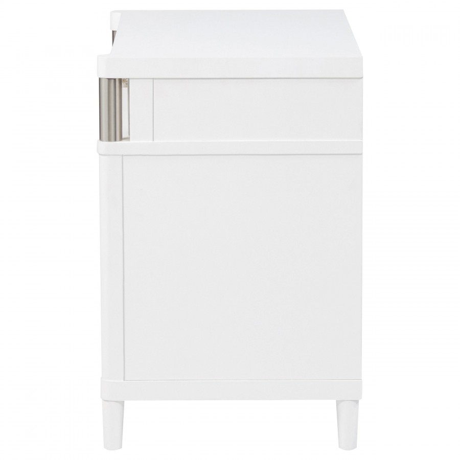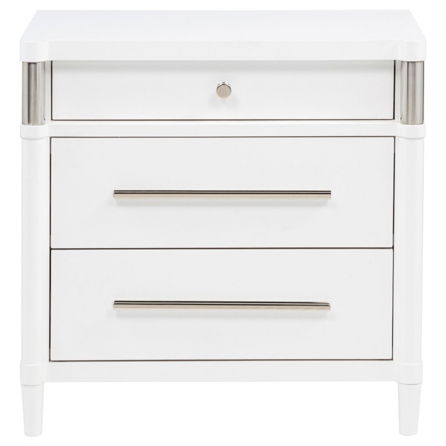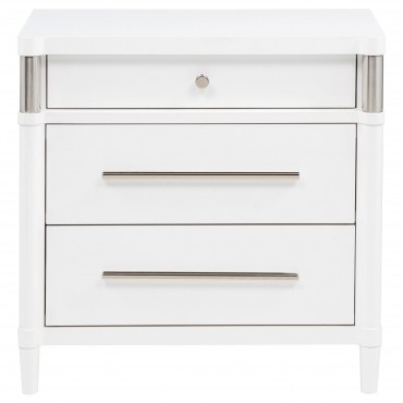 This three-drawer nightstand blends subtle curves with thoughtful convenience. Vertical metal accents and brushed nickel pulls contrast a white finish, while the felt-lined top drawer includes discreet cord access for device charging. Built from solid rubberwood, engineered wood, and a smooth laminate veneer, it offers smooth drawer movement and refined bedside storage in a compact silhouette.