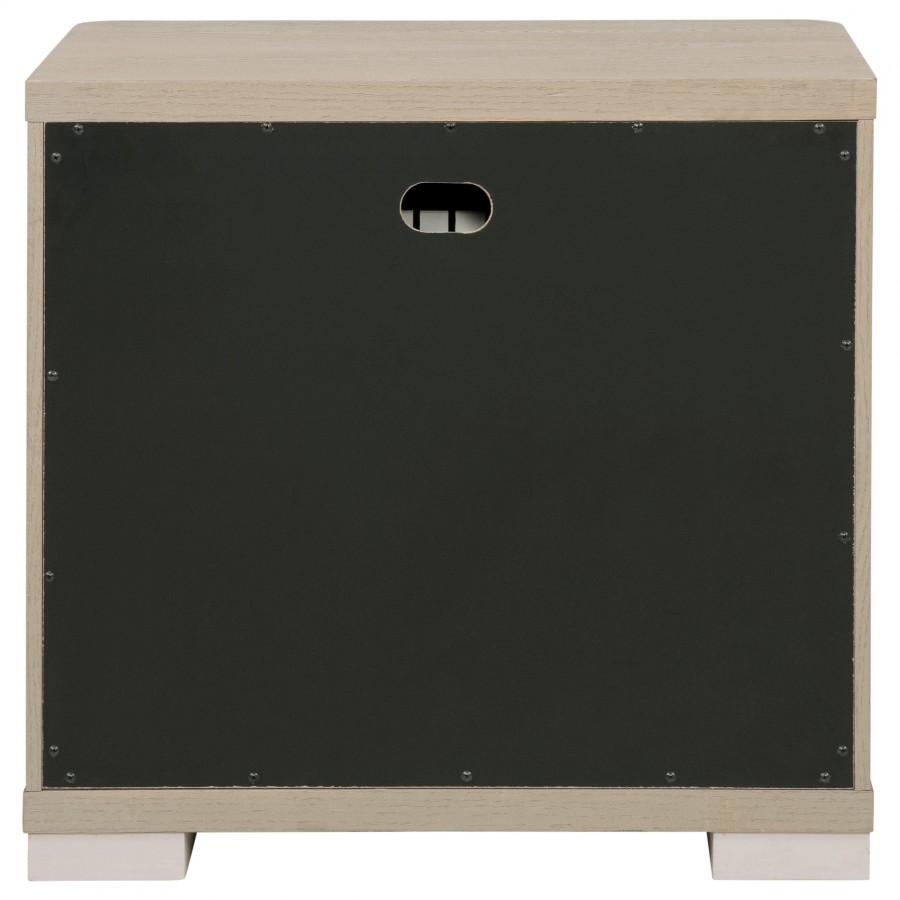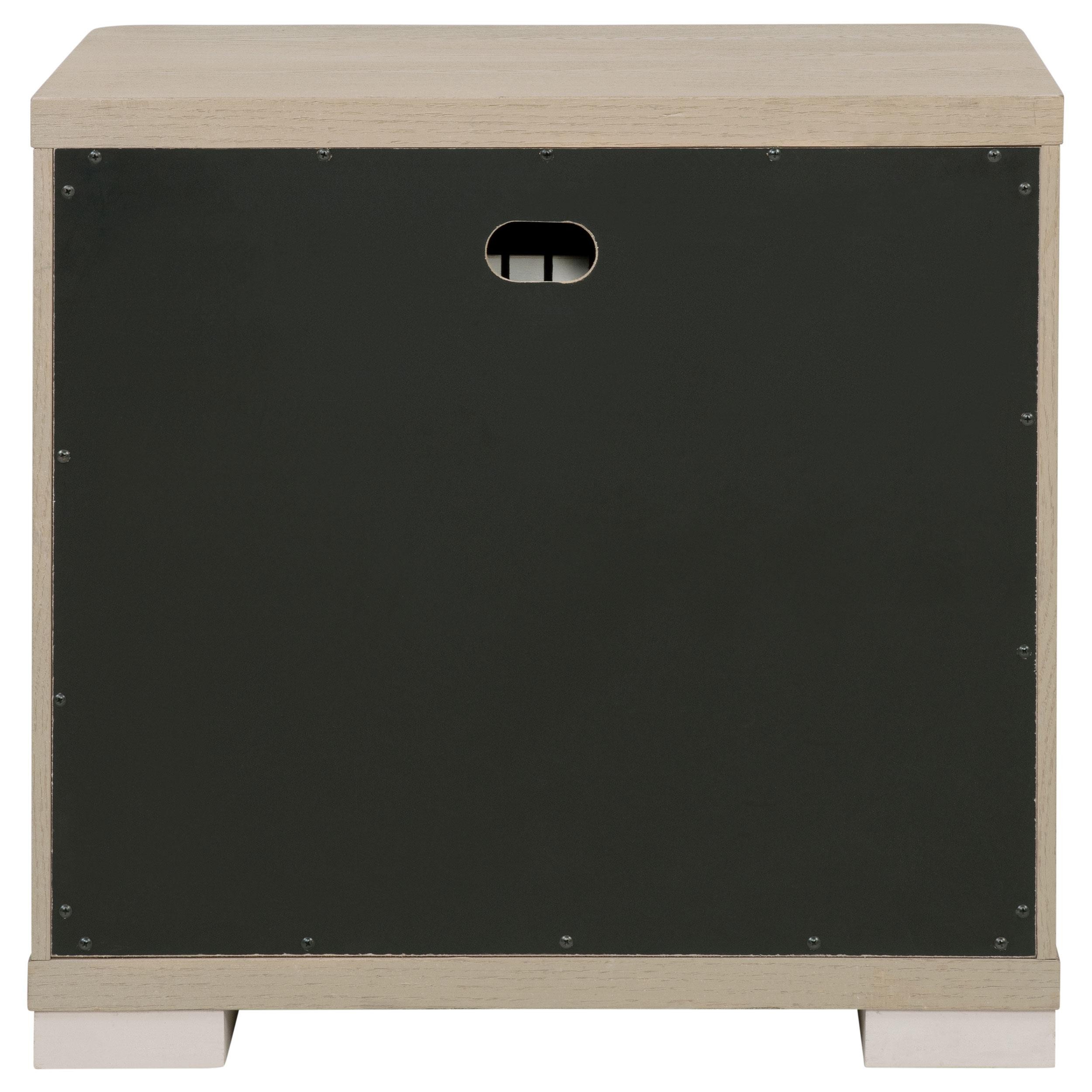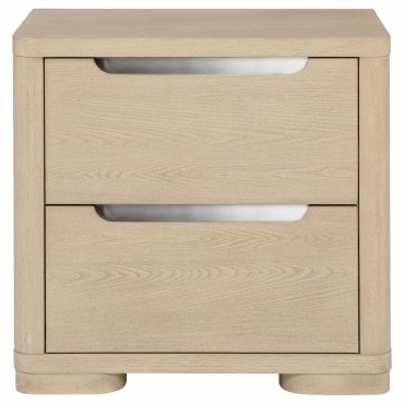 Blending sleek design with practical functionality, this nightstand features a light elm finish and brushed nickel fingertip pulls for a subtle sparkle. Rounded corners enhance its modern appeal, while two extra-large drawers offer ample space for bedside essentials. The top drawer, lined with gray felt, adds a touch of elegance. Cord management access provides convenience, making this piece perfect for modern living.
