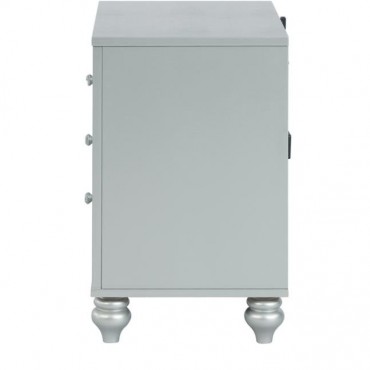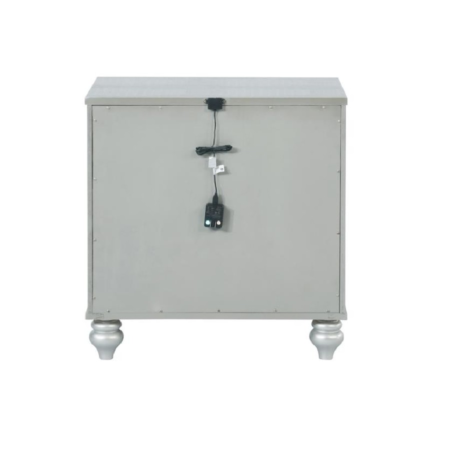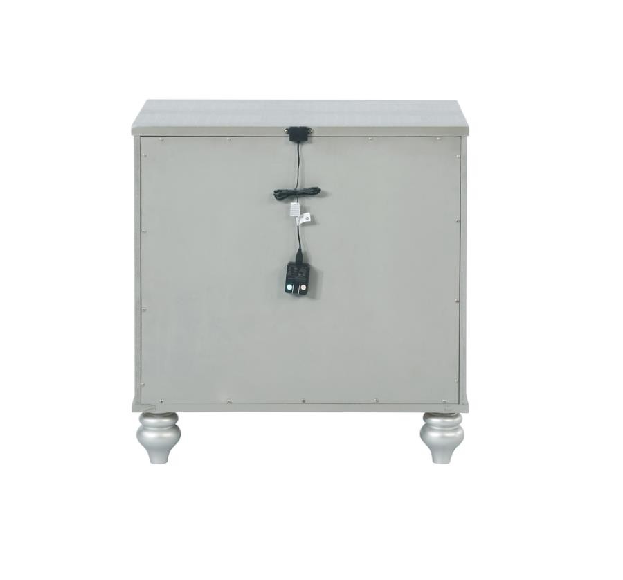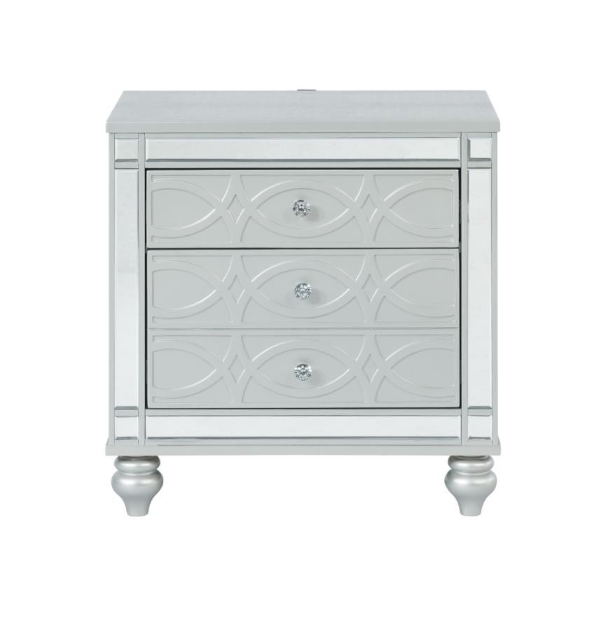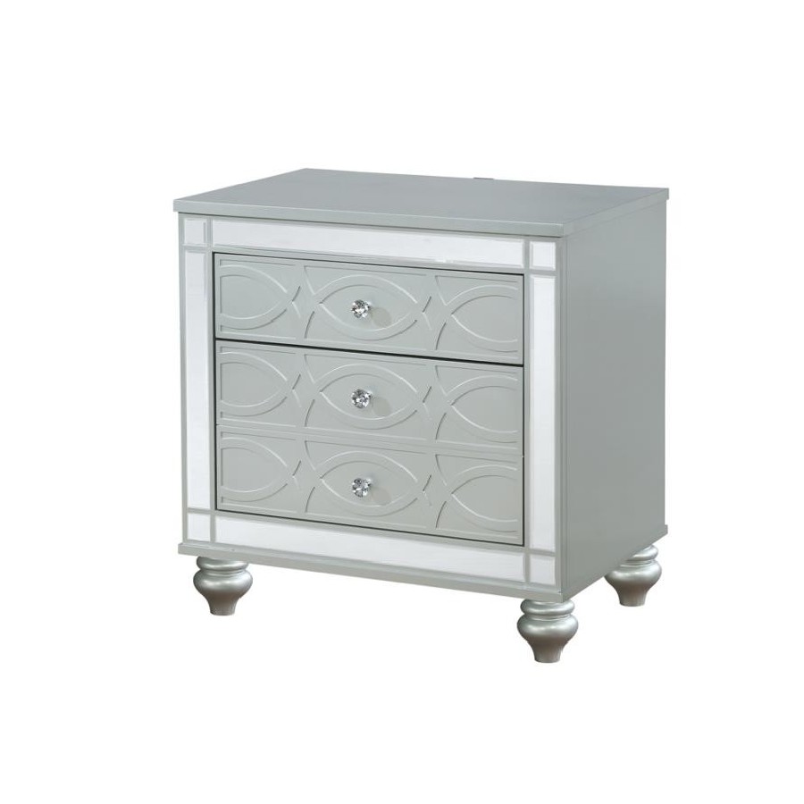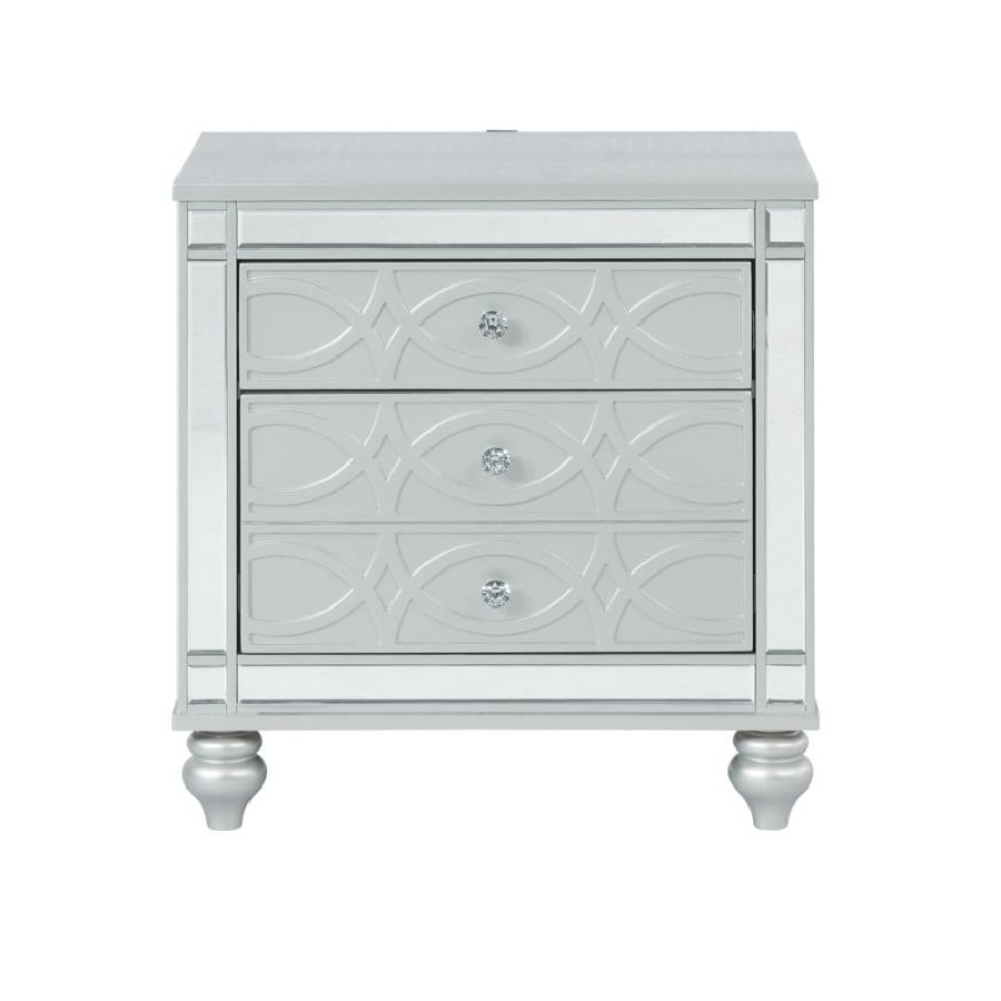 Bring modern glam to a classic design with this transitional two-drawer nightstand. It features a glitzy design that draws the eye in any modern home. It's crafted with a vibrant silver metallic finish with fret work detail on the front panels and drawer fronts. The drawers are adorned with crystal-like pulls and the top one is lined with black felt. Dual USB ports and delicate bun feet complete the design of this exquisite accent piece.