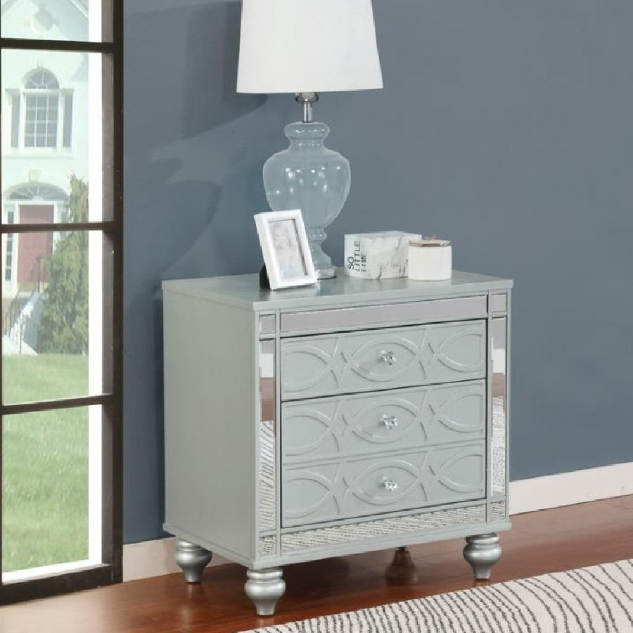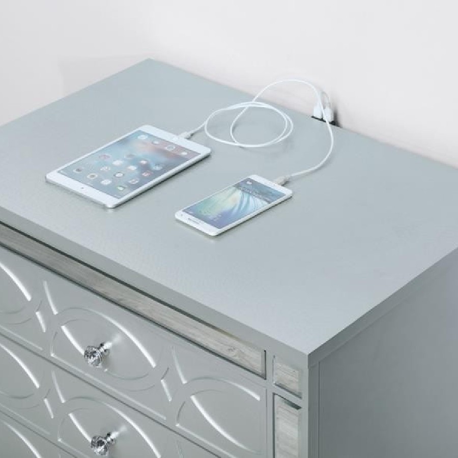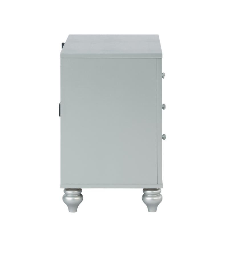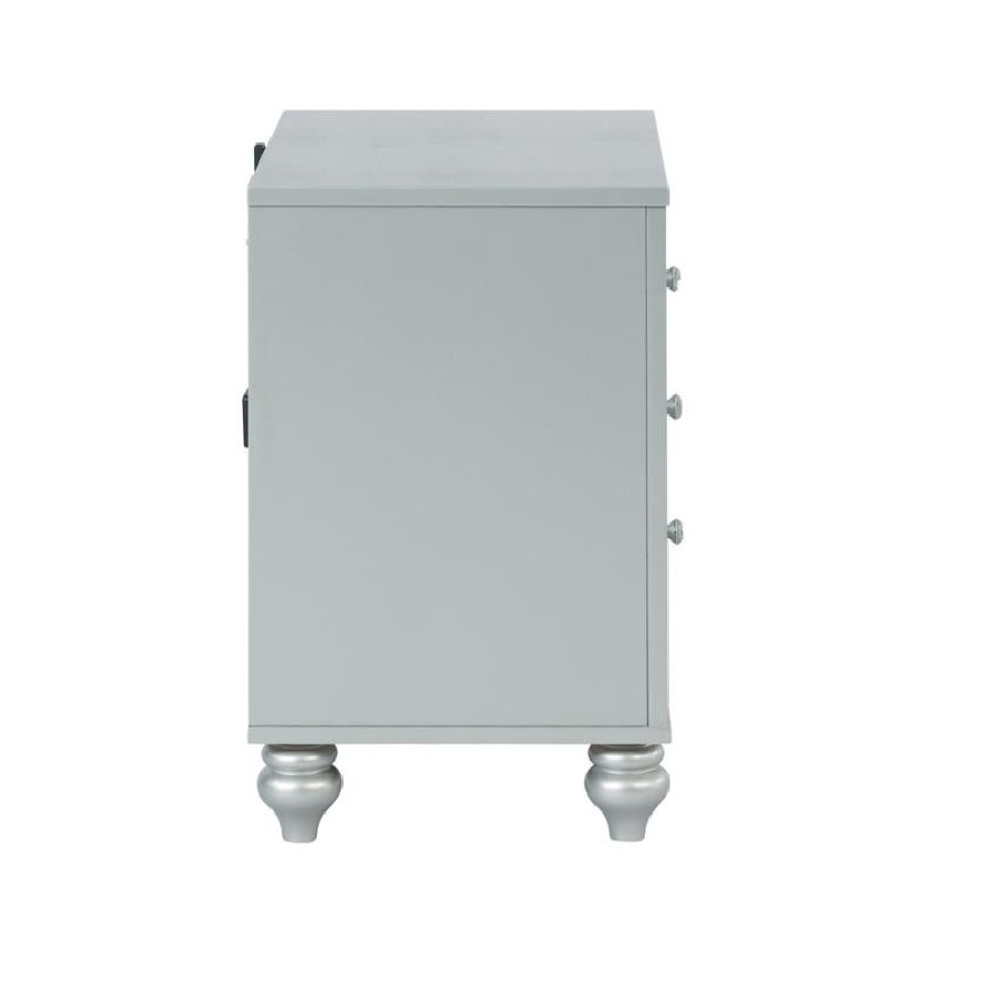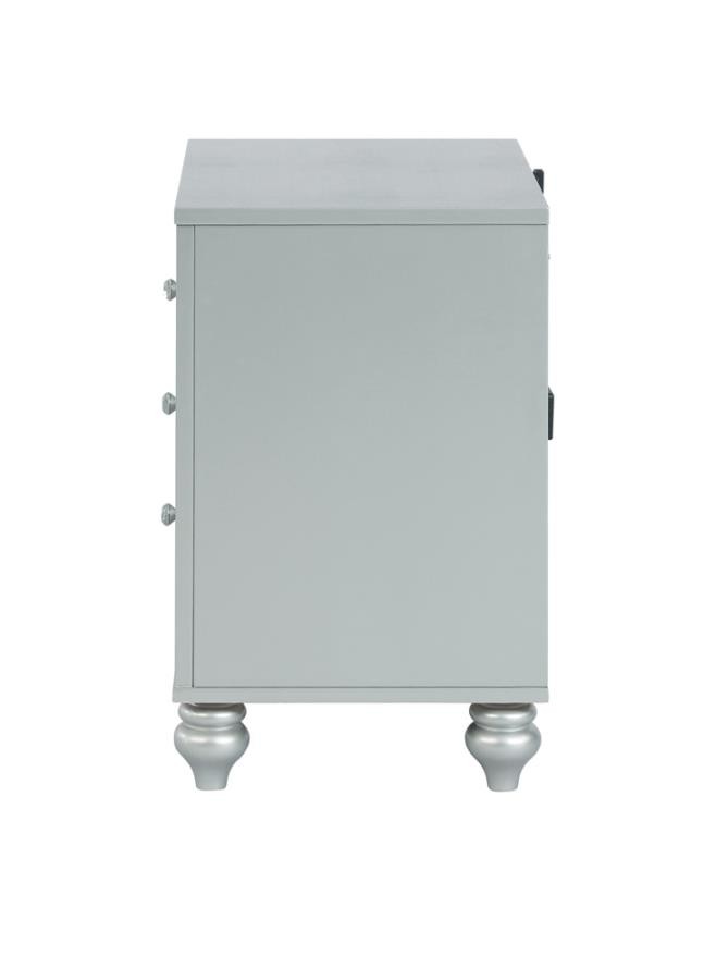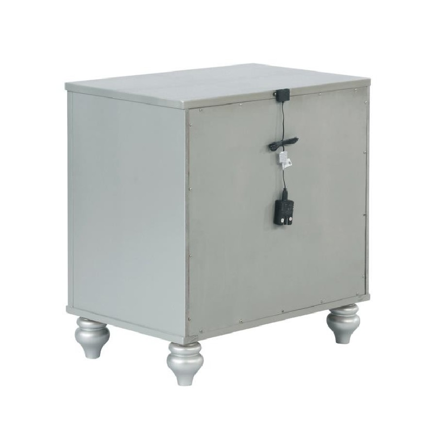 Bring modern glam to a classic design with this transitional two-drawer nightstand. It features a glitzy design that draws the eye in any modern home. It's crafted with a vibrant silver metallic finish with fret work detail on the front panels and drawer fronts. The drawers are adorned with crystal-like pulls and the top one is lined with black felt. Dual USB ports and delicate bun feet complete the design of this exquisite accent piece.