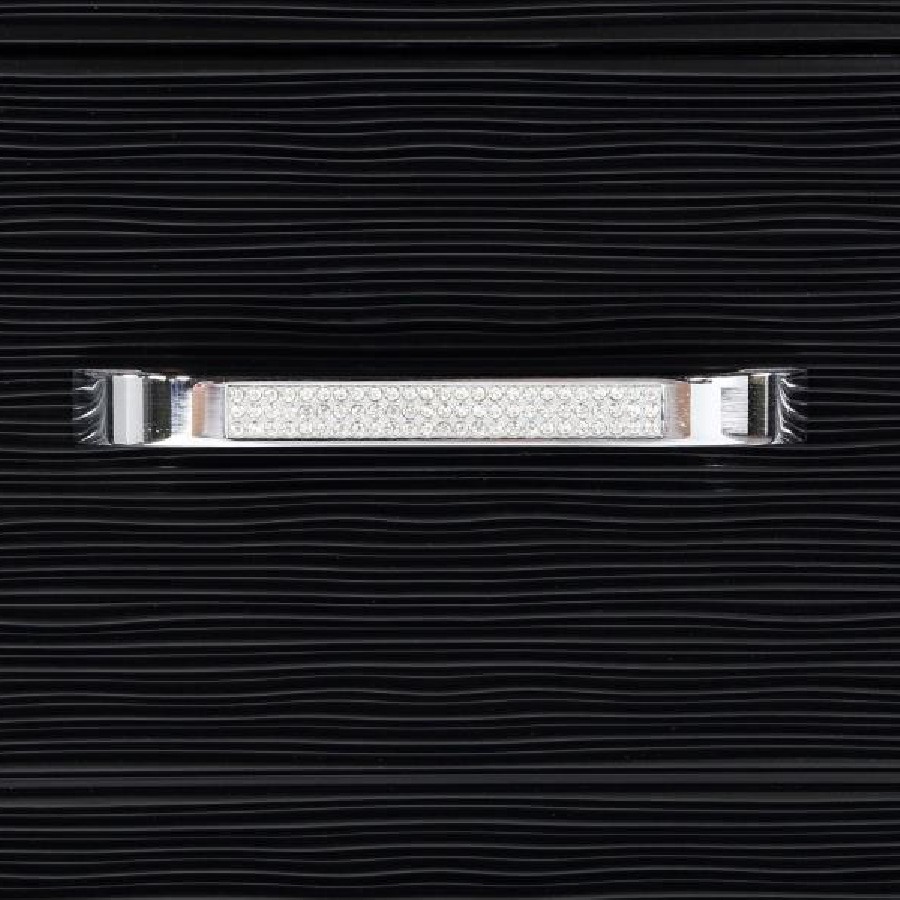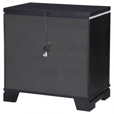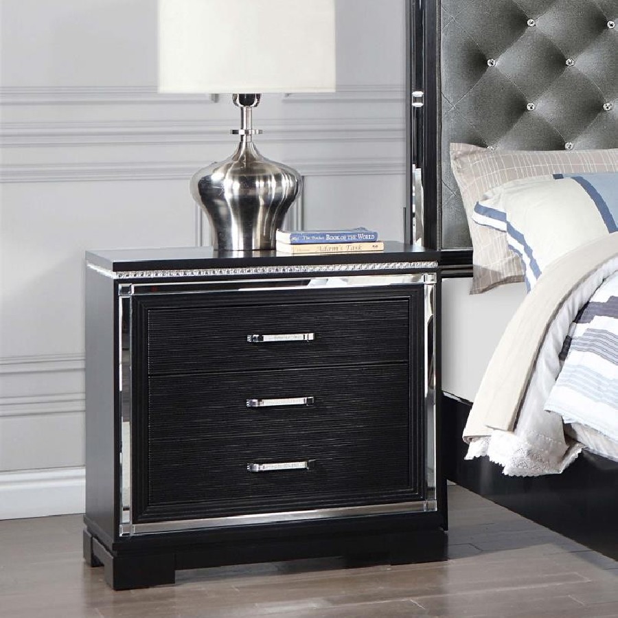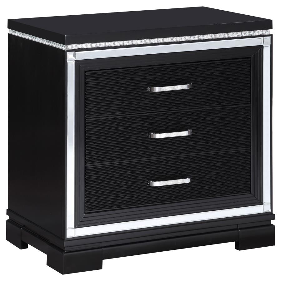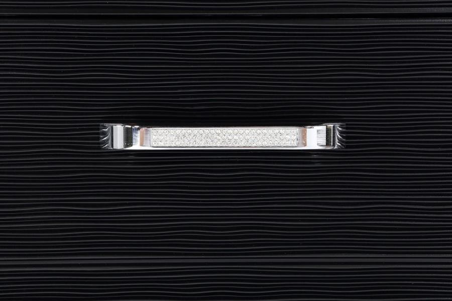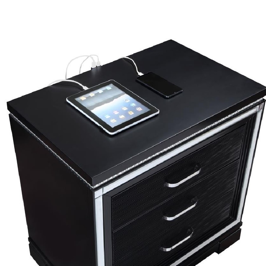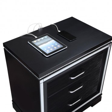 Bold, dramatic hues set the stage for clean lines and luxe details in this glam nightstand. Glimmering accents such as polished mirror trim create a border around the stacked drawers, capped with corner mirror tiles. A dark black finish offsets the polished and sparkling accents, while offering modern sensibilities like USB charging ports and a felt-lined top drawer for delicates. Along the drawer fronts is a wood grain surface that adds a hint of texture. Along the tabletop surface is a crystal-like border, mirrored also in the sleek hardware pulls.