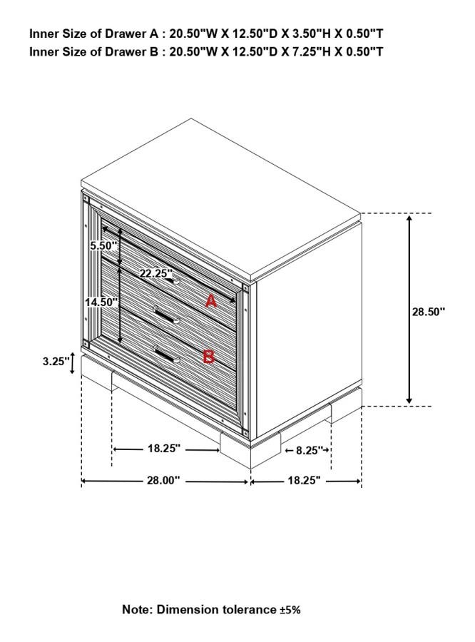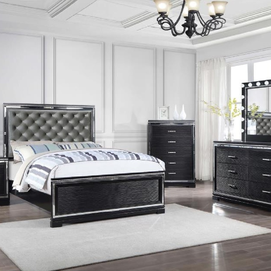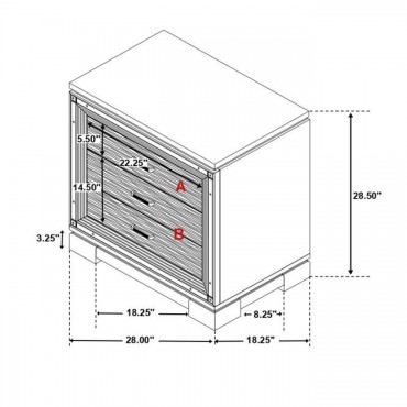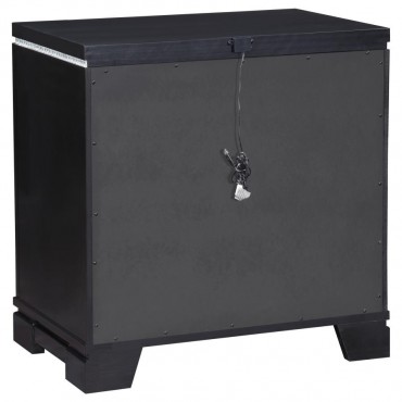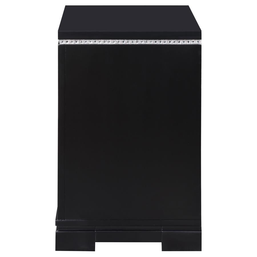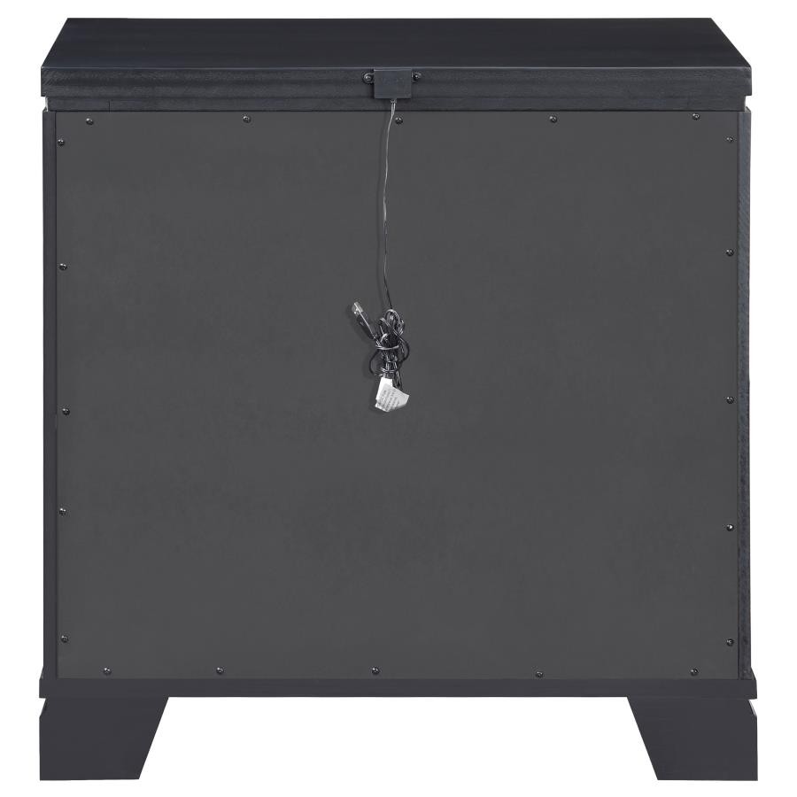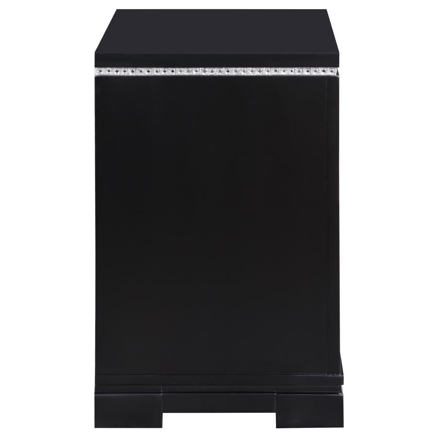 Bold, dramatic hues set the stage for clean lines and luxe details in this glam nightstand. Glimmering accents such as polished mirror trim create a border around the stacked drawers, capped with corner mirror tiles. A dark black finish offsets the polished and sparkling accents, while offering modern sensibilities like USB charging ports and a felt-lined top drawer for delicates. Along the drawer fronts is a wood grain surface that adds a hint of texture. Along the tabletop surface is a crystal-like border, mirrored also in the sleek hardware pulls.