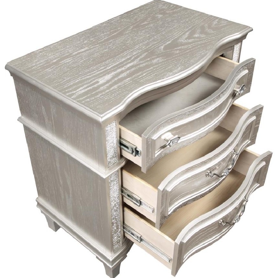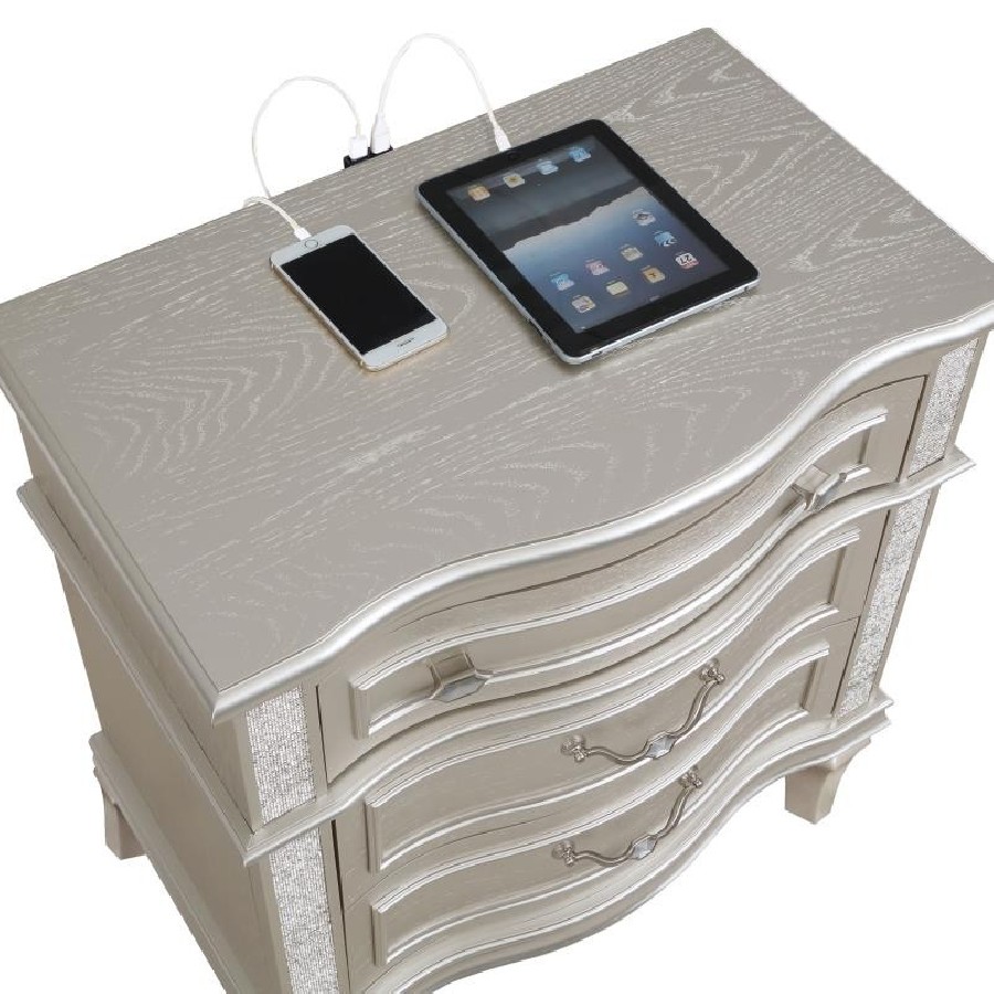 Keep all your bedroom essentials and wardrobe items neatly organized with this glam three-drawer nightstand. A contoured frame design features sparkling side panels flanking the three spacious drawers for a luxurious touch. A silver oak finished wood frame is accented further by modern glam metal knobs and bail handles that help slide each drawer with ease. A soft grey felt-lined top drawer invites you to store more delicate items. A hidden USB outlet creates a convenient charging area for handheld devices.