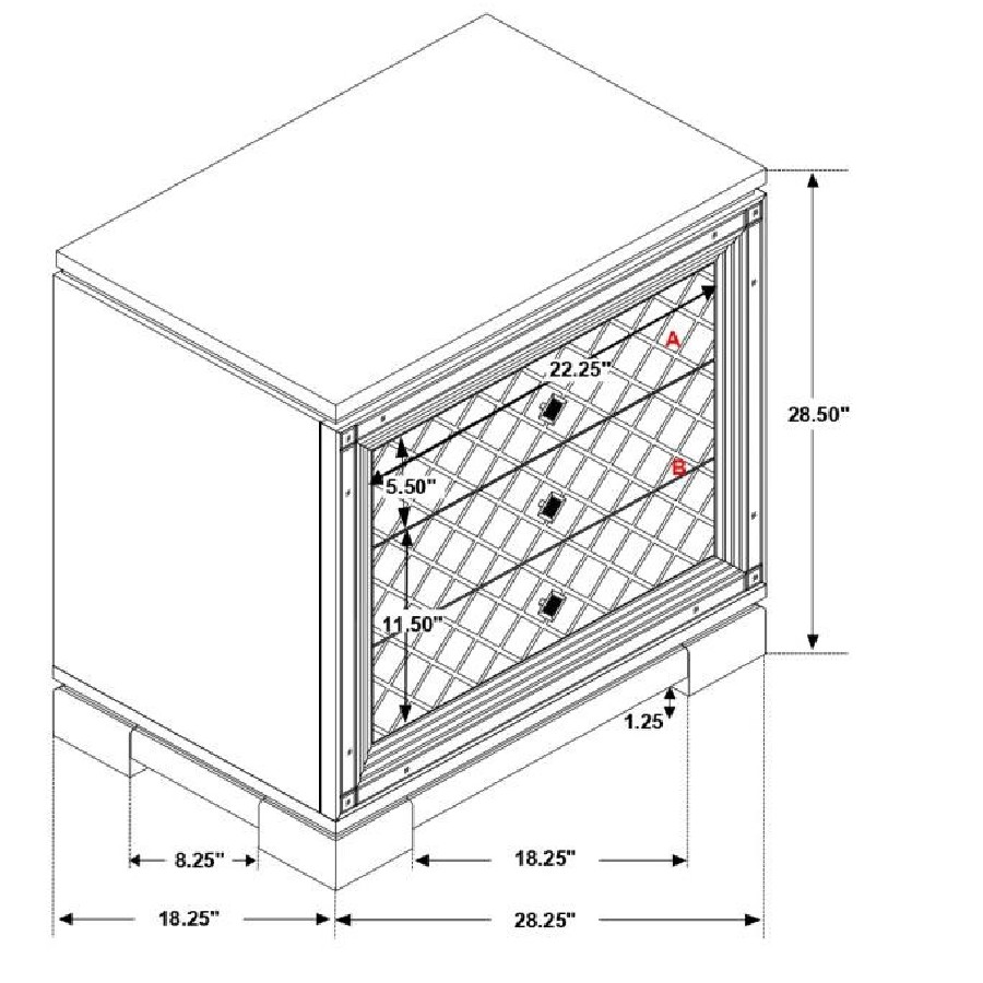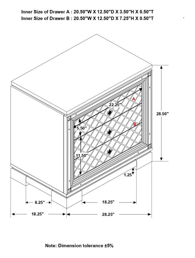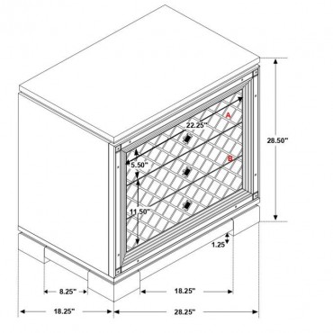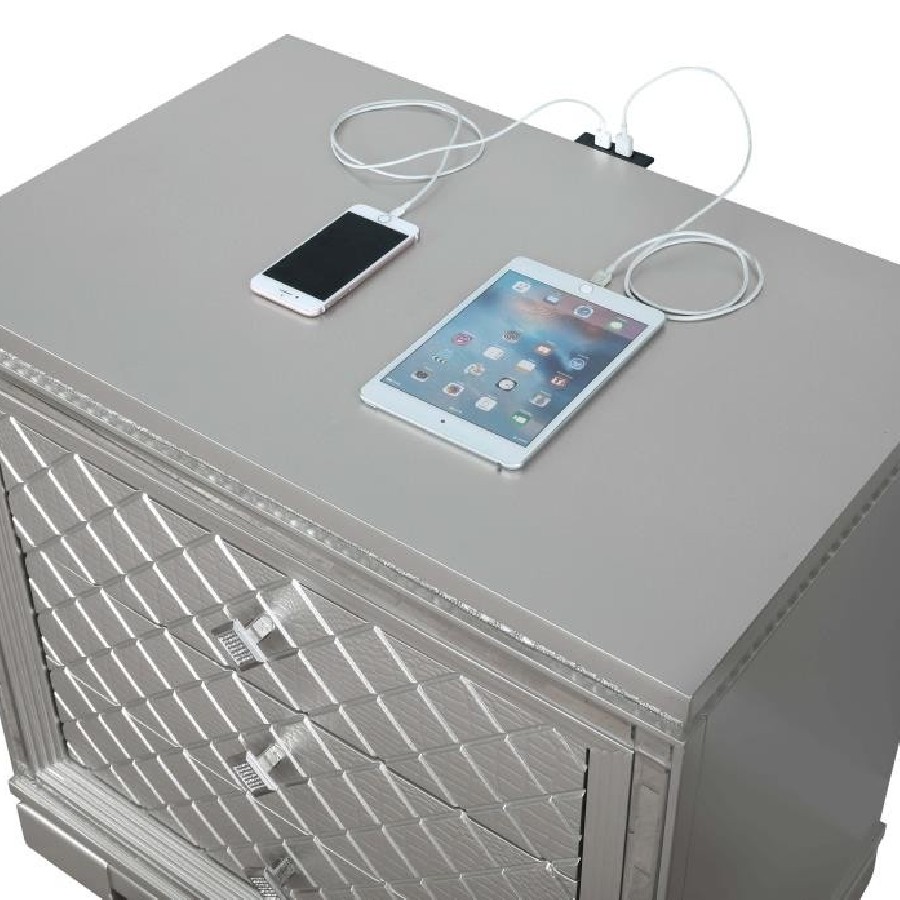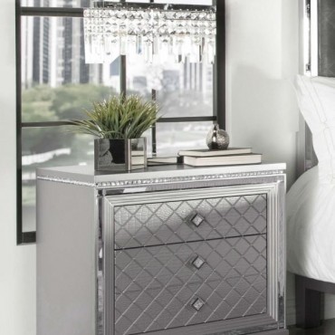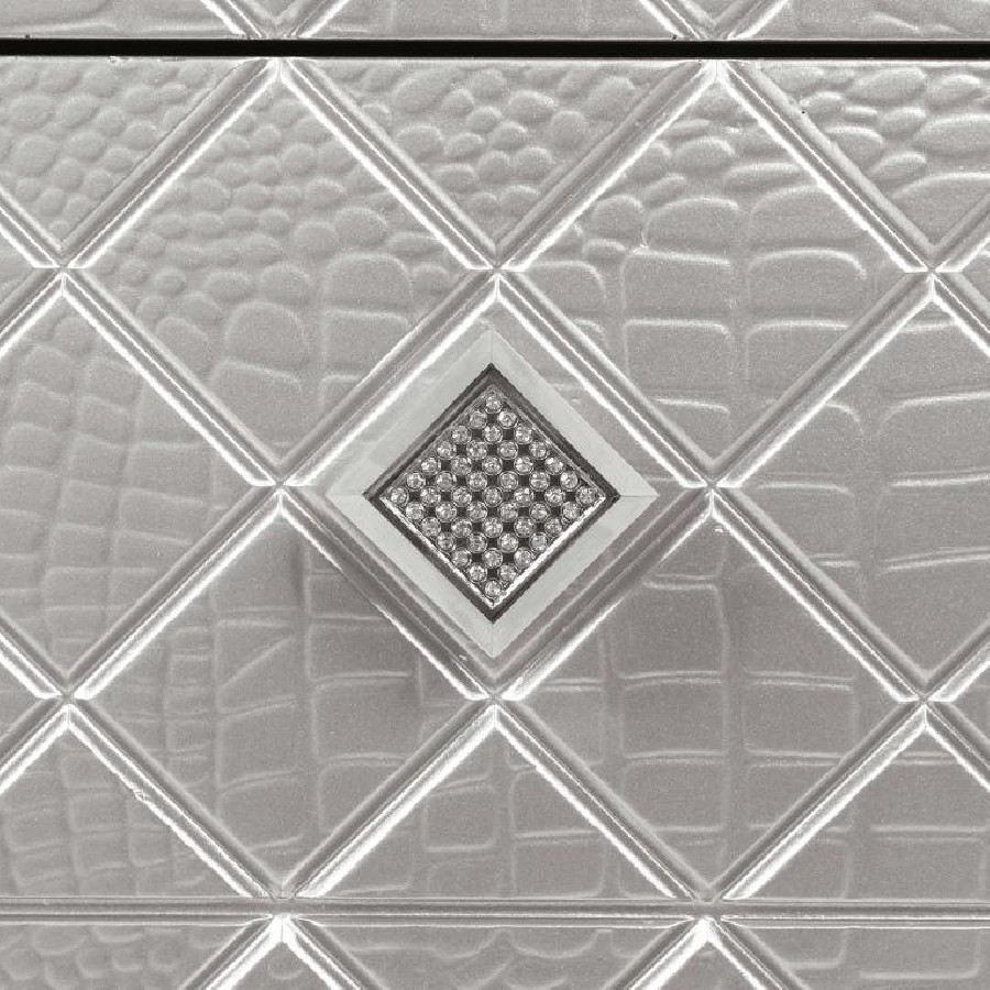 Clean lines and luxe details shine through in this two-drawer nightstand from the Eleanor bedroom set. Sparkling accents like a reflective mirror trim outlining the set of drawers and square knobs encrusted with diamond-like accents create a regal display against a bed. This glam nightstand opens itself up to whatever color palette you prefer and offers hidden extras like USB charging ports and a felt-lined top drawer for delicate accessories and jewelry. Lending to the understated white finish is textured drawer fronts embossed in a wild crocodile and diamond pattern. Along the top just below the tabletop surface is a slim crystal-like molding that completes the piece and mirrors the hardware.
