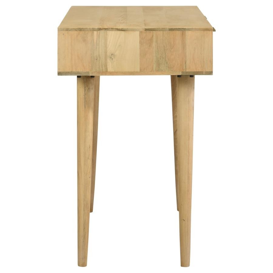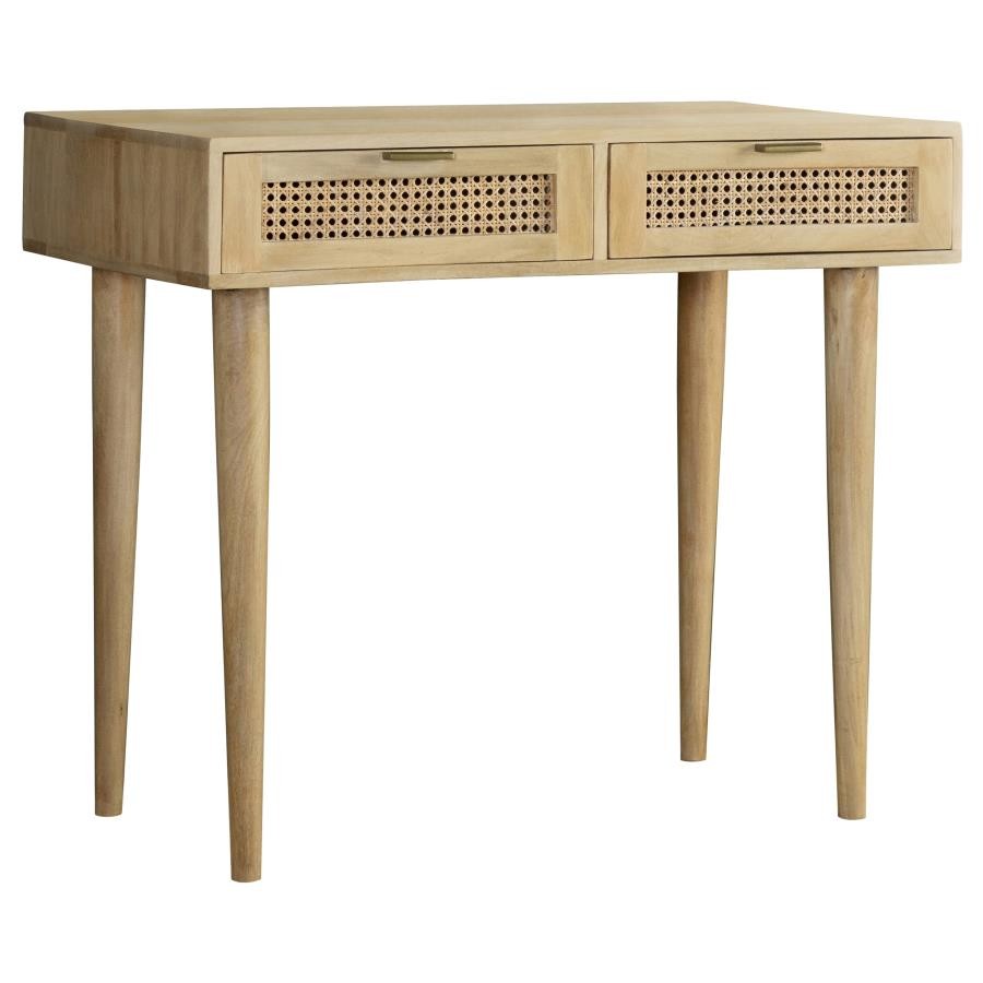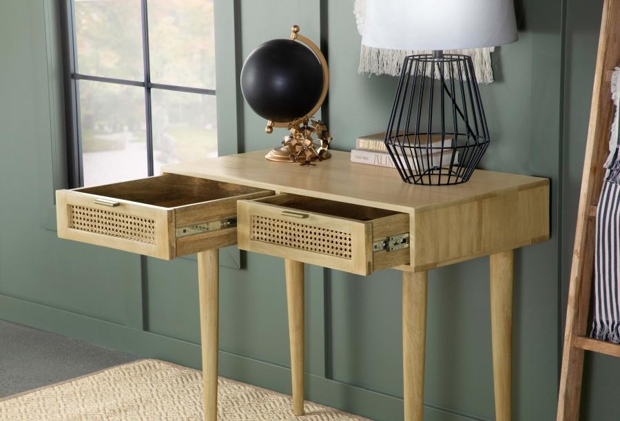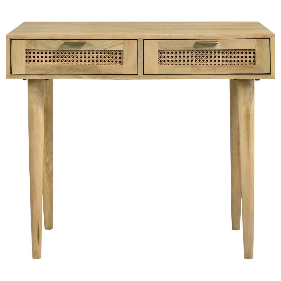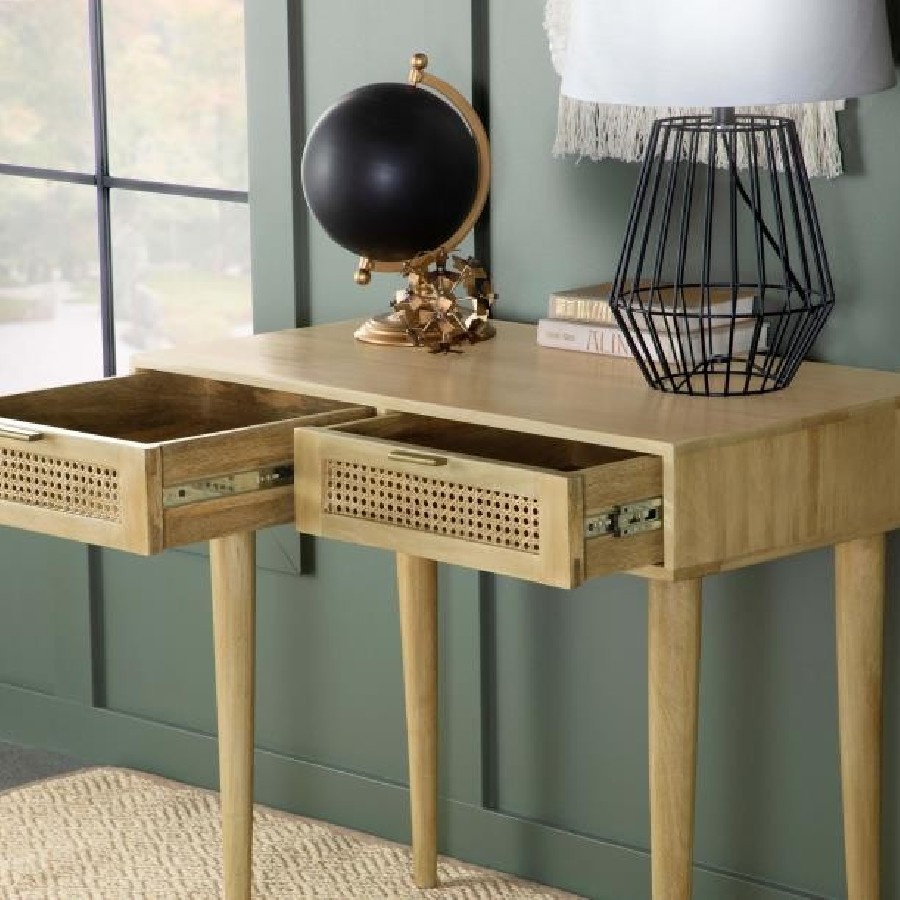 Place this console table in a multipurpose living room, guestroom or entryway foyer for a place to keep all your stationery and essentials. A spacious rectangular tabletop rests on slender tapered legs, lending a graceful look to this global-inspired furniture piece. Two drawers invite you to store items out of sight for a clutter-free home, each with vintage-inspired woven cane front panels and slim hardware in a shiny antique brass finish. Built entirely of mango wood, this mid-century style writing desk offers an eco-friendly touch and a natural finish that brings forth the mango wood woodgrain patterns. Keep this table in a bedroom as a study space too.