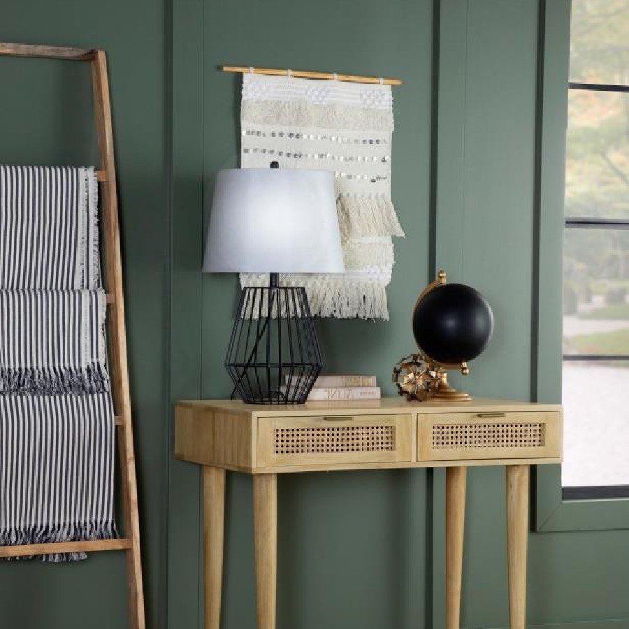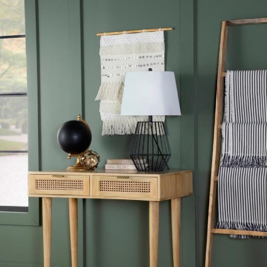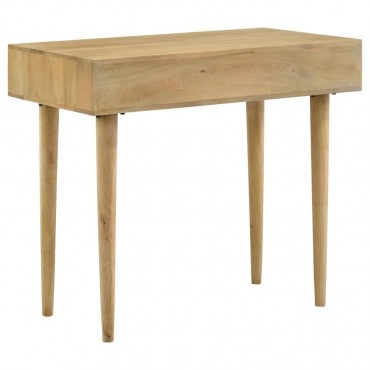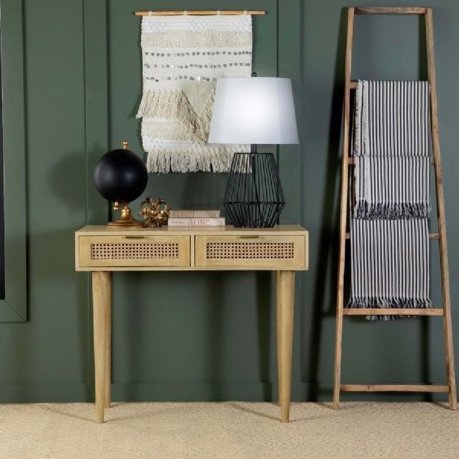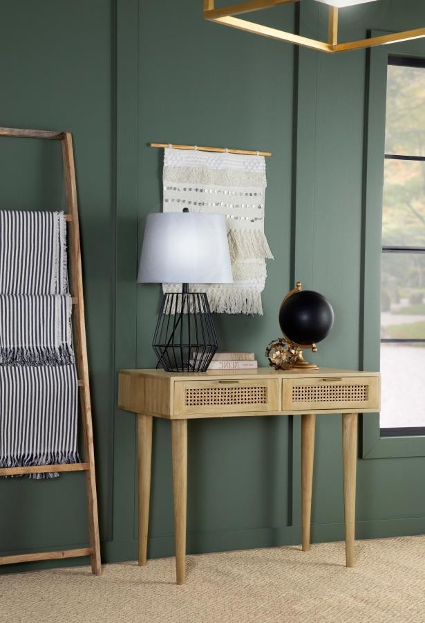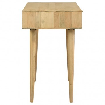 Place this console table in a multipurpose living room, guestroom or entryway foyer for a place to keep all your stationery and essentials. A spacious rectangular tabletop rests on slender tapered legs, lending a graceful look to this global-inspired furniture piece. Two drawers invite you to store items out of sight for a clutter-free home, each with vintage-inspired woven cane front panels and slim hardware in a shiny antique brass finish. Built entirely of mango wood, this mid-century style writing desk offers an eco-friendly touch and a natural finish that brings forth the mango wood woodgrain patterns. Keep this table in a bedroom as a study space too.