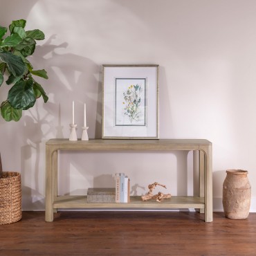 Elegant in proportion and effortless in form, this console table brings sculptural ease to any space. Its elongated shape rests on curved legs, with a wide lower shelf for balance and function. Whether used as a sofa table or entryway accent, it offers timeless utility. Crafted from mahogany, engineered wood, and mango veneer, its warm texture and durability make it a versatile addition to your home.